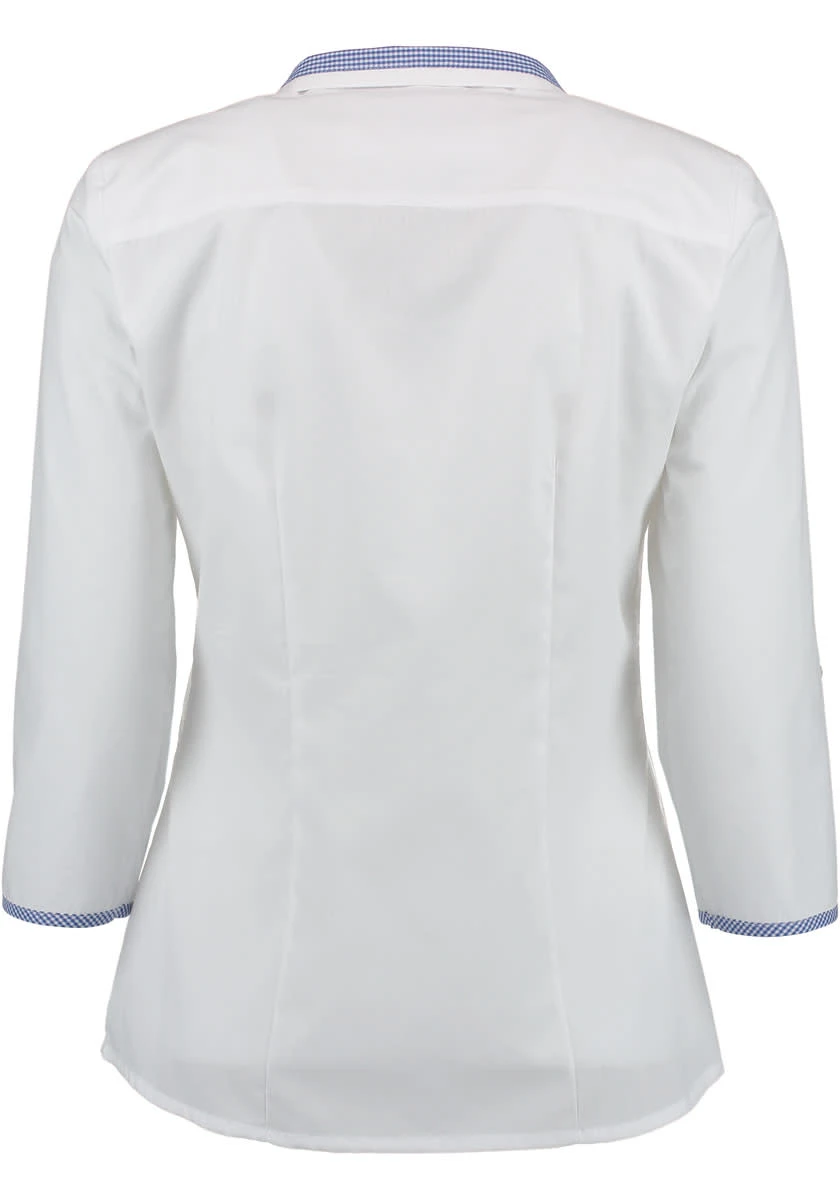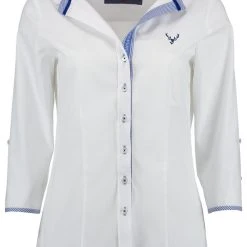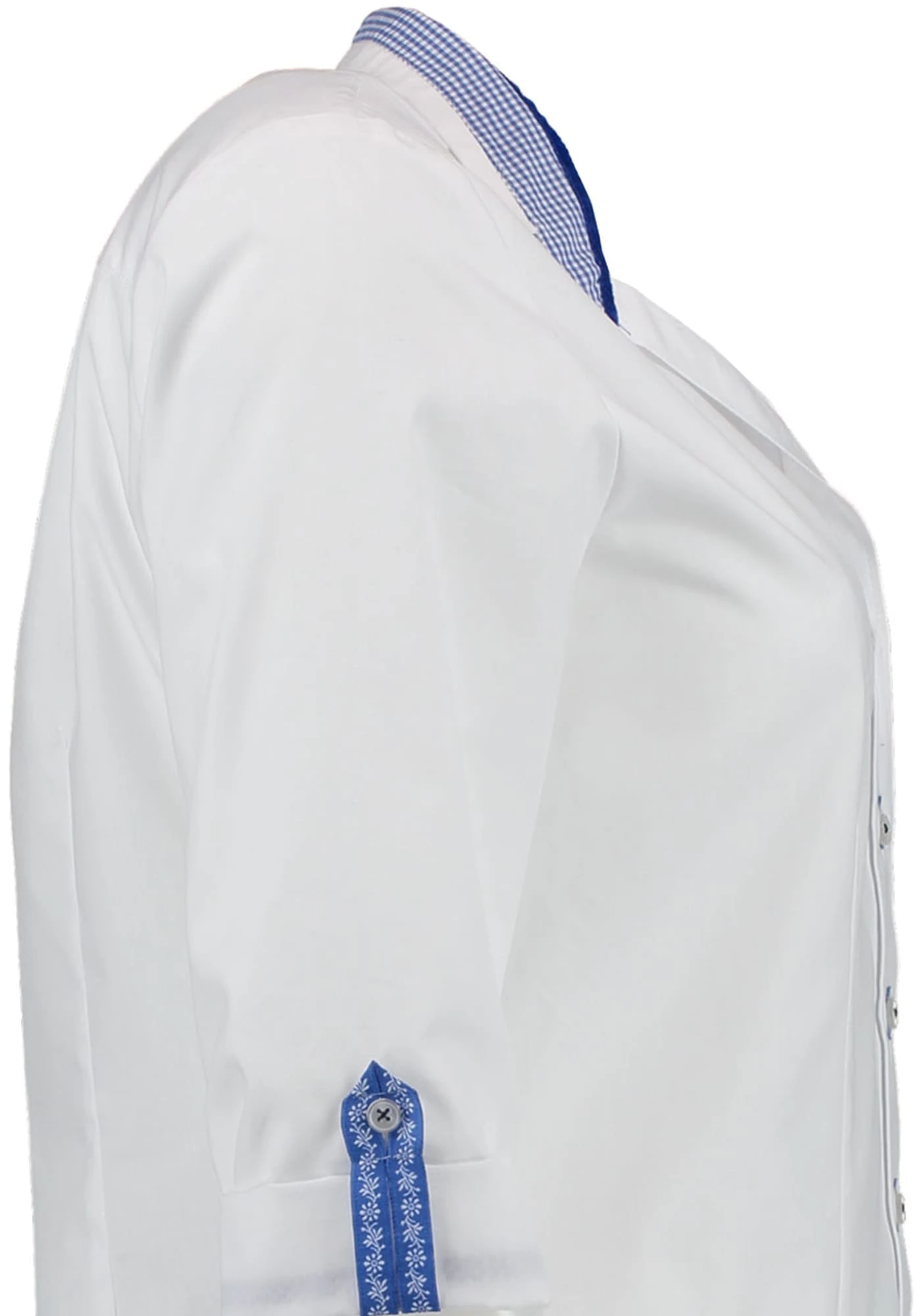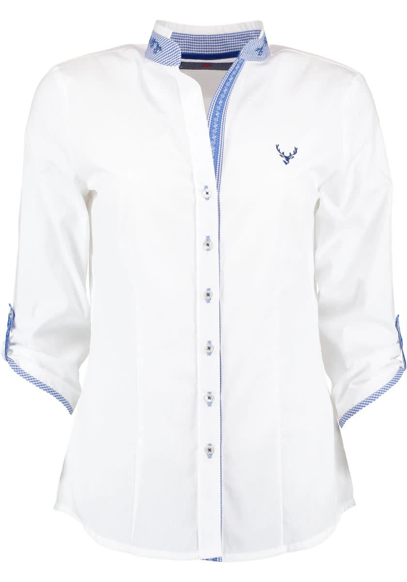 Perfekt kombiniert zu Jeans und Strickjacke: die weiße Bluse mit blauen Kontrasten von OS Trachten. Sehr feminin geschnitten mit Stehkragen, Knöpfen in Hirschhorn-Optik und 7/8-Ärmeln, die Sie nach Belieben hochkrempeln können. Mischung mit 80 Prozent Baumwolle. Tailliert geschnitten. Macht von Größe 32 bis 58 eine gute Figur.