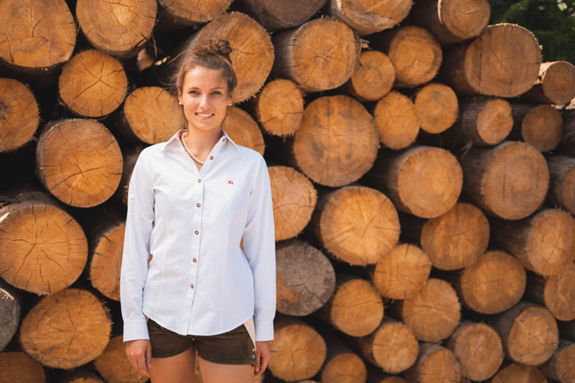 OS-Trachtenbluse aus einem richtig feinen Satinstoff. Der edle Glanz verleiht diesem Stück eine tolle festliche Optik. Die Ziersteppungen am Kragen und den Manschetten machen sie jung und modern. Täuschend echt immitierte Hirschhornknöpfe und der dynamische Hirschstick fügen sich in jedes Trachten-Outfit prefekt ein.