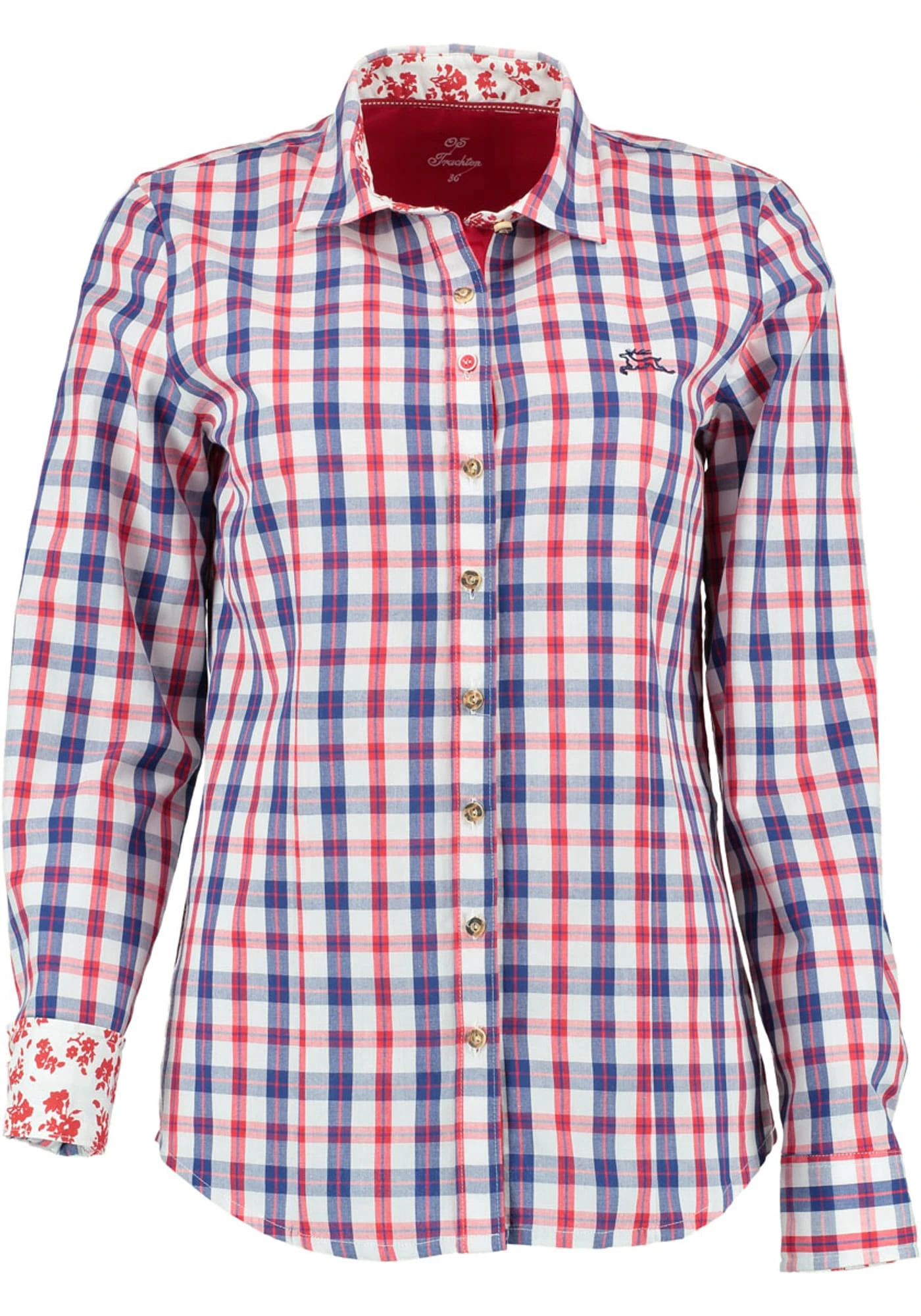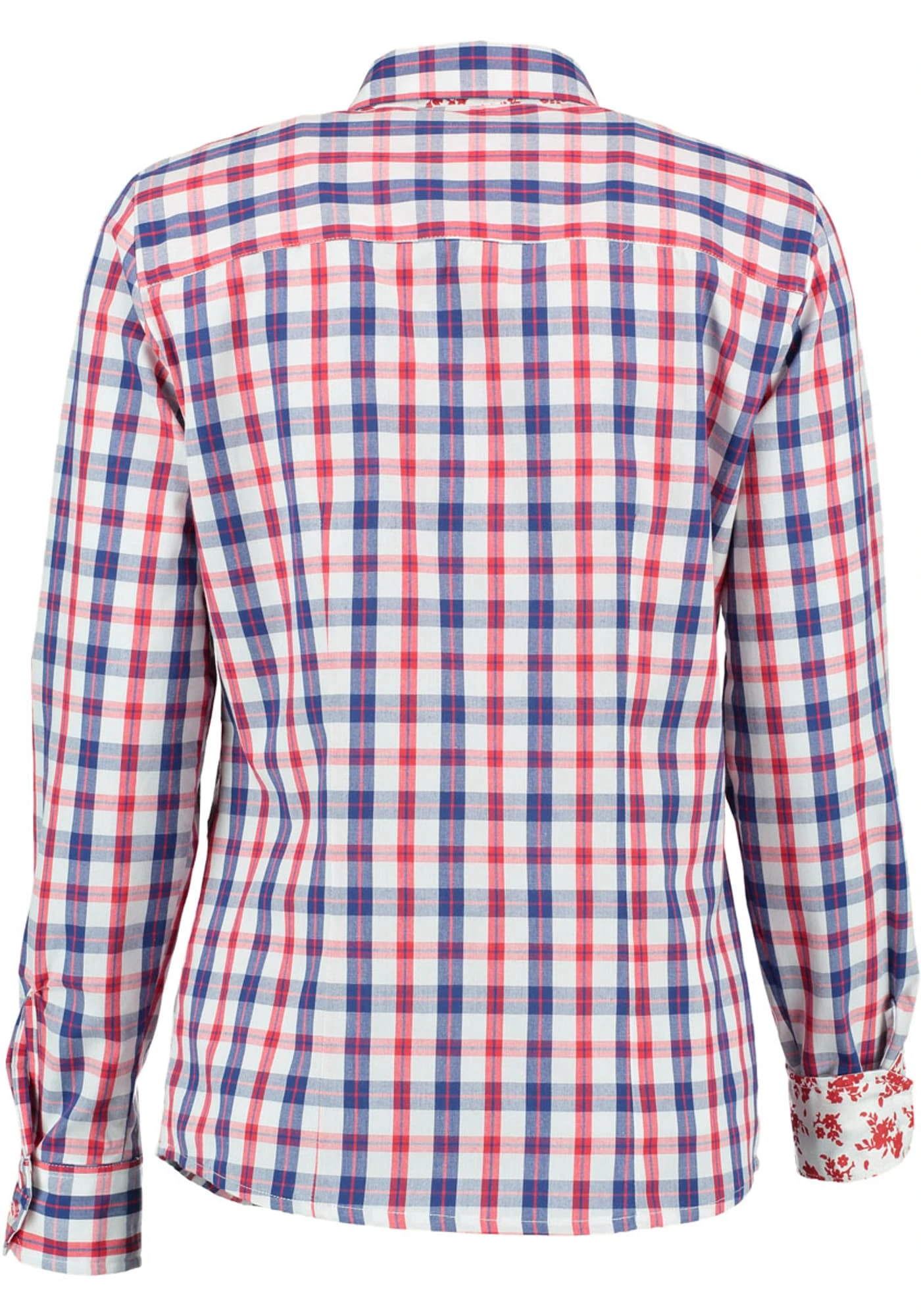 Karobluse der Marke “OS Trachten”. Das sportliche, junge Karo macht die Baumwollbluse vielfältig einsetzbar. Hier wurden Hirschhornimitatknöpfe mit farbigen Modeknöpfen kombiniert. Dezente Hirschstickerei auf dem linken Vorderteil. Der Kontraststoff im Kragenbereich kennzeichnet die hochwertige Verarbeitung.