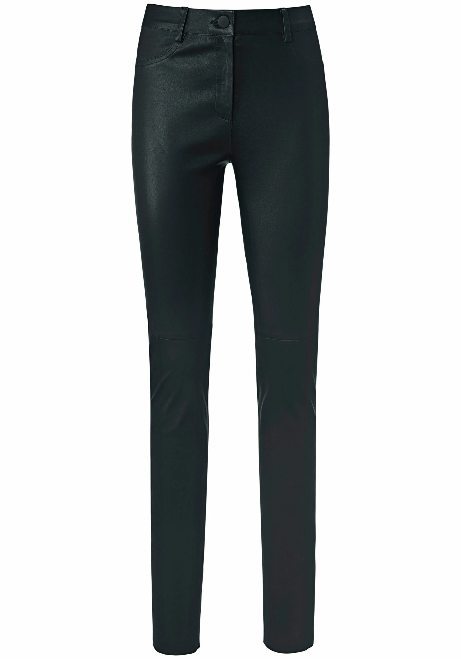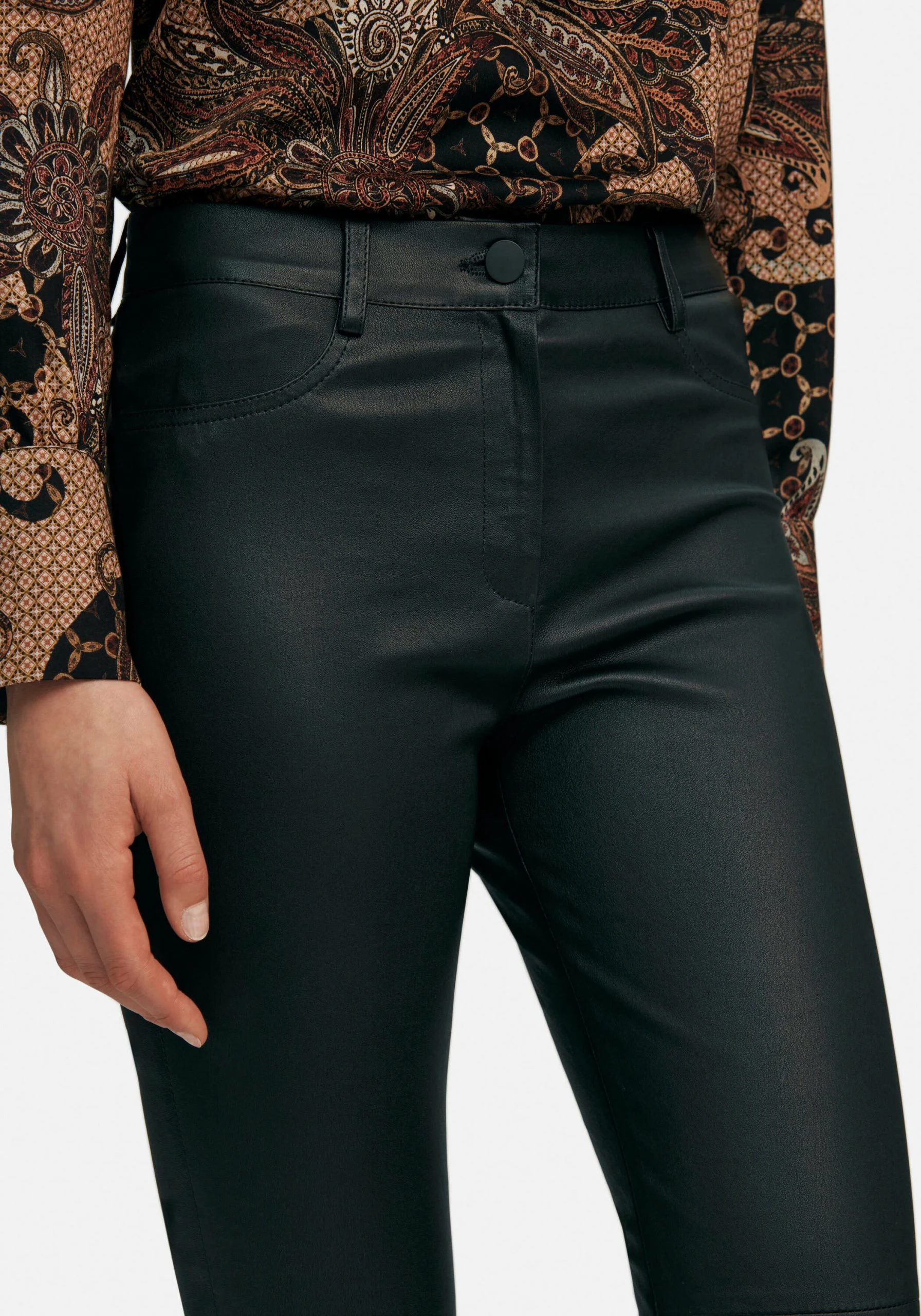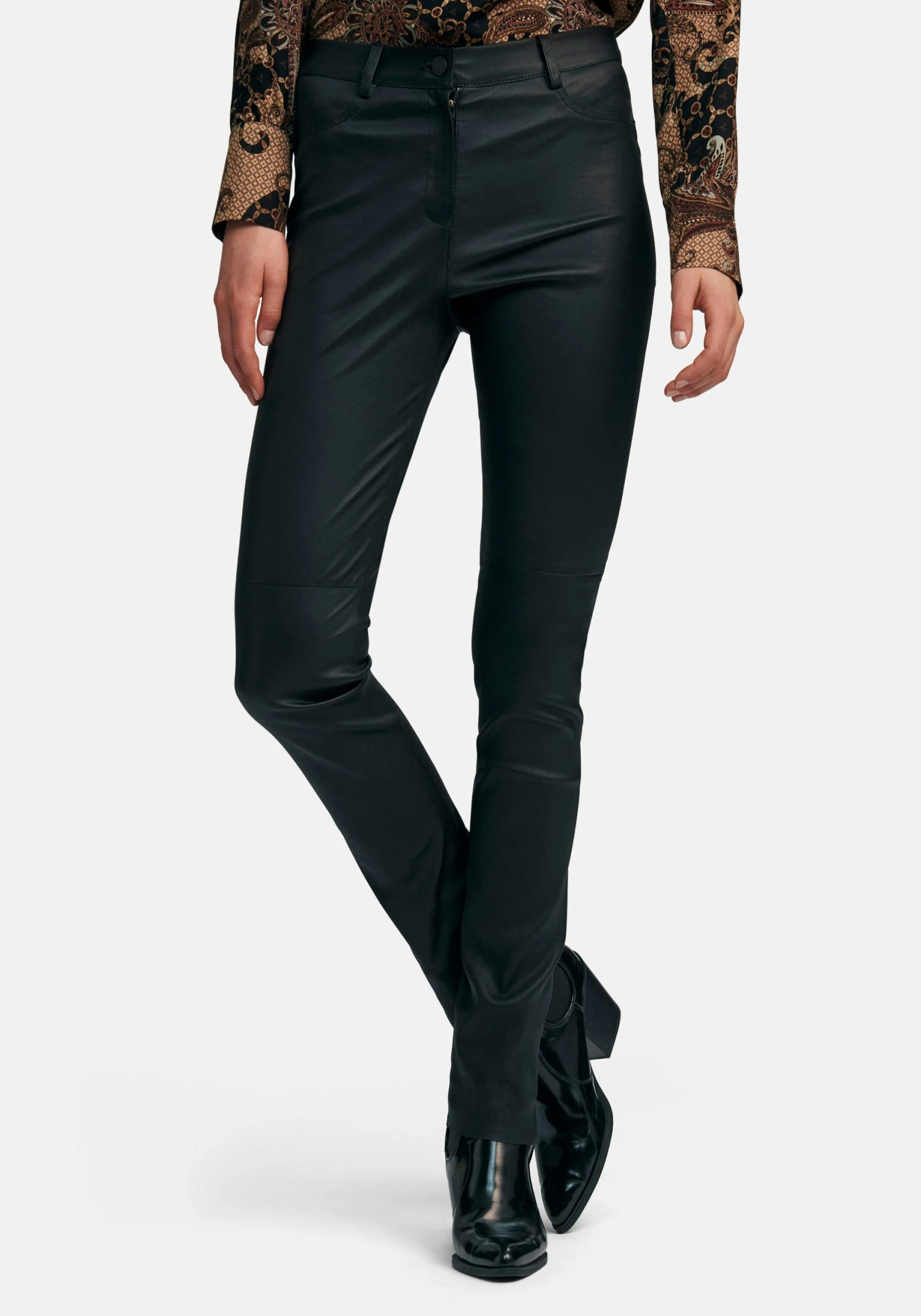 Lederhose von PETER HAHN in der Passform SYLVIA. 4-Pocket-Schnitt mit schlankem Oberschenkel und mehr Taillenweite in erlesener Premiumqualität. Ein komfortables Allroundtalent mit hoher modischer Aktualität und bestem Tragekomfort. Der elastische Bund mit Knopf, Reißverschluss und Gürtelschlaufen (ohne Gürtel), der Rücksattel und die Teilungsnähte im Kniebereich sorgen für einen tollen Sitz. Mit 2 angedeuteten gerundeten Tascheneingriffen vorne und 2 aufgesetzten Taschen hinten. Außenseite echtes Leder. Innenseite in 98% Baumwolle, 2% Elasthan. 100% Leder. Länge ca. 82 cm. Fußweite ca. 33 cm. Für diese Lederhose empfehlen wir Lederspezialreinigung.