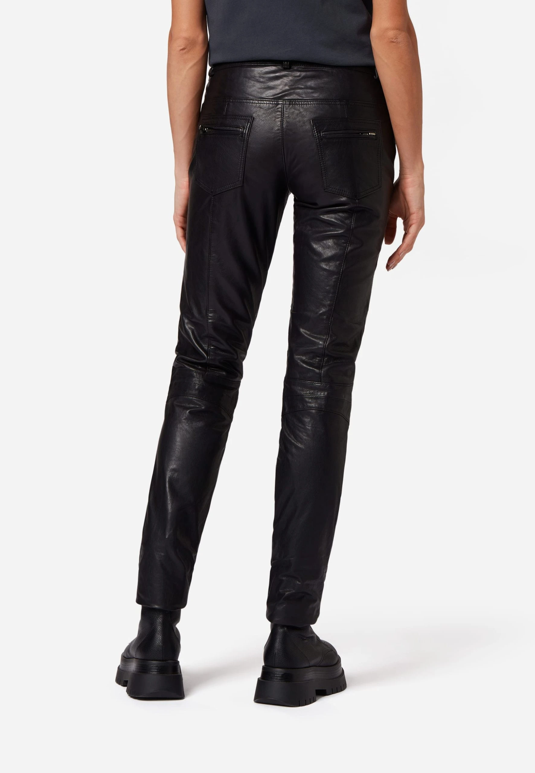 Lederhose Donna II in Schwarz für Damen von Ricano® aus Ziegen-Nappa Leder – Low Waist – auch Hüfthose genannt – Femininer und figurbetonter Slim Fit – Futter: 100% atmungsaktives Polysatin – Ganzjahresartikel – von Frühling bis Winter zu jeder Jahreszeit passend – Größenausfall: Artikel fällt eine Nummer kleiner aus – Bitte eine Nummer größer wählen als gewohnt – Italienisches Fitting. Enthält nichttextile Bestandteile tierischen Ursprungs.