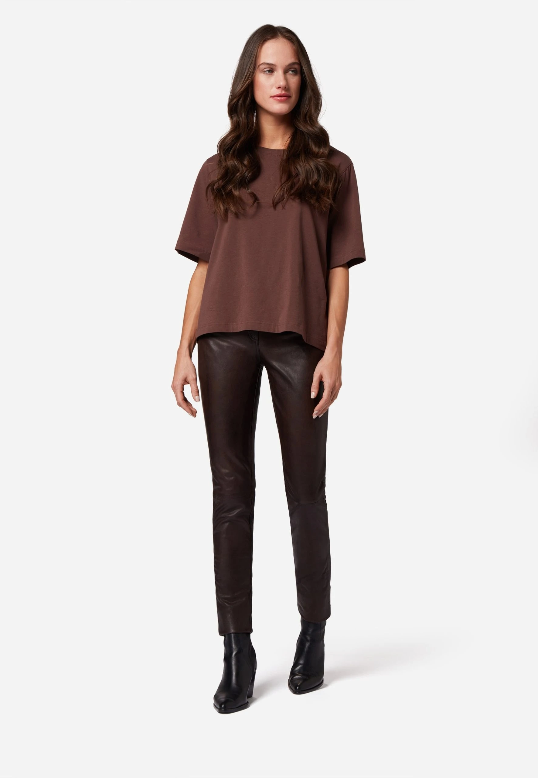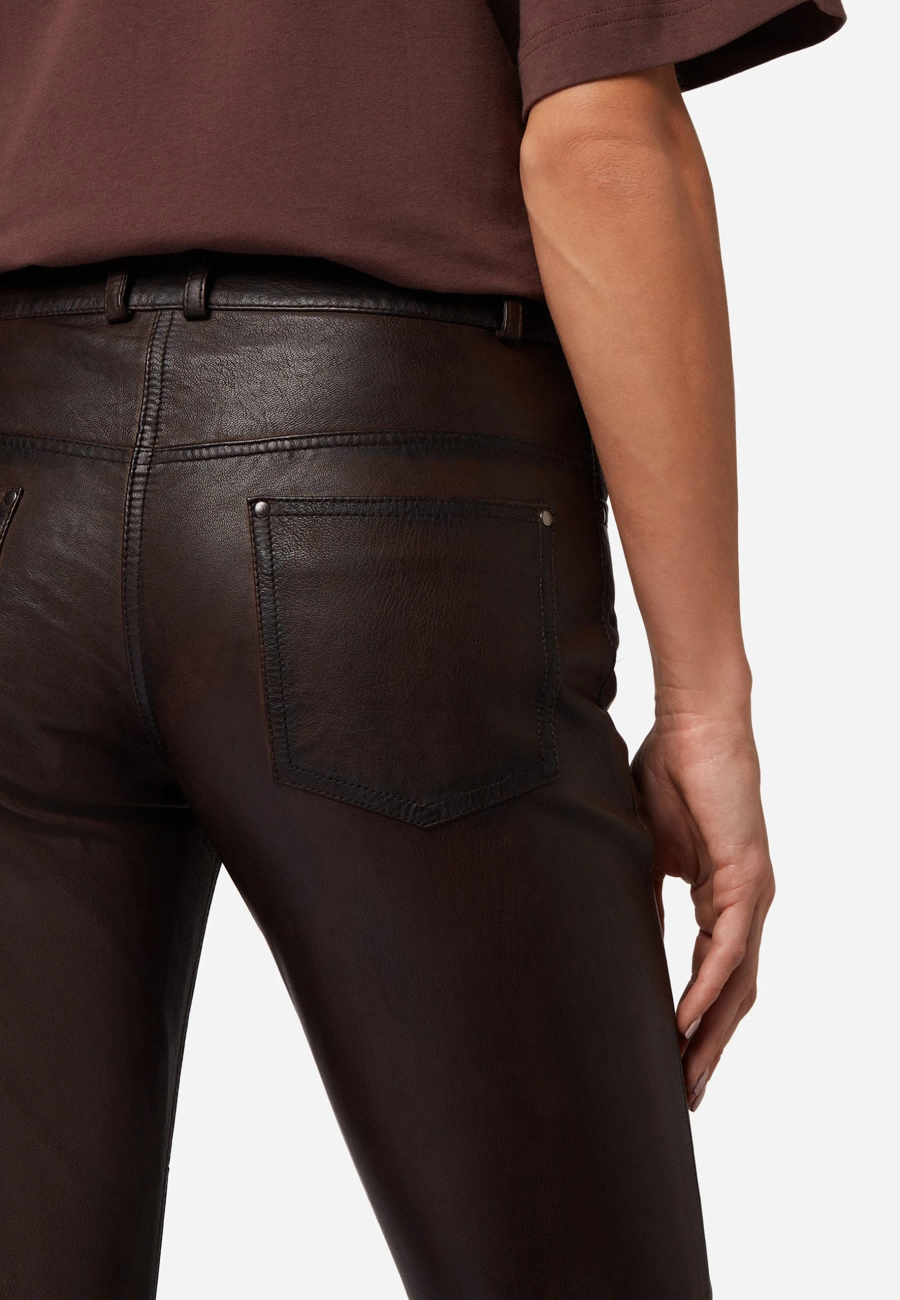 Lederhose Dorin in Braun für Damen von Ricano® aus Lamm-Nappa Leder – 5-Pocket-Stil – Low Waist – auch Hüfthose genannt – Femininer und figurbetonter Slim Fit – Futter: 100% atmungsaktives Polysatin – Ganzjahresartikel – von Frühling bis Winter zu jeder Jahreszeit passend – Größenausfall: Artikel fällt eine Nummer kleiner aus – Bitte eine Nummer größer wählen als gewohnt – Italienisches Fitting. Enthält nichttextile Bestandteile tierischen Ursprungs.