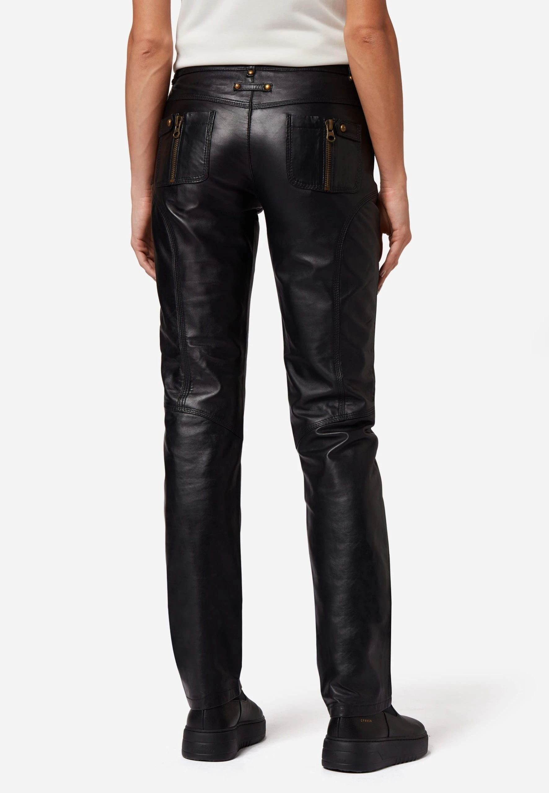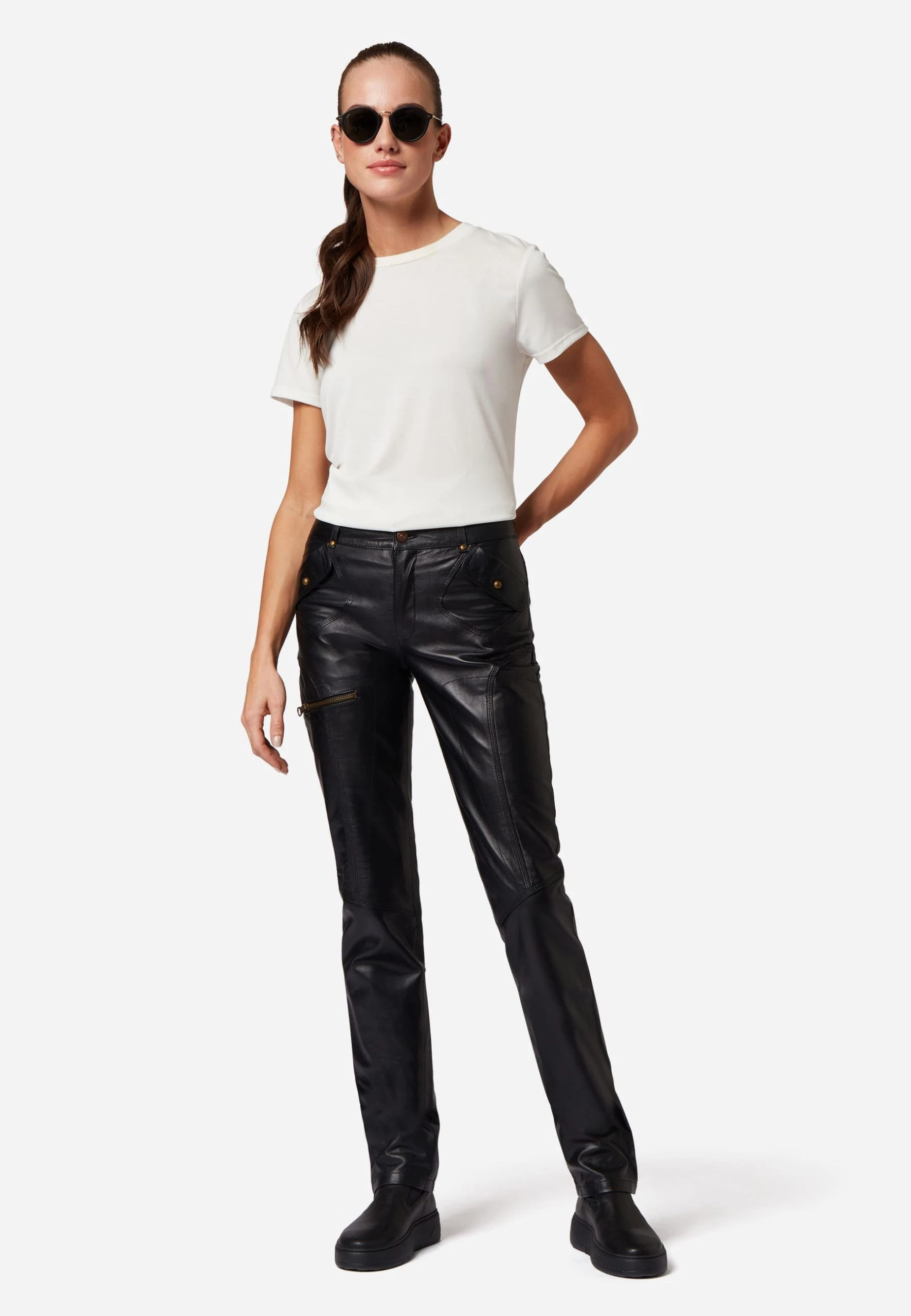 Lederhose Inspirit in Schwarz für Damen von Ricano® aus Ziegen-Nappa Leder – Regular Waist / Medium Rise – Femininer und figurbetonter Slim Fit – Futter: 100% atmungsaktives Polysatin – Ganzjahresartikel – von Frühling bis Winter zu jeder Jahreszeit passend – Größenausfall: Artikel fällt eine Nummer kleiner aus – Bitte eine Nummer größer wählen als gewohnt – Italienisches Fitting. Enthält nichttextile Bestandteile tierischen Ursprungs.