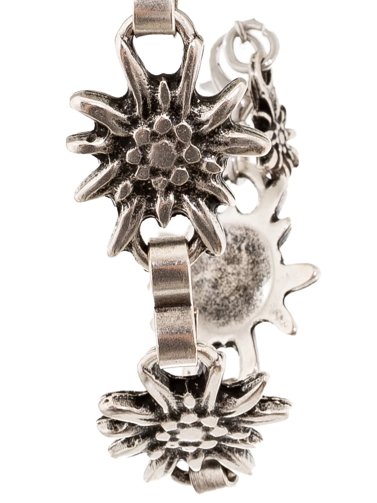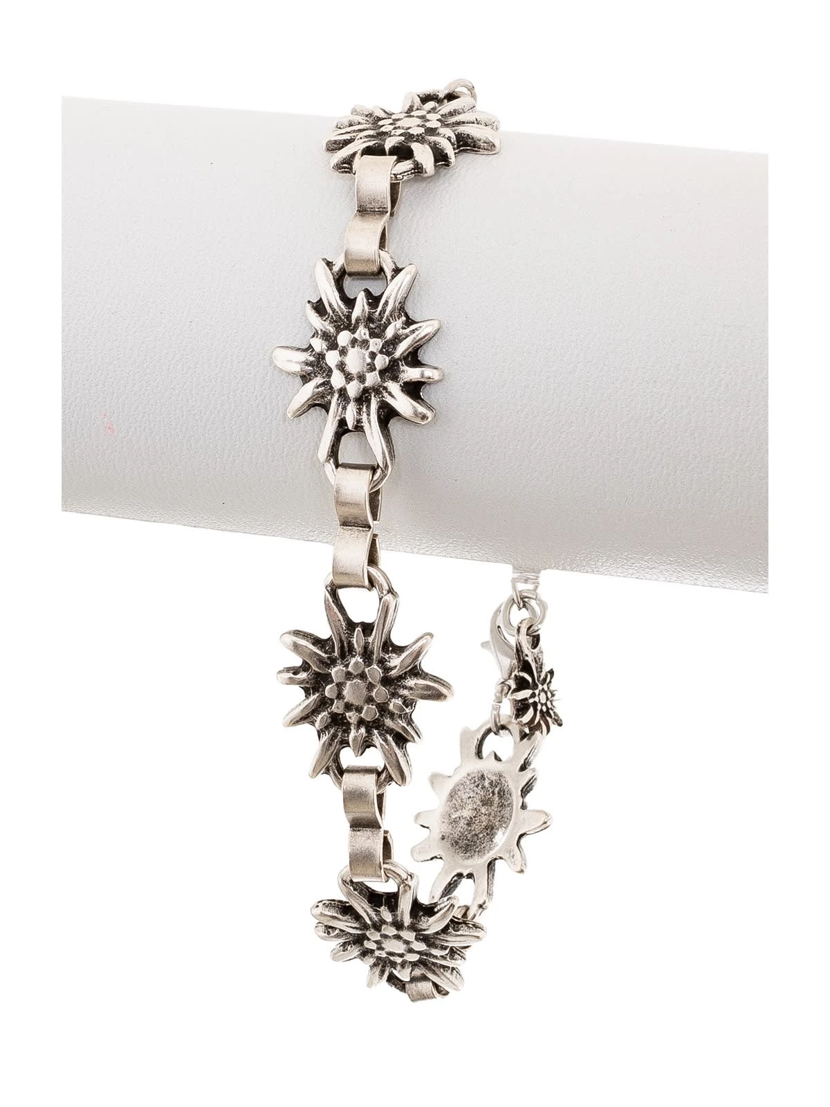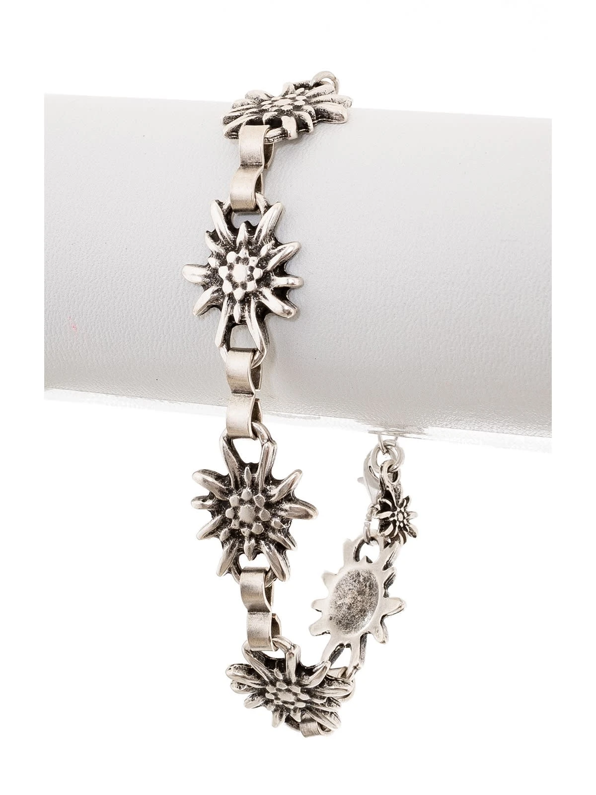 Trachten-Armband von Schuhmacher mit Edelweiß-Motiven in Altsilber-Optik. Das Edelweiß ist die bekannteste und symbolträchtigste Alpenblume. Zahlreiche Geschichten ranken sich um das Edelweiß. Es symbolisiert karge Schönheit, Sehnsucht und Ehrlichkeit. Das Trachtenarmband von Schuhmacher besinnt sich auf die Tradition und fügt fünf Edelweiß-Motive zu einer ansprechenden Gliederkette zusammen, die sich allein auf die schöne Alpenblume konzentriert und ganz ohne sonstigen Schnickschnack auskommt. Mit einem Karabiner-Verschluss und einer kleinen Kette ausgestattet, lässt sich das Armband individuell an das Handgelenk anpassen. Ein tolles Schmuckstück, mit starkem Charakter, das das ganze Jahr lang getragen werden kann. Lässt sich auch zu Jeans und Landhausmode kombinieren.•Metall. Länge ca. 18 – 24 cm •Schuhmacher •Trachtenmode