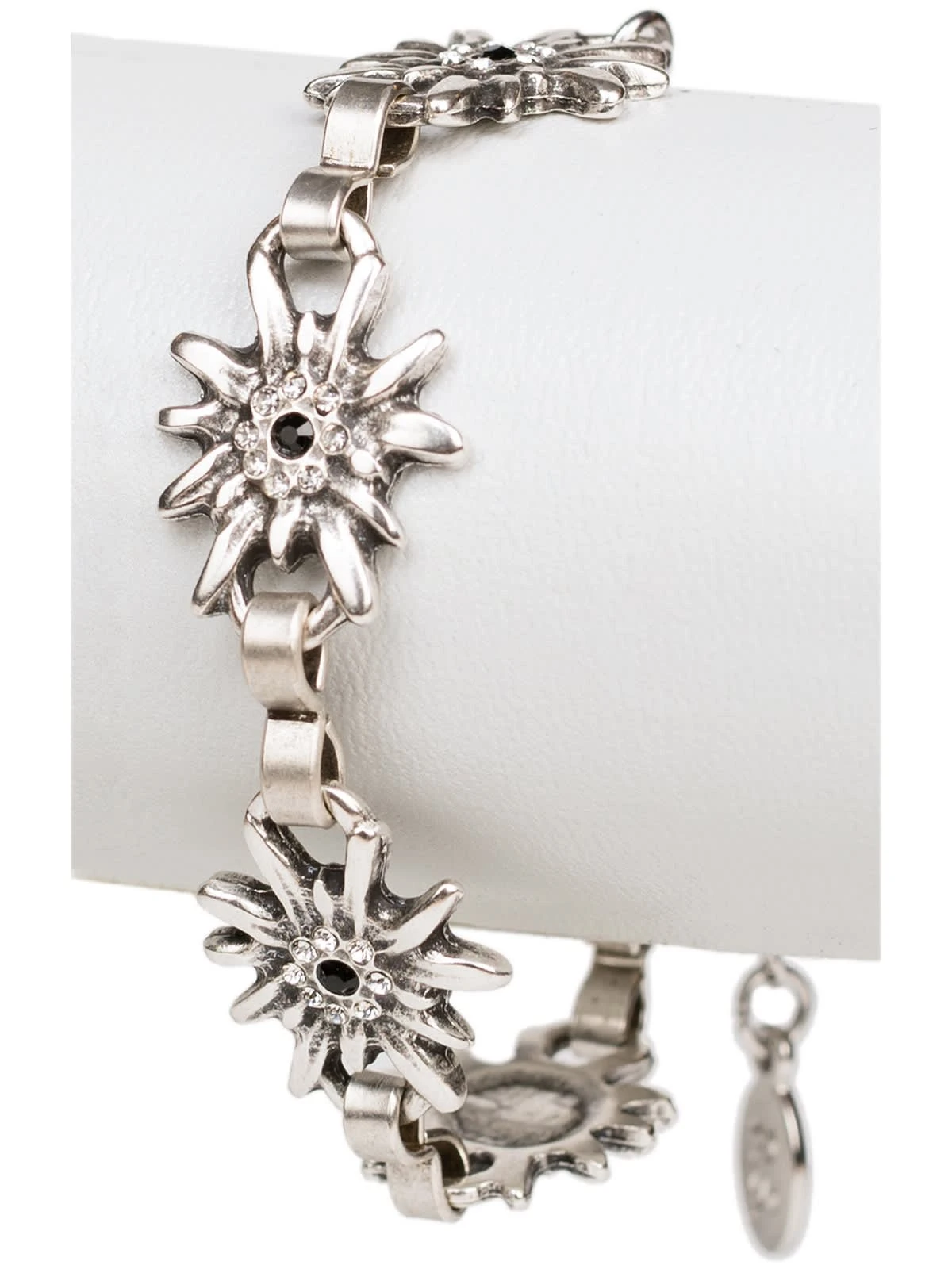 Armkette mit kristallfarbenen und schwarzen Steinen. Die Armkette hat eine Länge von 18 bis 25 Zentimeter – je nach Wunsch der Trägerin. Sie besteht aus edlem Metall. Die eingearbeiteten Steine in den einzelnen Elementen sind neutral und können somit als Schmuckstück am Handgelenk zu nahezu jedem Dirndl getragen werden. Oft sind es ja die kleinen Dinge die bei einem Trachtenoutfit den ganz besonderen Reiz ausmachen.•Trachtenarmband •Länge ca. 18- 25 cm •Schuhmacher