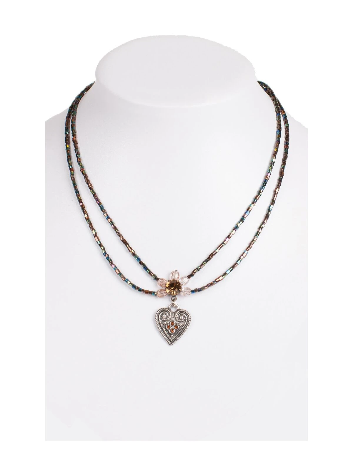 Die zeitlose Halskette. Die Halskette besteht aus zwei Perlenreihen, die in einem braunen Farbton gehalten sind. Die Kette selbst ist 42 bis 47 Zentimeter lang – je nach Bedarf. Als optisches Highlight dient ein herzförmiger Anhänger in der Mitte der Kette. Er ist zusätzlich mit kleinen Mustern und glänzenden Steinen veredelt.•Trachtenketten •Perlenkette •Schuhmacher