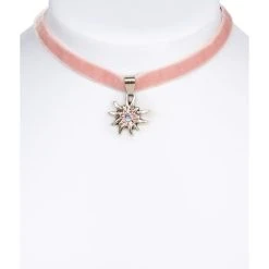Passend zum Dirndl und wie das Tüpfelchen auf dem “i”. Die richtige Halskette zum Dirndl macht aus einem Dirndl ein perfektes Dirndl. Früher ein Kropfband, heute modifizert, schmal gehalten und nah am Hals getragen passt die rosa farbene Samtbandkette wunderbar zum Dirndl und zeigt sich jung und kess. Das kleine alpine Edelweiss ist mit rosa farbenen Strasssteinen besetzt und sorgt für etwas Glanz und Glamour beim Outfit. Das Samtband ist in der Weite verstellbar und passt für alle gängigen Halsweiten.•Trachtenketten •Samtband •Schuhmacher