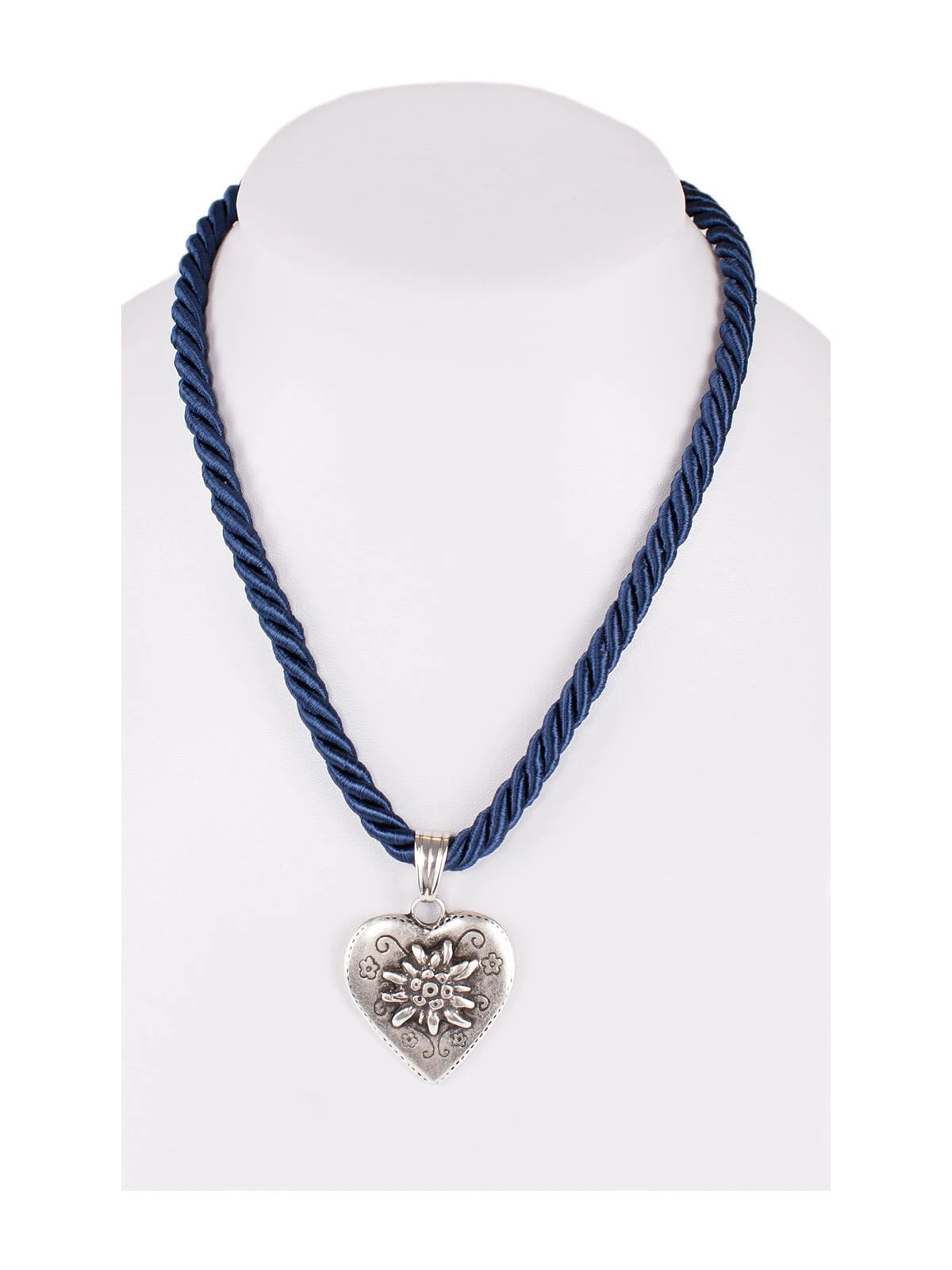 Kordel-Trachtenkette in Marineblau mit Anhänger. Erst das richtige Accessoire macht den Look perfekt. Die dezent gehaltene Kette von Schuhmacher legt den Akzent auf einen großen Herzanhänger mit Edelweiß-Motiv und floralen Ornamenten. Aus Metall in Altsilber-Optik gefertigt, harmoniert der Anhänger perfekt mit der gedrehten, sanft schimmernden Satinkordel in samtigen Blau. Damit sich die Halskette individuell anpassen lässt und stets richtig sitzt, ist sie mit einem kleinen, verstellbaren Karabiner-Verschluss ausgestattet. Ob zum Dirndl oder einer schlichten weißen Bluse, der Trachtenschmuck von Schuhmacher ist ein zeitgemäßes und feminines Accessoires, das traditionelle Outfits aufwertet und einen frischen Look erzeugt. Ideal für zünftige Mädels mit Stilbewusstsein.•Kordelband. Länge verstellbar 40 – 47 cm •Schuhmacher •Trachtenmode
