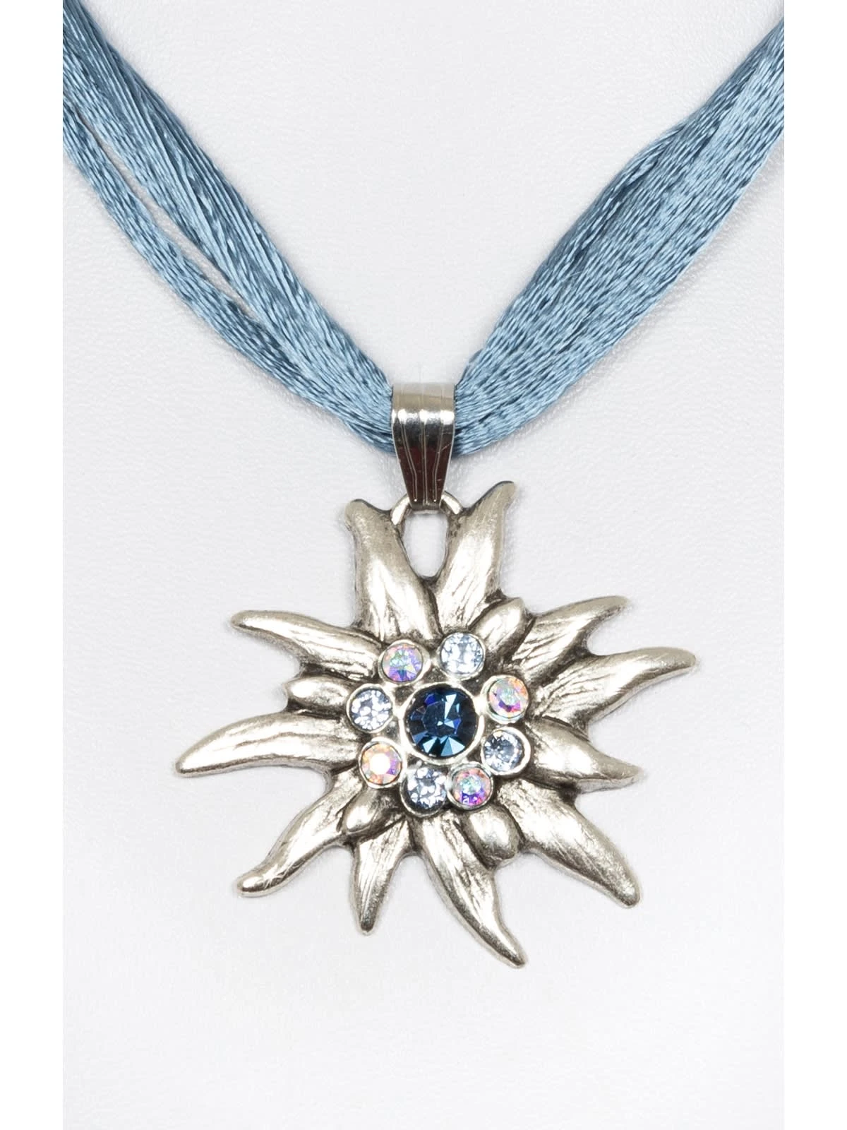 Moderne Halskette mit Edelweiß. Ideal zum Dirndl oder der Trachtenbluse passt die Halskette im Farbton Jeans. Die aus Stoff gefertigte Kette für Damen lässt sich sehr angenehm tragen. Der Anhänger in Form einer Blüte punktet mit funkelnden weißen und blauen Schmucksteinen. Das markante Accessoire ist ein schöner und traditioneller Blickfang.•Trachtenketten •Edelweiss •Schuhmacher