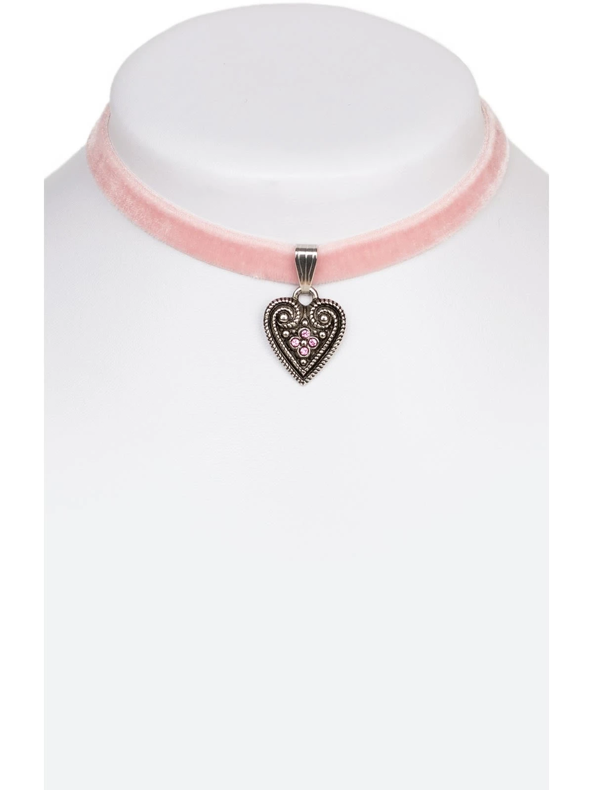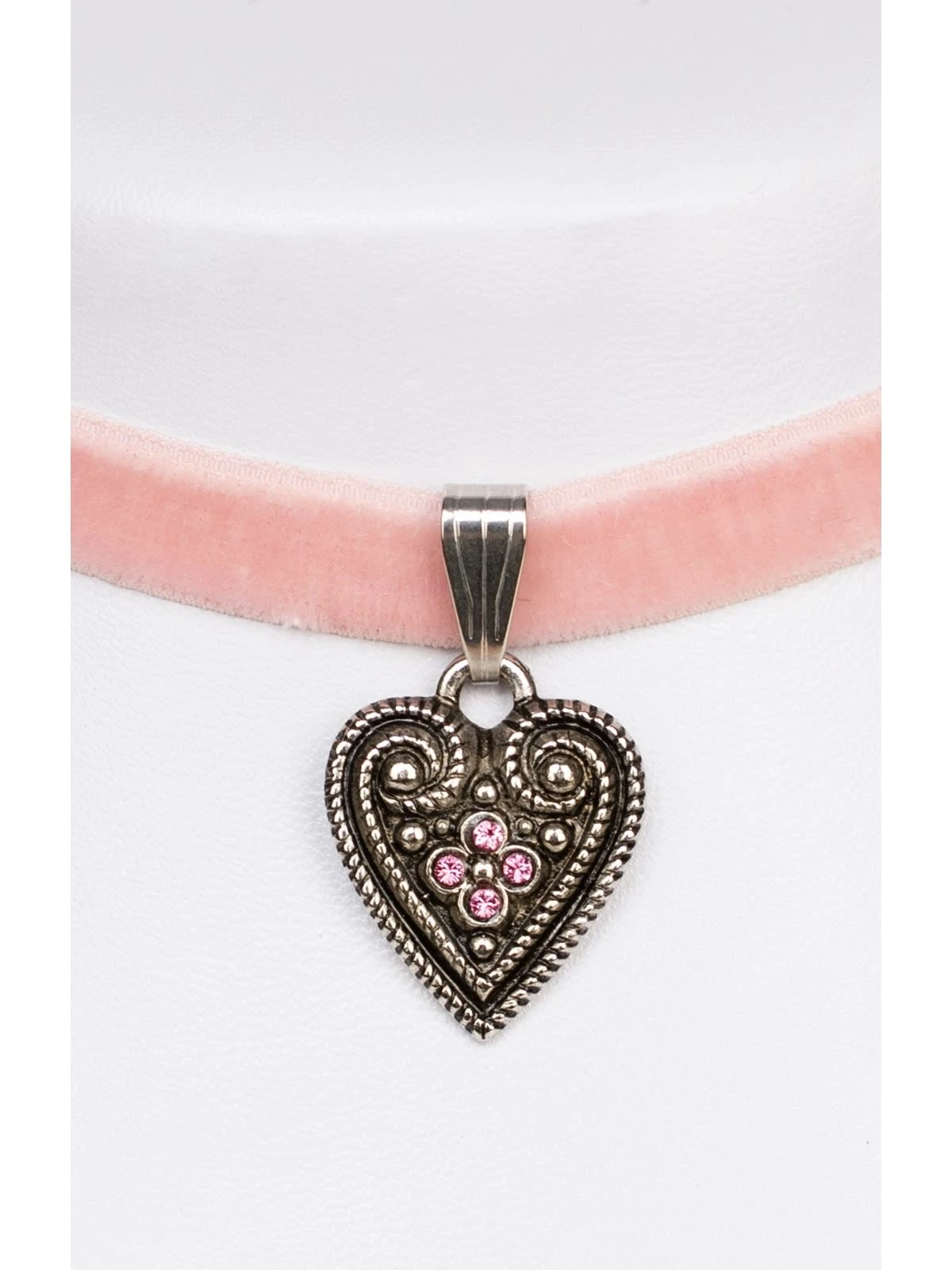 Dirndl Samtbandkette mit Herzanhänger. Die Alternative junge Halskette zum Dirndl. Die passende Halskette zum Dirndl macht aus einem Dirndl ein perfektes Dirndl. Der Trend zum kompletten authentischen Outfit ist ungebrochen und so gehört die Halskette einfach zum Dirndl dazu weil sie ein schönes Dekoletté macht. Während bei normalen Halsketten die Farben meist im Anhänger der Kette und somit unscheinbarer sind, lässt sich mit der rosa farbenen Samtbandkette direkt die Farbe des Dirndls aufnehmen. Nah am Hals getragen wirkt das jung und kess und der kleine Herzanhänger mit den farblich passenden Strassteinen ist traditionelles Element und toller Blickfang zugleich.•Trachtenketten •Samtband •Schuhmacher