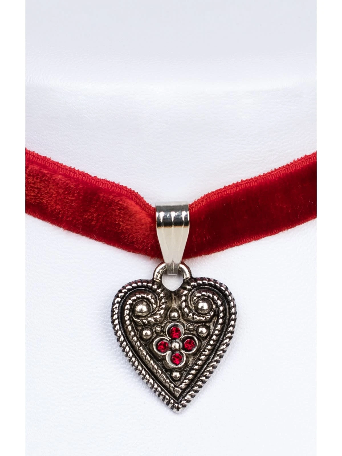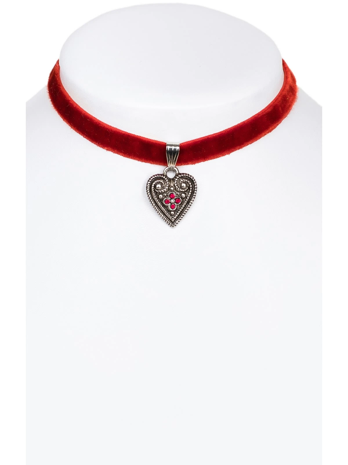 Dirndl Samtbandkette mit Herzanhänger. Die Alternative junge Halskette zum Dirndl. Die passende Halskette zum Dirndl macht aus einem Dirndl ein perfektes Dirndl. Der Trend zum kompletten authentischen Outfit ist ungebrochen und so gehört die Halskette einfach zum Dirndl dazu weil sie ein schönes Dekoletté macht. Während bei normalen Halsketten die Farben meist im Anhänger der Kette und somit unscheinbarer sind, lässt sich mit der rote Samtbandkette direkt auf die Dirndlfarbe eingehen. Nah am Hals getragen wirkt das jung und kess und der kleine Herzanhänger mit den farblich passenden Strassteinen ist traditionelles Element und toller Blickfang zugleich.•Trachtenketten •Samtband •Schuhmacher