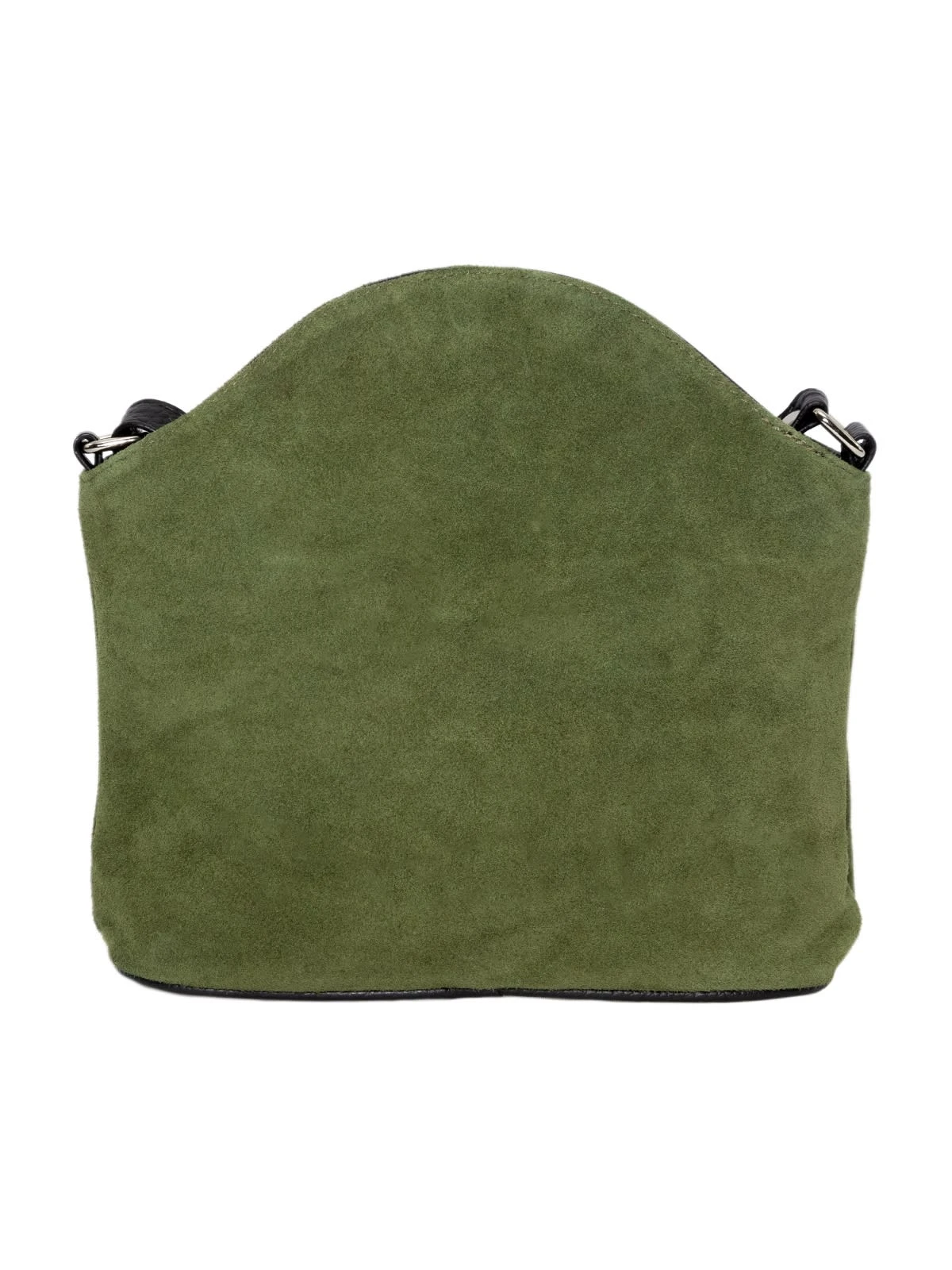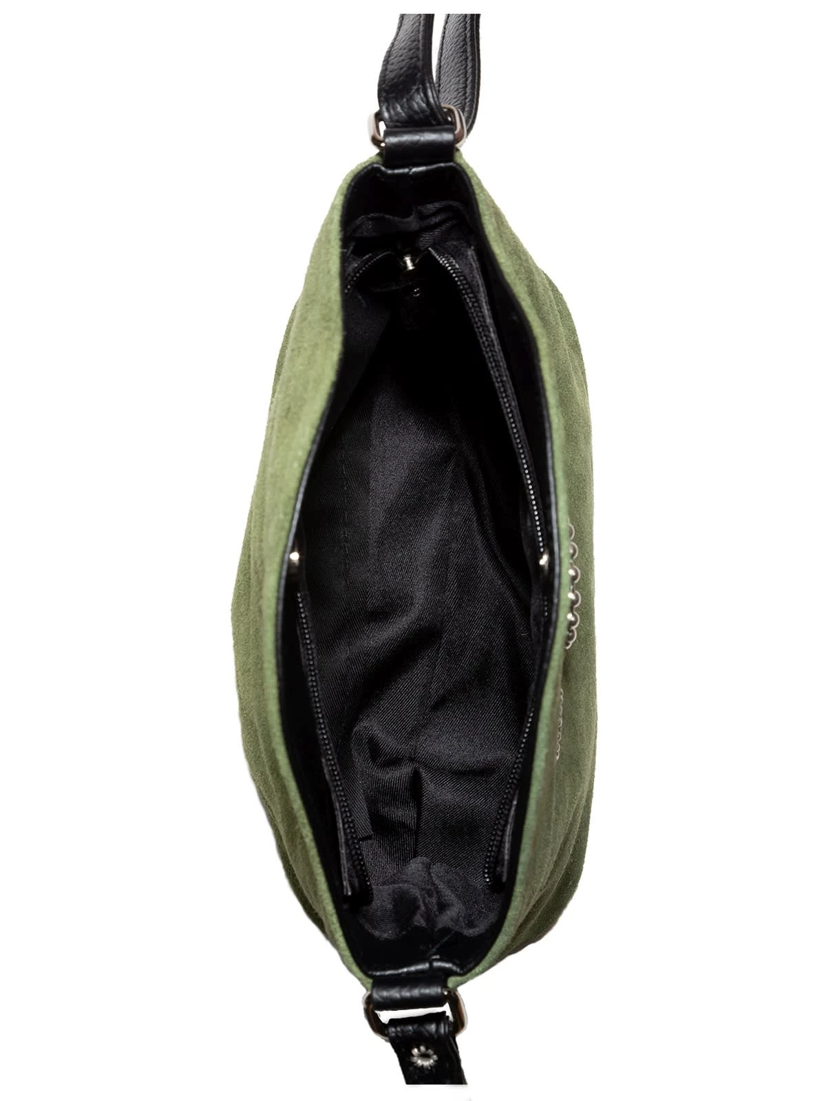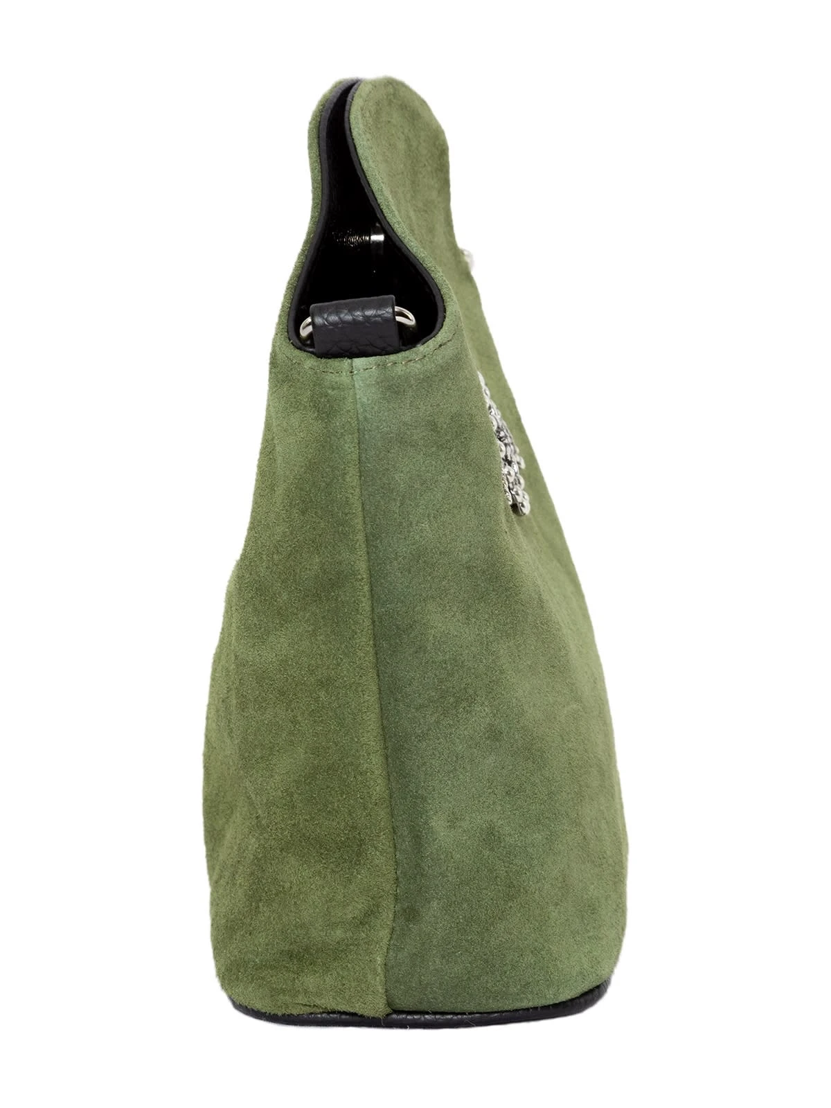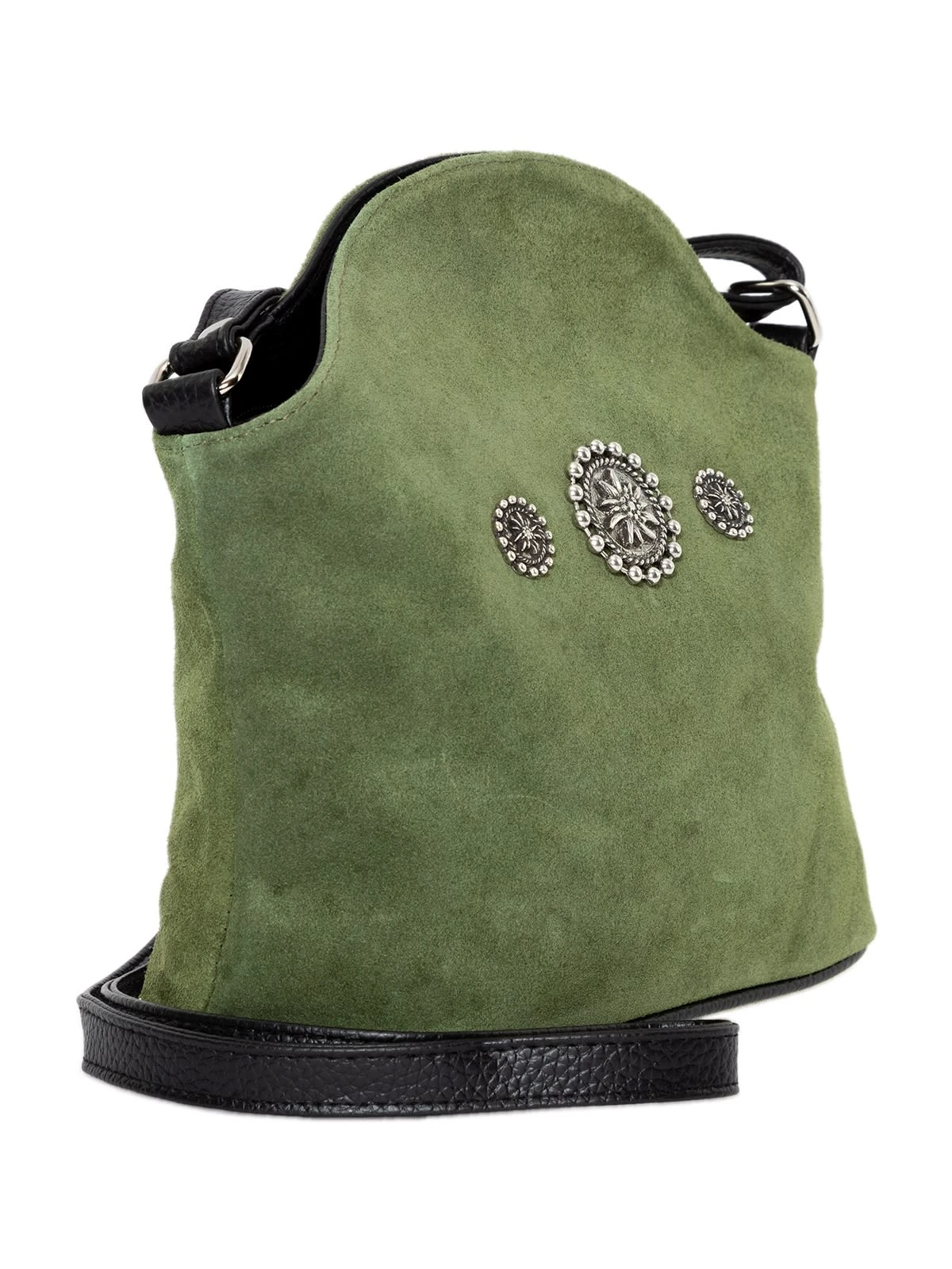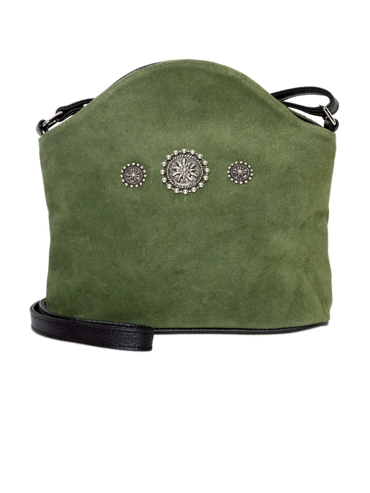 Schicke Metallverzierung auf grünem Wildleder. Die Trachten Dirndltasche EDELWEISS in Oliv besticht durch ihre gebogene Form und die Zierelemente, die insgesamt drei Edelweißblüten darstellen und mit glitzernden Strasssteinchen gerahmt sind. Das stilvolle Modell verfügt über einen verstellbaren schwarzen Schulterriemen und wird mit einem Druckknopf verschlossen. Im Inneren der Tasche befindet sich ein Reißverschlussfach.•Wildleder, ca. 27 x 17 x 4 cm, Schulterriemen 1,40 m verstellbar/ Druckknopfverschluss, 1 Reißversch