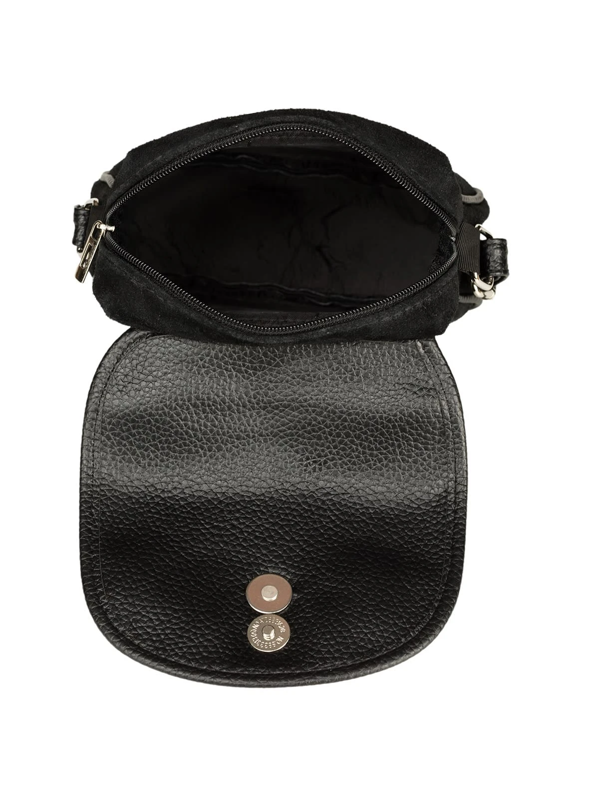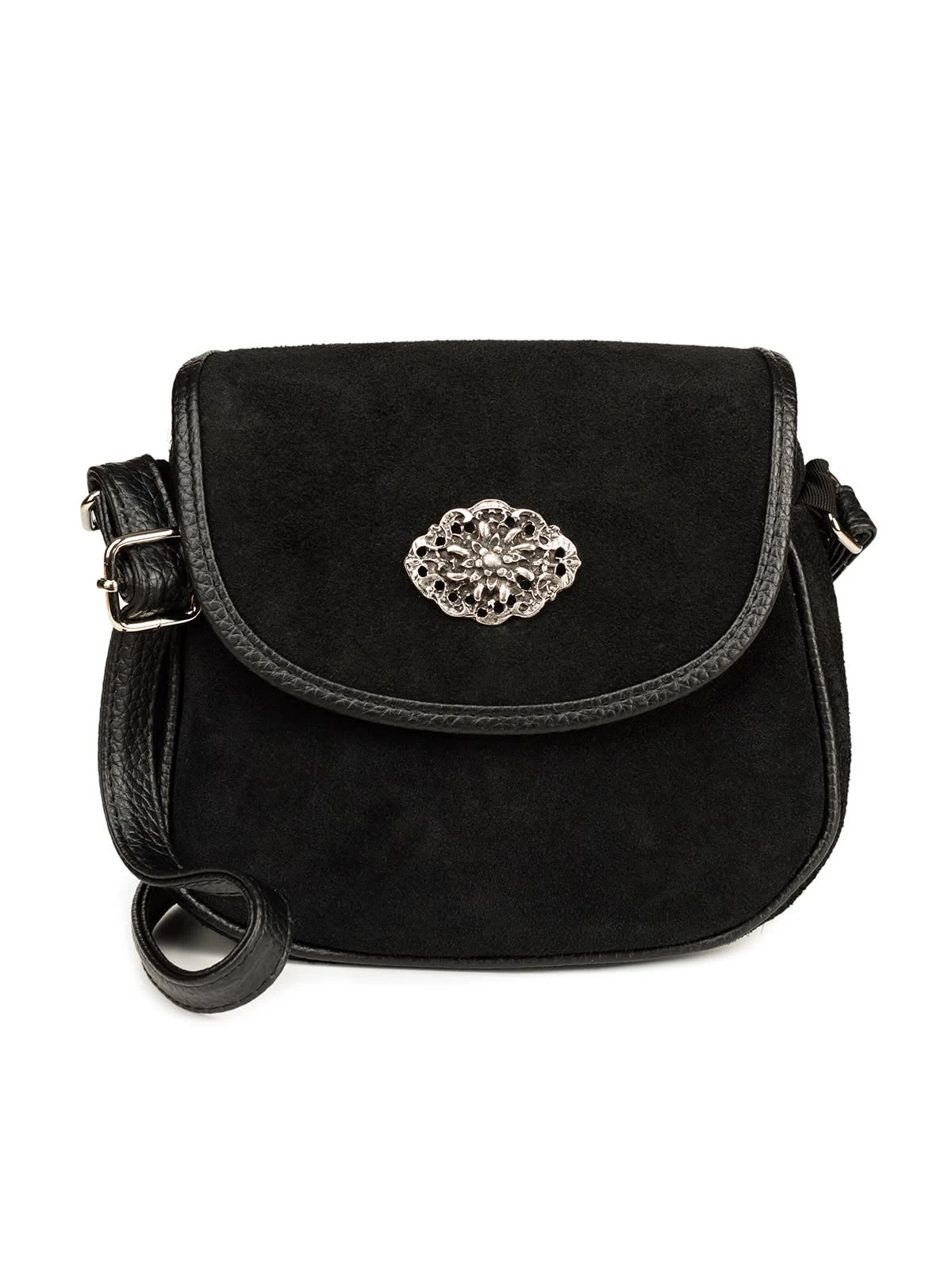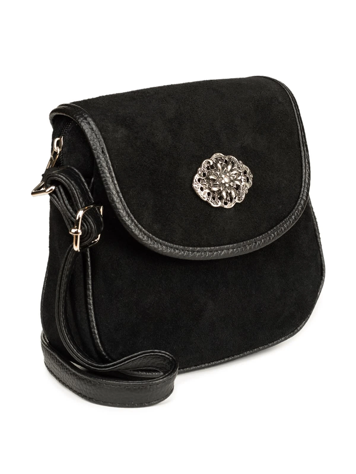 Trachtentasche in schwarzem Velour-Leder für Damen. Zu einem schönen Dirndl gehört auch das passende Täschchen. Das Modell von Schuhmacher besinnt sich auf die Tradition und setzt auf Zurückhaltung. Weiches Velour-Leder, dezente Zierpaspeln und ein klassischer Farbton zeichnen die Umhängetasche aus. Einziges Zierelement ist eine große Metallapplikation in Edelweißform. Der schmale Riemen aus strukturiertem Glattleder ist fest an die Tasche angebracht und lässt sich stufenlos verstellen. Das Hauptfach kann mit einem praktischen Magnetverschluss geschlossen werden und ist zusätzlich mit einem Reißverschluss gesichert. Das Täschchen hat die perfekte Größe um alle notwendigen Kleinigkeiten wie Puderdose, Lippenstift, Schlüssel, Geld und Handy sicher zu verstauen.•Tasche •Tracht •Wildleder, ca. 20 x 18 x 6 cm, Schulterriemen 1,39 m verstellbar