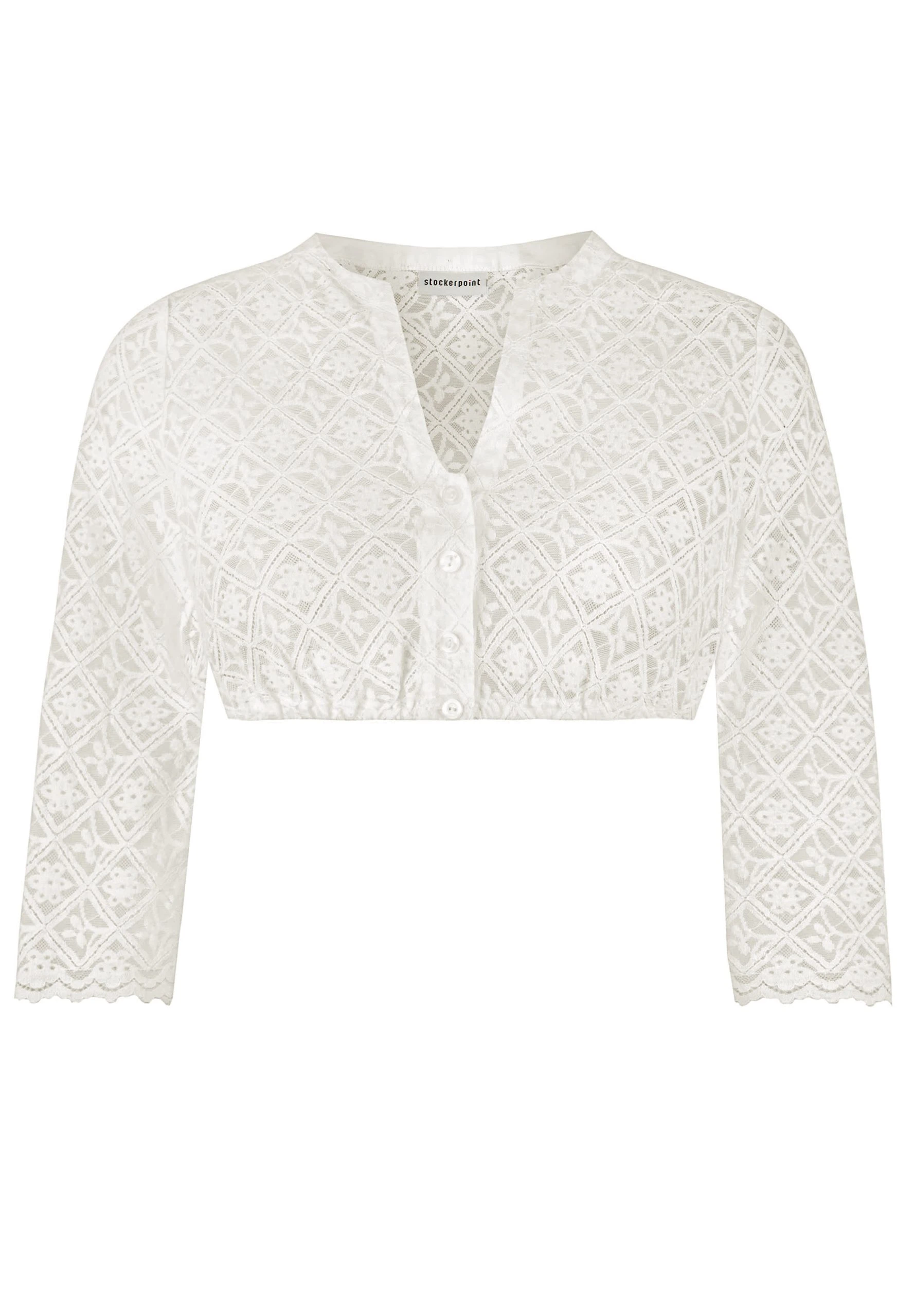 Dirndlbluse Elza in creme von Stockerpoin in creme. Diese zauberhafte 3/4 Arm Bluse aus transparenten Spitzenstoff passt sehr gut zu einem traditionellen als auch zu einem modernen Dirndl. Der V-Ausschnitt und die Knopfleiste mit schlichten Knöpfen veredeln das schlichte Design. Diese klassische Damenbluse ist ein echter Blickfang und gehört sicher bald zu deinem Lieblingsstück.