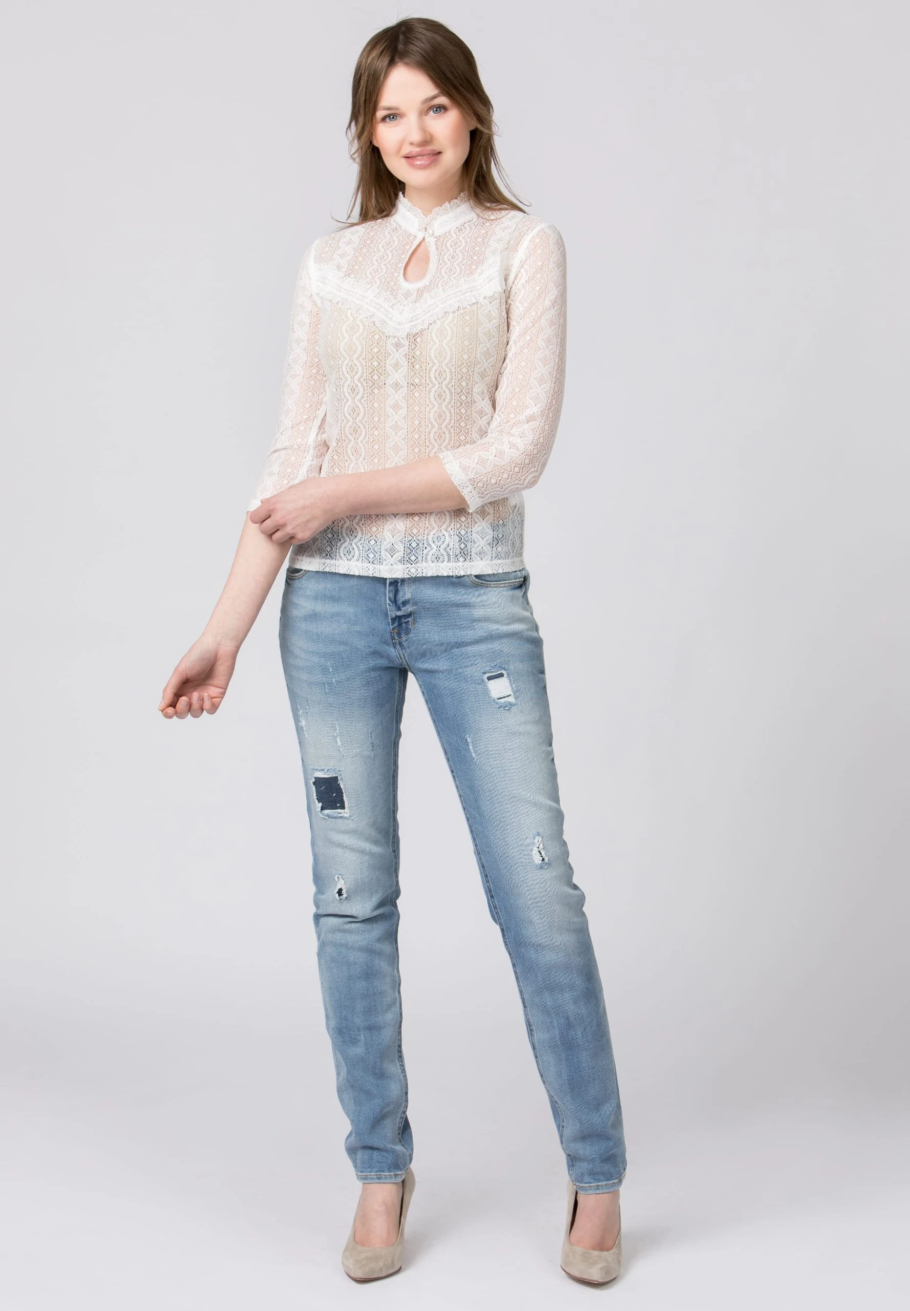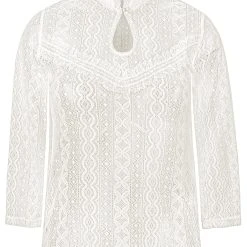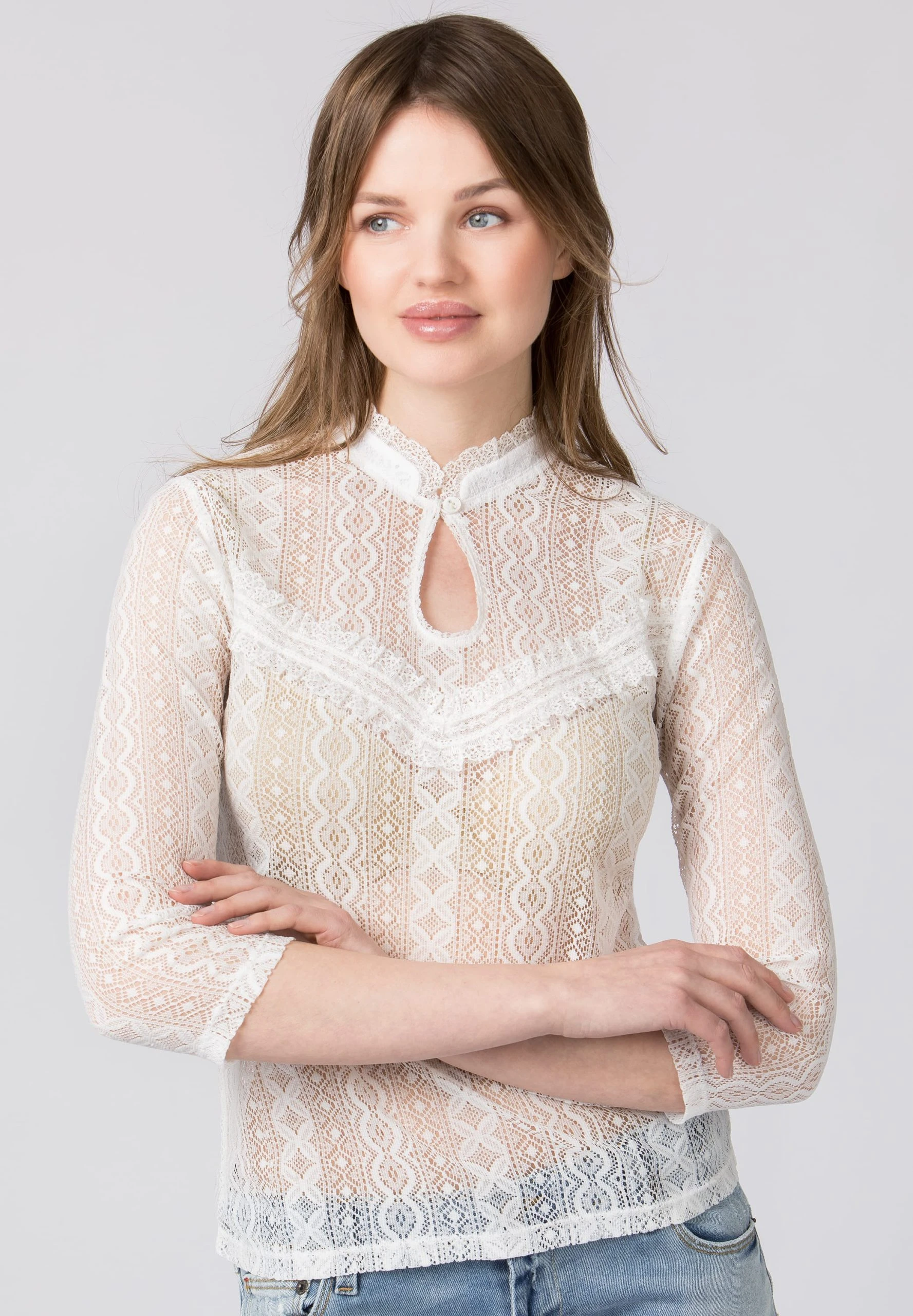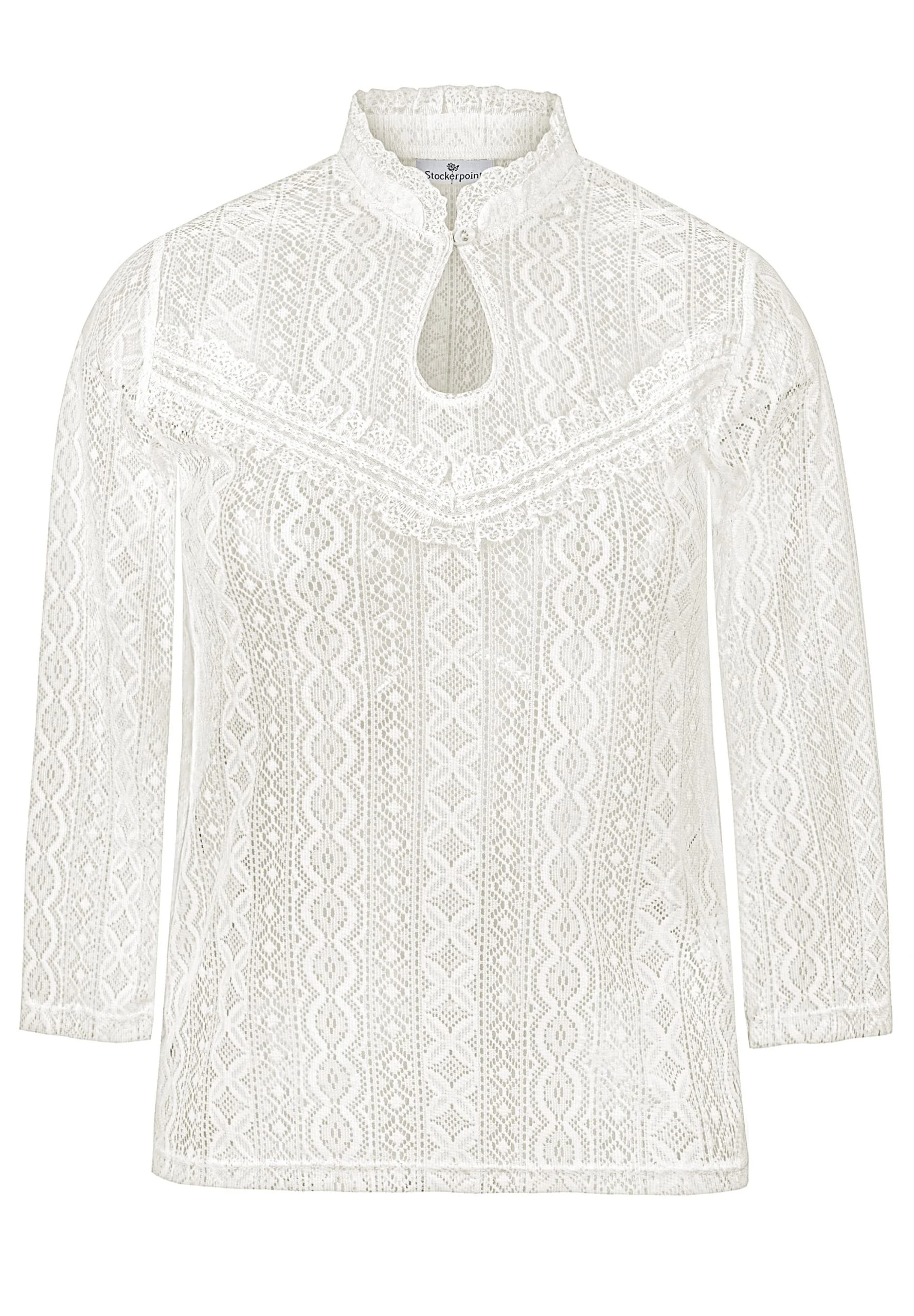 Trachten Shirt Nediva von Stockerpoint in creme. Das hochgeschlossene Langarm-Shirt in „Comfort-Fit“ überzeugt durch den hochwertigen, transparenten Spitzenstoff. Der elegante Stehkragen und der feminine Tropfen-Ausschnitt ist mit einer feinen Spitze veredelt und umschmeichelt gekonnt das Dekolleté. Der ideale Kombipartner zur Lederhose und zur Jeans.