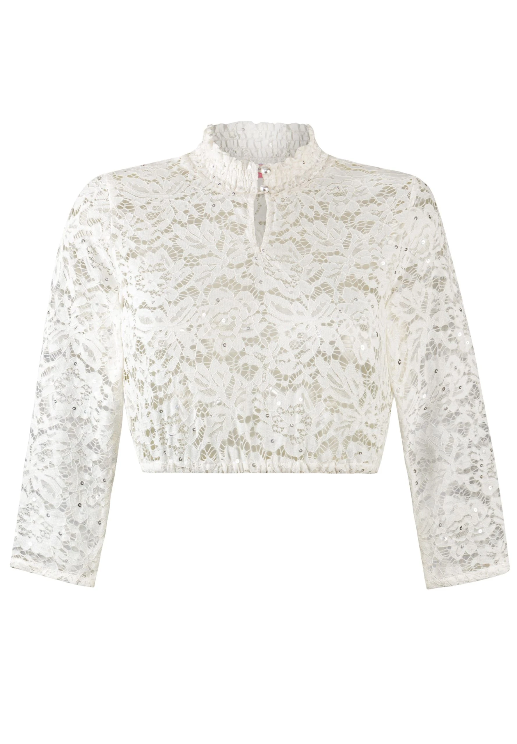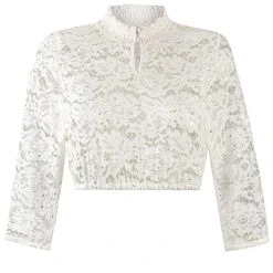 Dirndlbluse Deliane von Diamond en vogue in creme. Die hochgeschlossene Damenbluse aus hochwertigem, transparenten Spitzenstoff zeichnet sich durch liebevolle Details aus. Der elegante Stehkragen und der feminine Tropfen-Ausschnitt ist mit einer feinen Spitze veredelt und umschmeichelt gekonnt das Dekolleté. Diese hochwertig verarbeitete Bluse ist vielseitig kombinierbar und zieht alle Blicke auf sich.