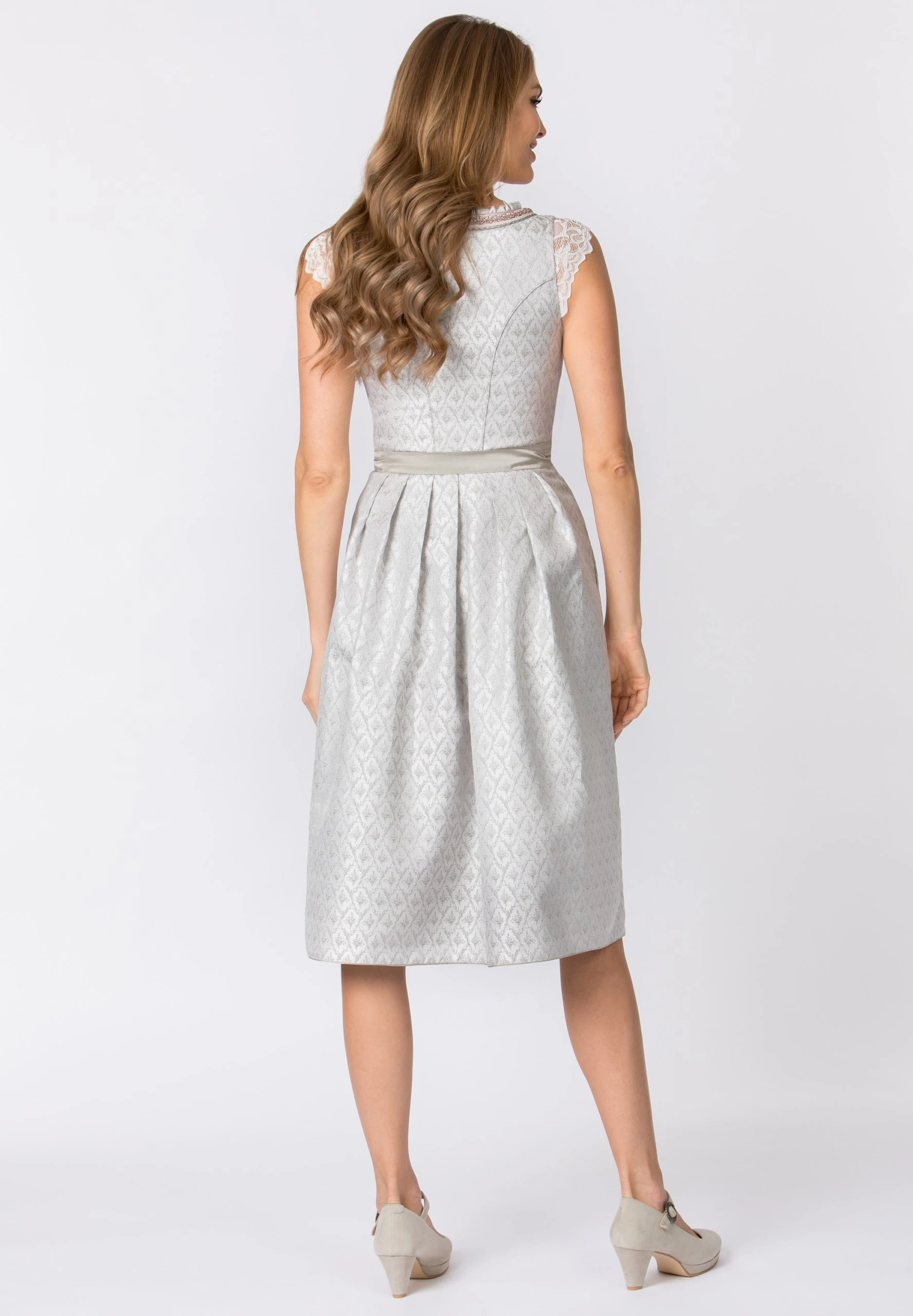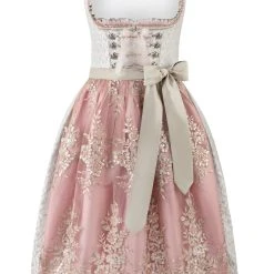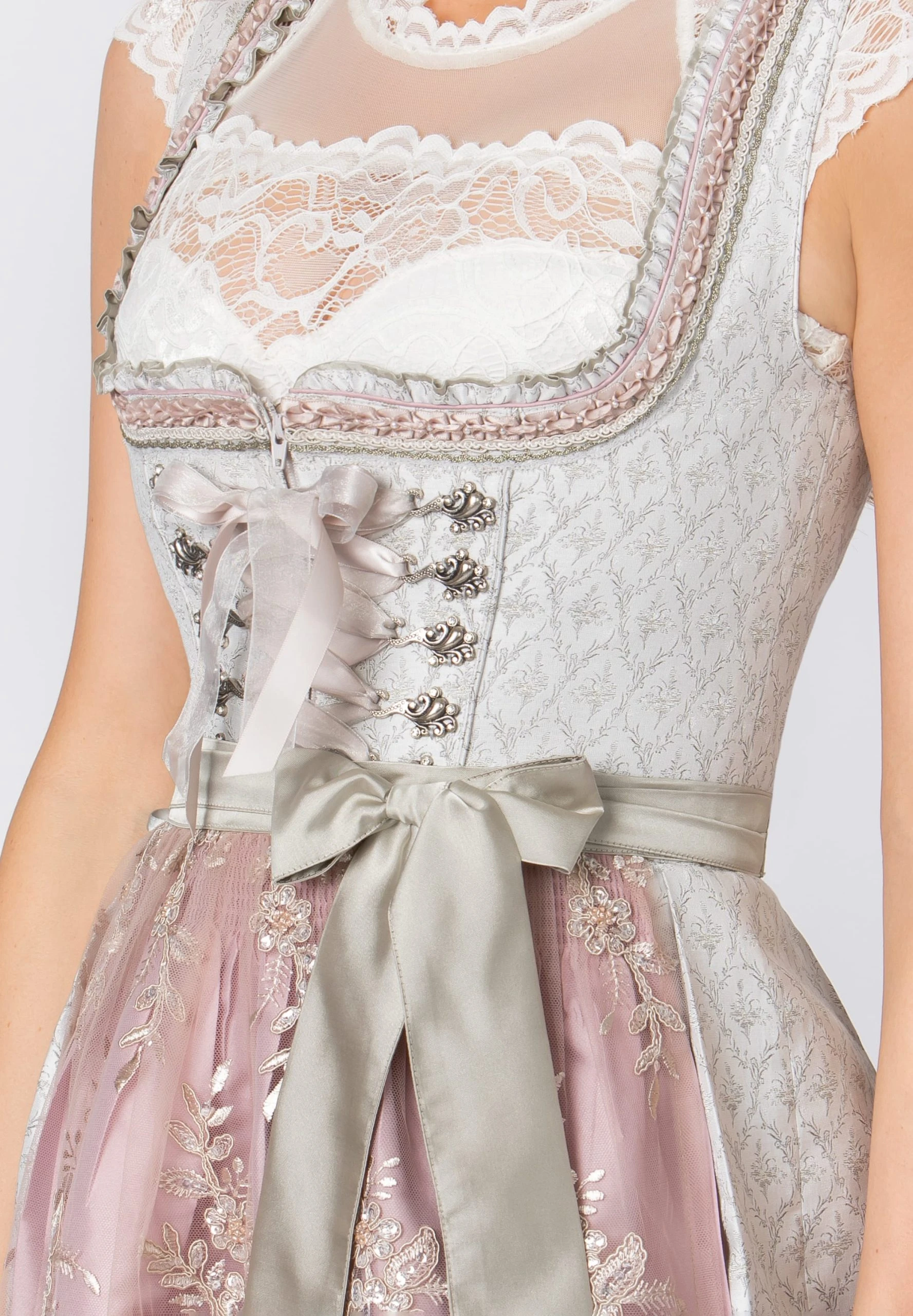 Dirndl Amelie von Bergfeuer in rose. Das stilvolle Dirndl begeistert durch das trachtige Jacquard Muster mit Lurex und ist mit liebevollen Details versehen. Für die feminine Note sorgen die eingearbeiteten Rüschen am Ausschnitt, die aufgenähten Zierborten sowie die mit Strasssteinen verzierten Miederhaken. Die Schnürung aus Satin- und Organzabändern unterstreichen die feminine Passform. Durch die filigrane, farblich abgestimmte und unterlegte Spitzenschürze entsteht der besondere Look. Unser Model trägt den passenden Body Romy in der Farbe creme.