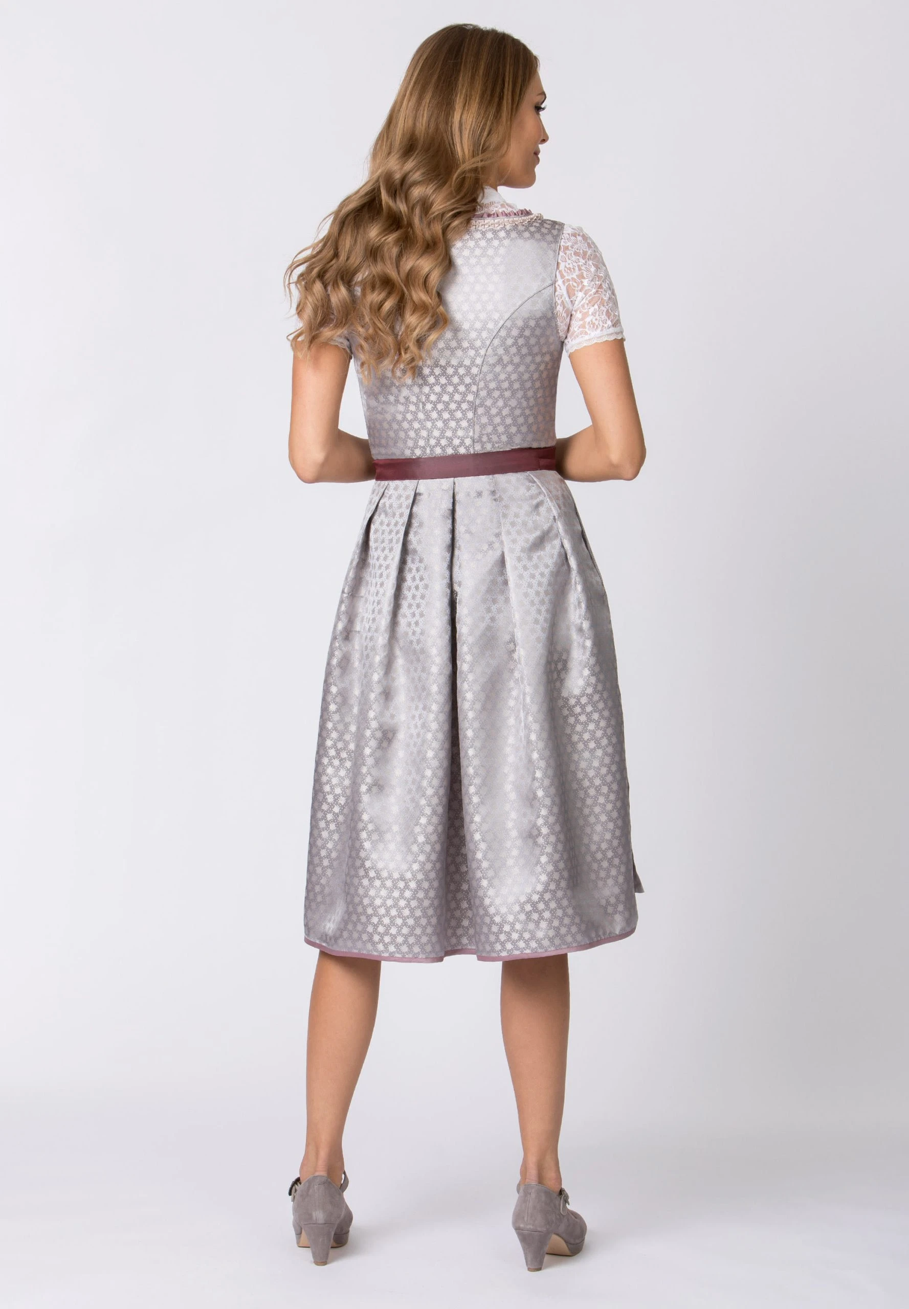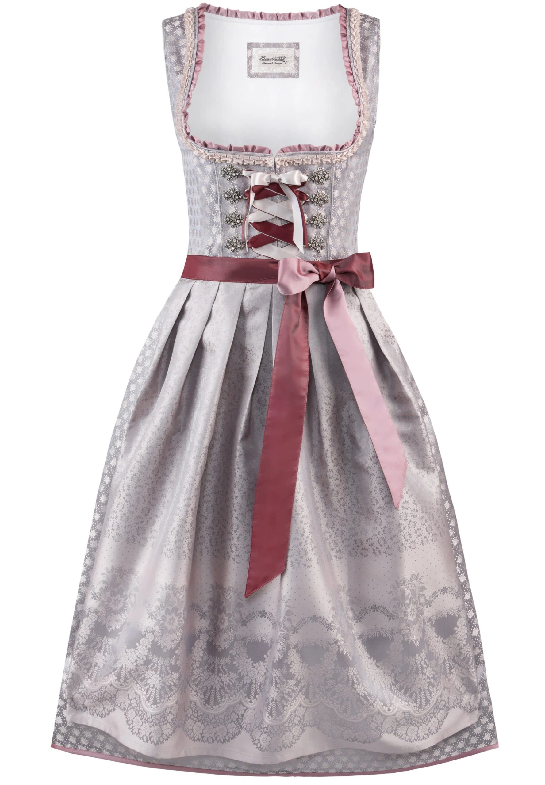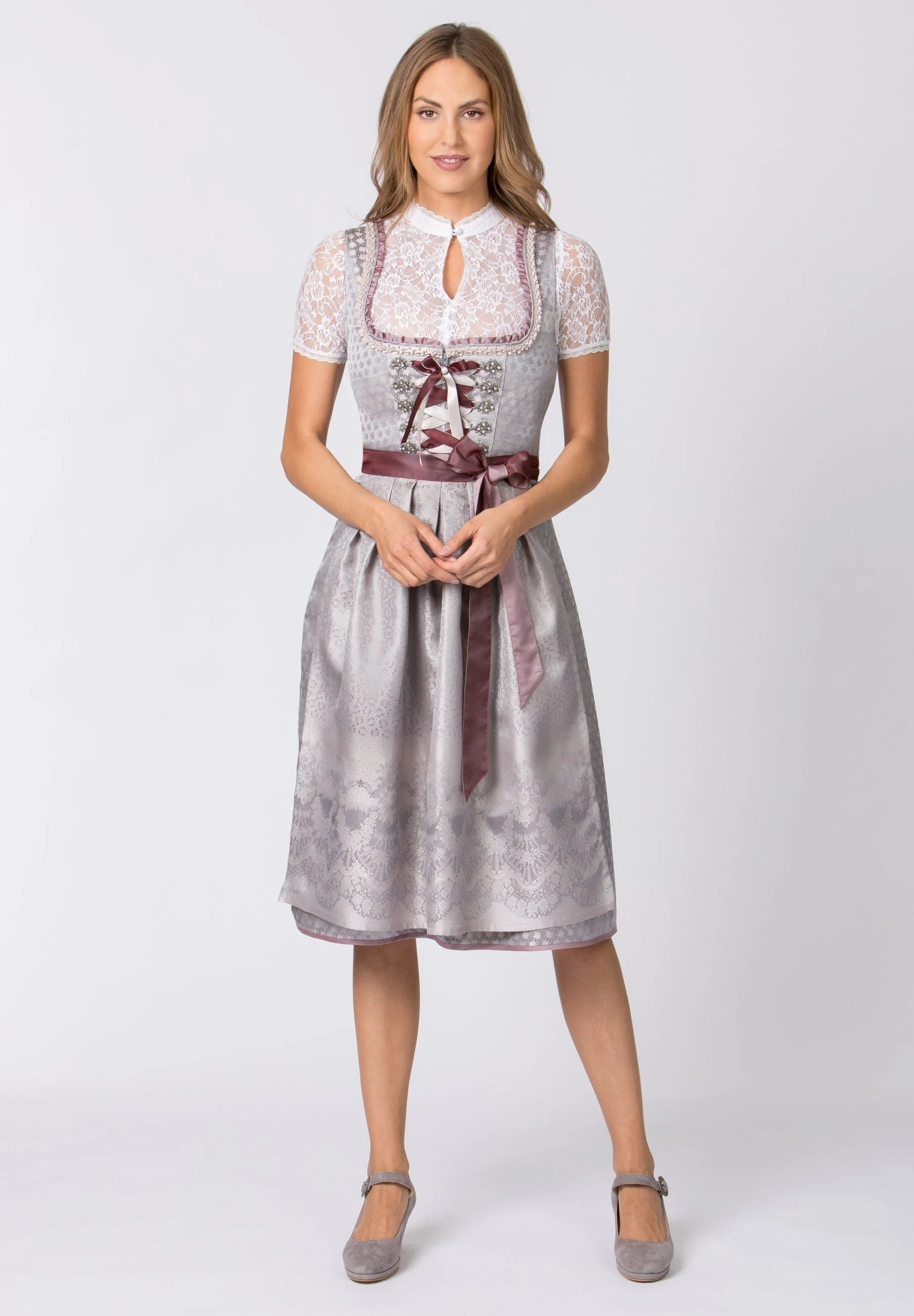 Dirndl Lia von Heimatgwand. Das Modell besticht durch den femininen Schnitt. Der gemusterte, hochwertige Jacquardstoff setzt besondere Akzente. Für die feminine Note sorgen die eingearbeiteten Rüschen am Ausschnitt, die aufgenähten Zierborten sowie die mit Strasssteinen verzierten Miederhaken. Die Schnürung aus zwei verschieden farbenen Satinbändern ist ein echter Hingucker. Ein hinreißendes Lieblingsteil für viele Anlässe. Unser Model trägt den Body Lilo in creme.