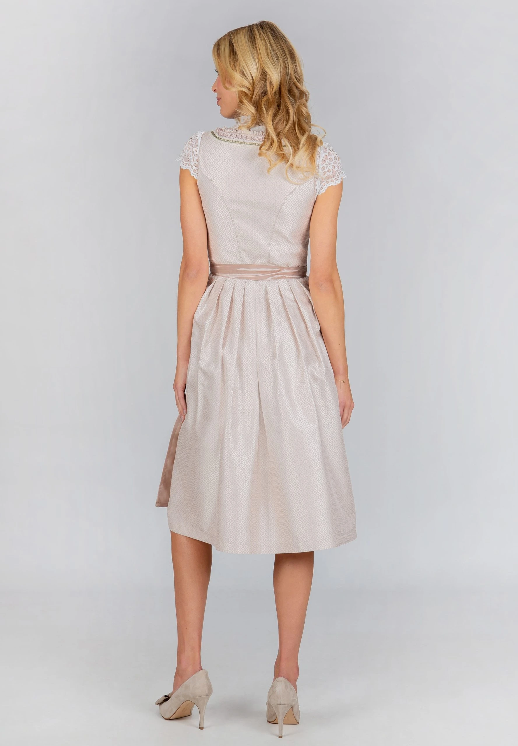 Dirndl Loretta von Bergfeuer in taupe. Das stilvolle Dirndl begeistert durch das trachtige Jacquard Muster und ist mit liebevollen Details versehen. Für die feminine Note sorgen die eingearbeiteten Rüschen am Ausschnitt, die aufgenähten Zierborten sowie die mit Strasssteinen verzierten Miederhaken. Die Schnürung aus Satin- und Organzabändern unterstreichen die feminine Passform. Durch die filigrane, farblich abgestimmte und unterlegte Spitzenschürze entsteht der besondere Look. Unser Model trägt die dazu passende Bluse Daisy in der Farbe weiß.