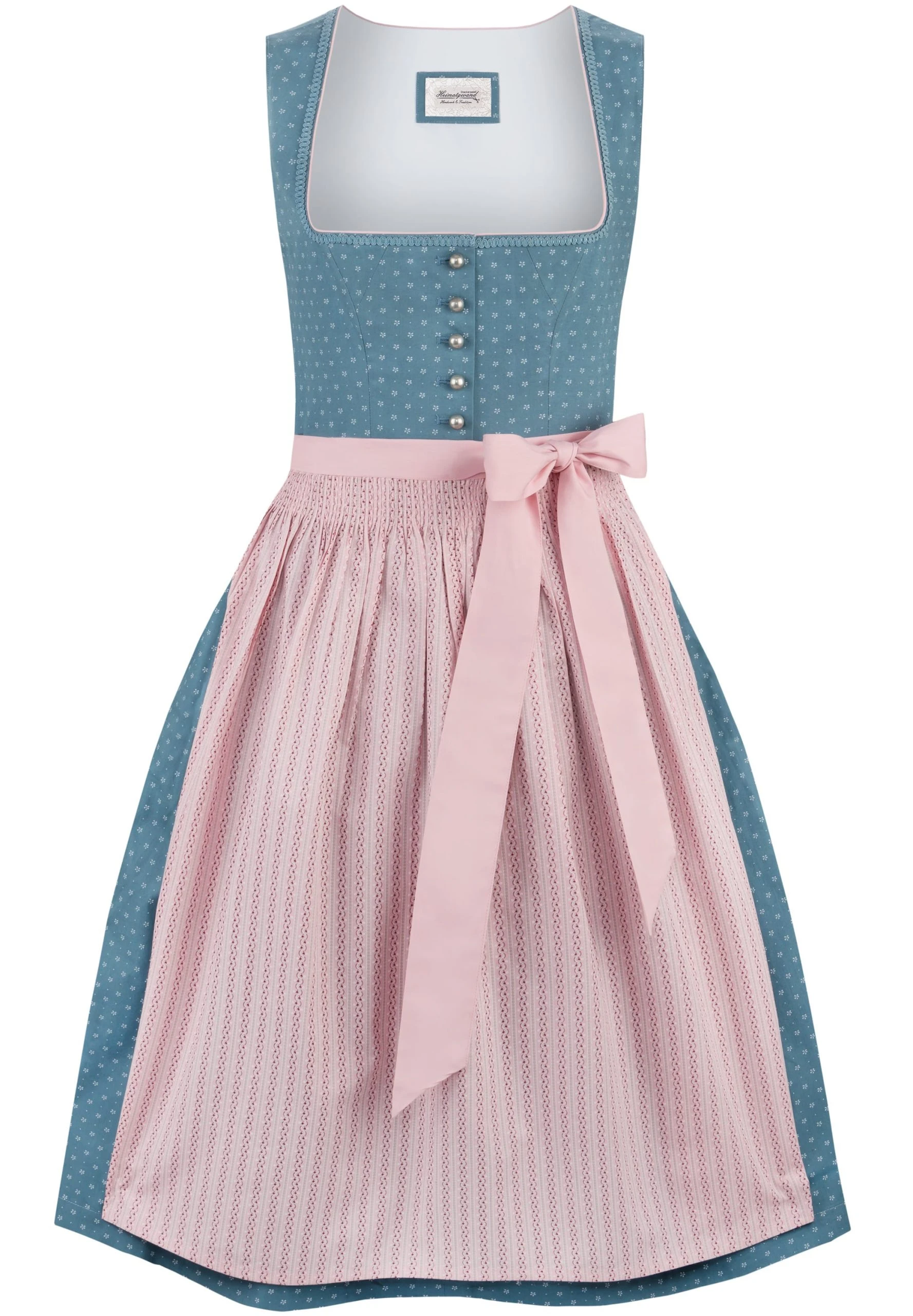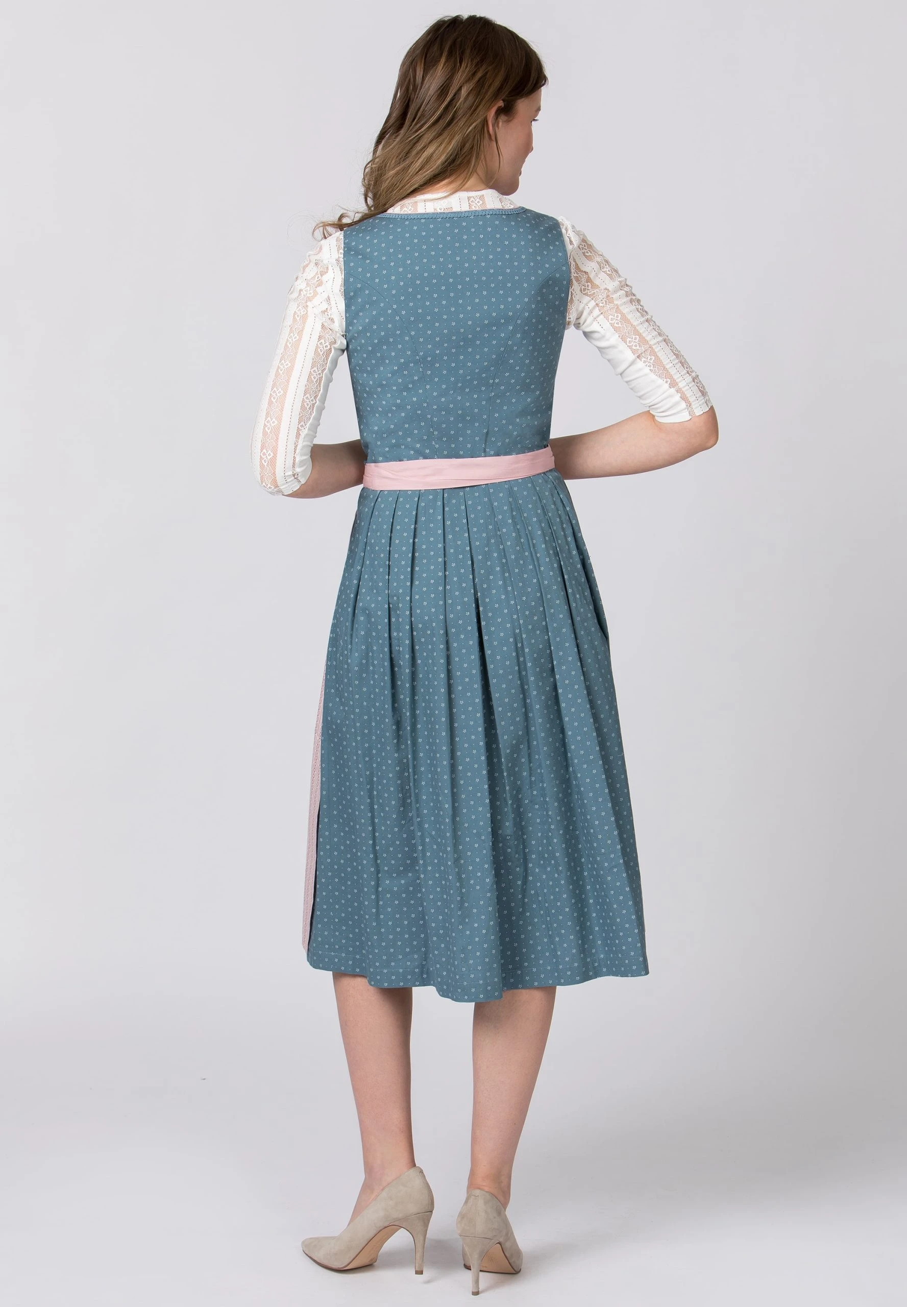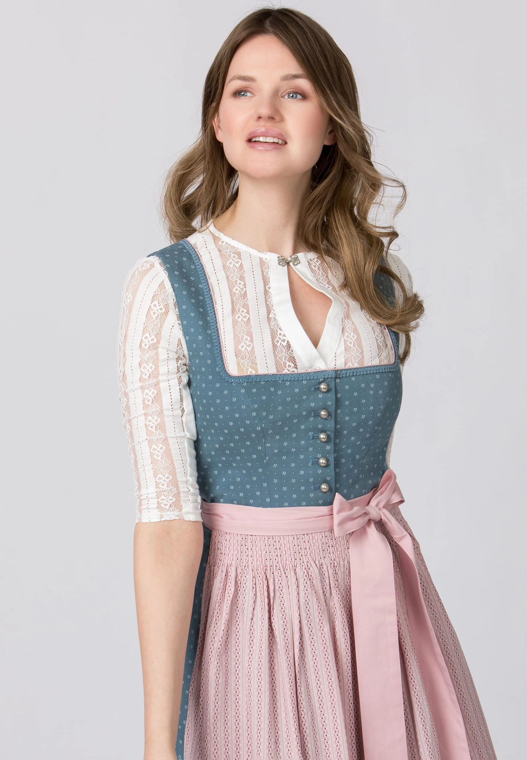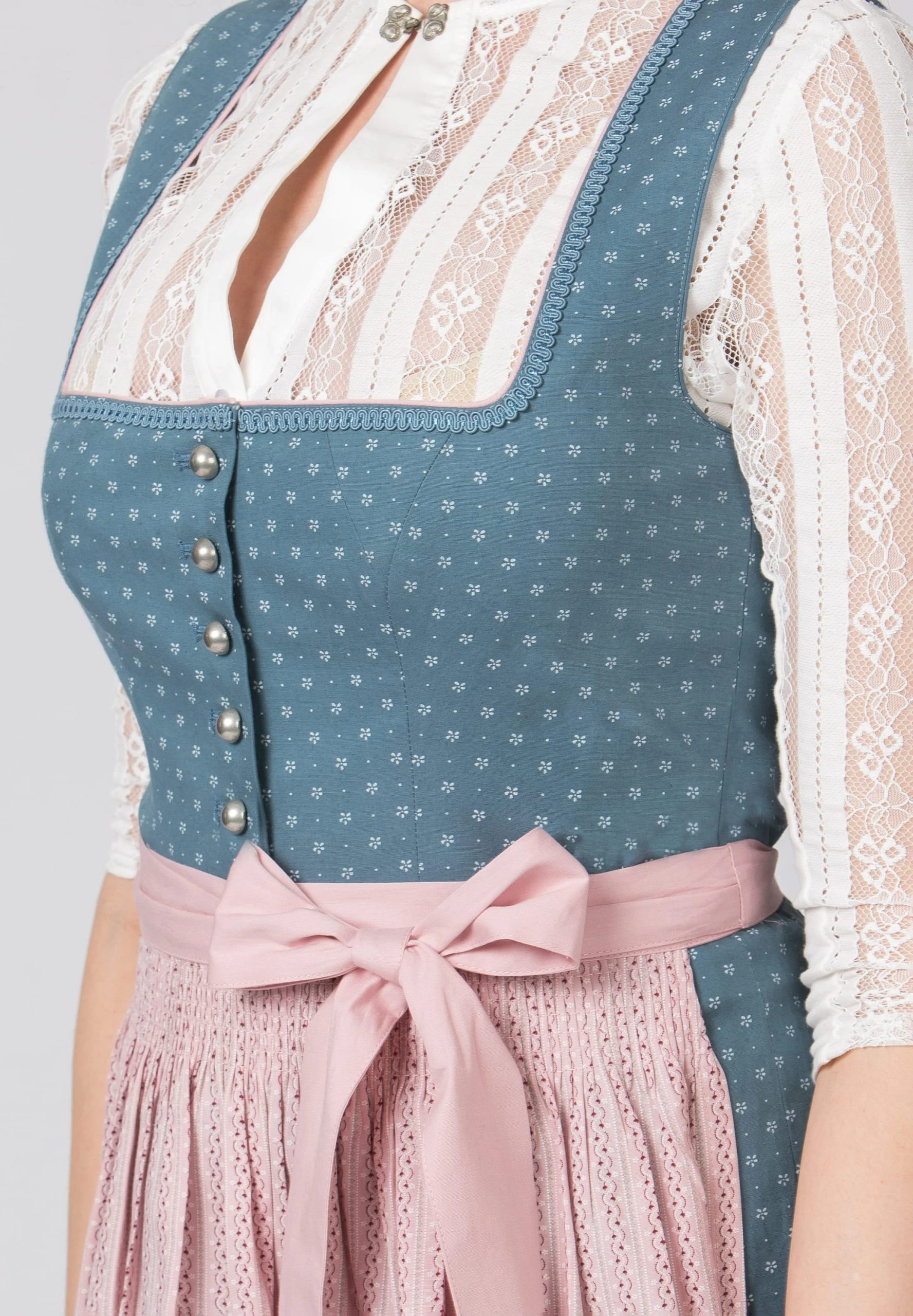 Dirndl Madeline von Heimatgwand in rauchblau. Das Modell überzeugt durch das dezente Printmotiv und ist mit liebevollen Details versehen. Der gerade Ausschnitt zaubert ein schönes Dekolleté. Die filigranen Knöpfe in altsilber unterstreichen den gesamten Look. Ein absolutes Muss für jeden Trachtenfan. Unser Model trägt die Dirndlbluse Alix in creme.