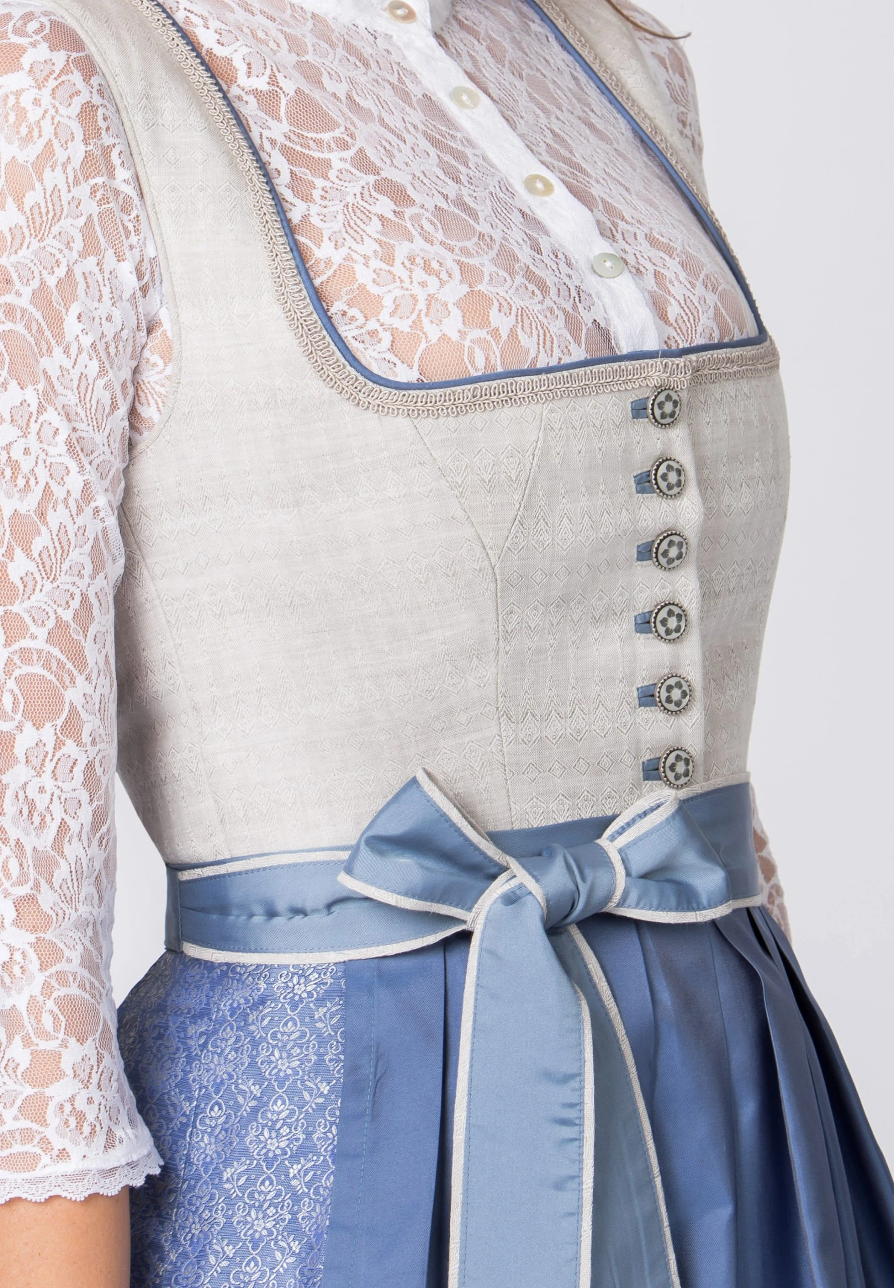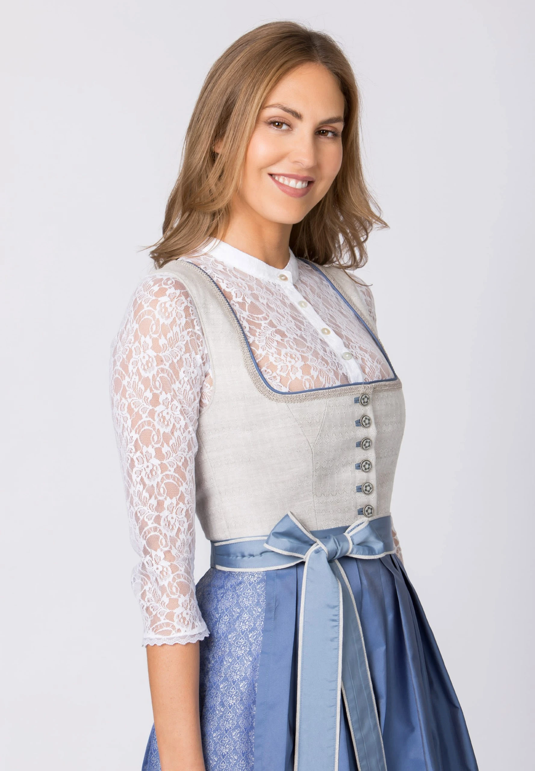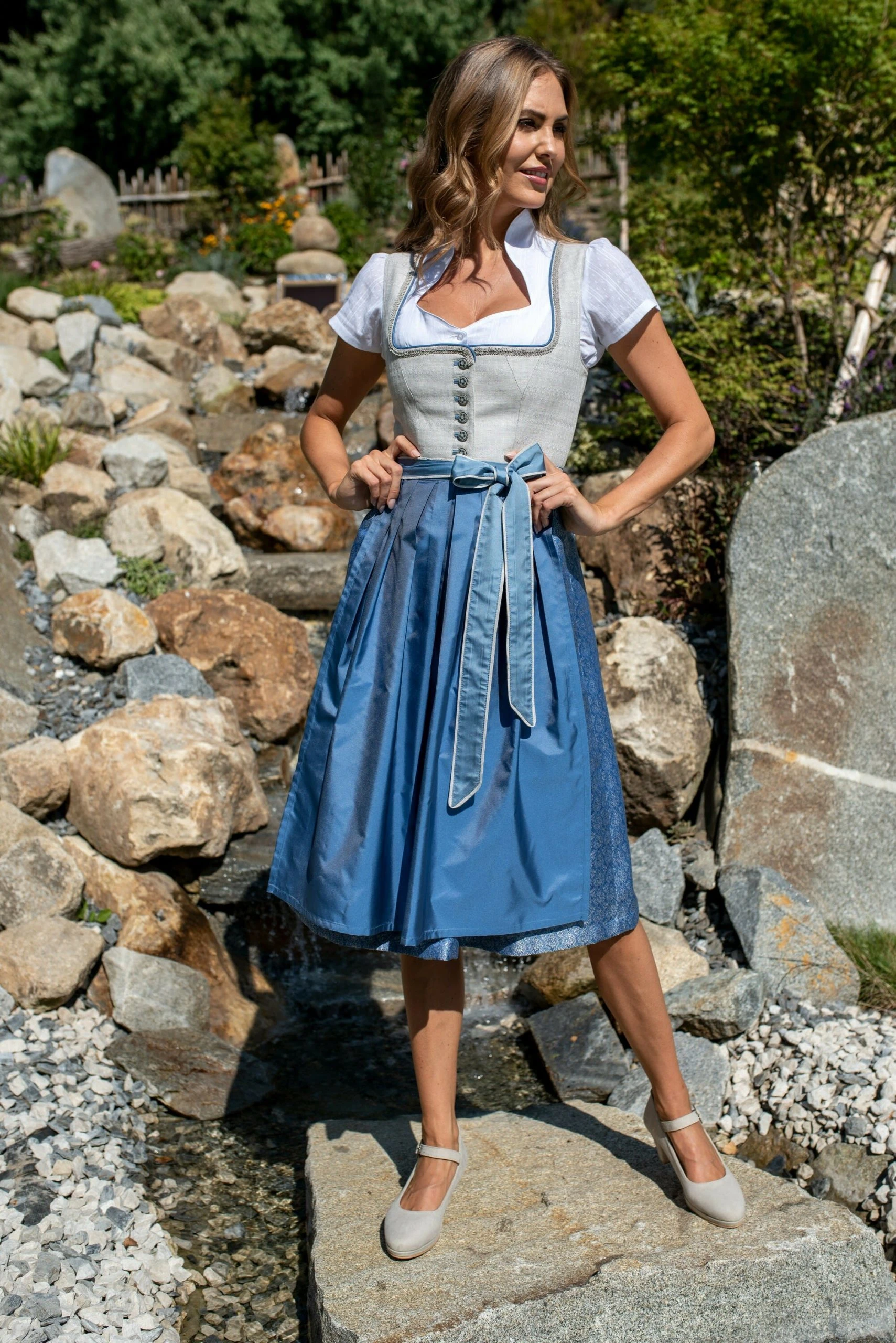 Dirndl Marla von Heimatgwand in blau. Das Modell bezaubert durch den strukturierten Leinenstoff im Mieder und prägt den sommerlichen Look. Das feminine Dekolleté wird durch den figurbetonten Münchner Schnitt ein echter Blickfang. Zierborten am Ausschnitt sowie die mit Blumen verzierten Trachtenknöpfe zeigen die Liebe zum Detail. Das zweifarbige Schürzenband wirkt besonders elegant zur schlichten Dirndlschürze. Der farblich abgesetzte Jacquardstoff im Rock ist ein besonderes Highlight. Ein hinreißendes Lieblingsteil für viele Anlässe. Unser Model trägt die Dirndlbluse B-5070 in weiß.