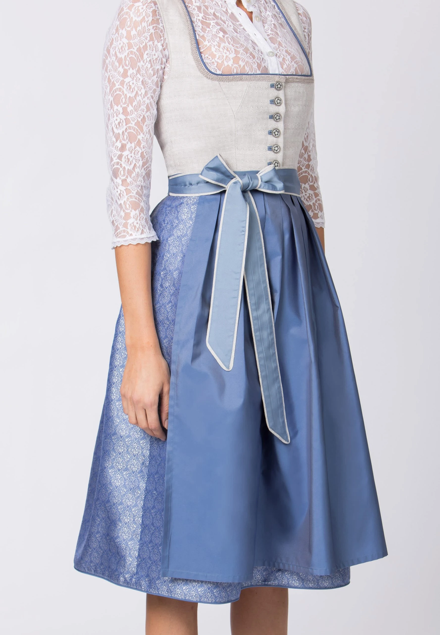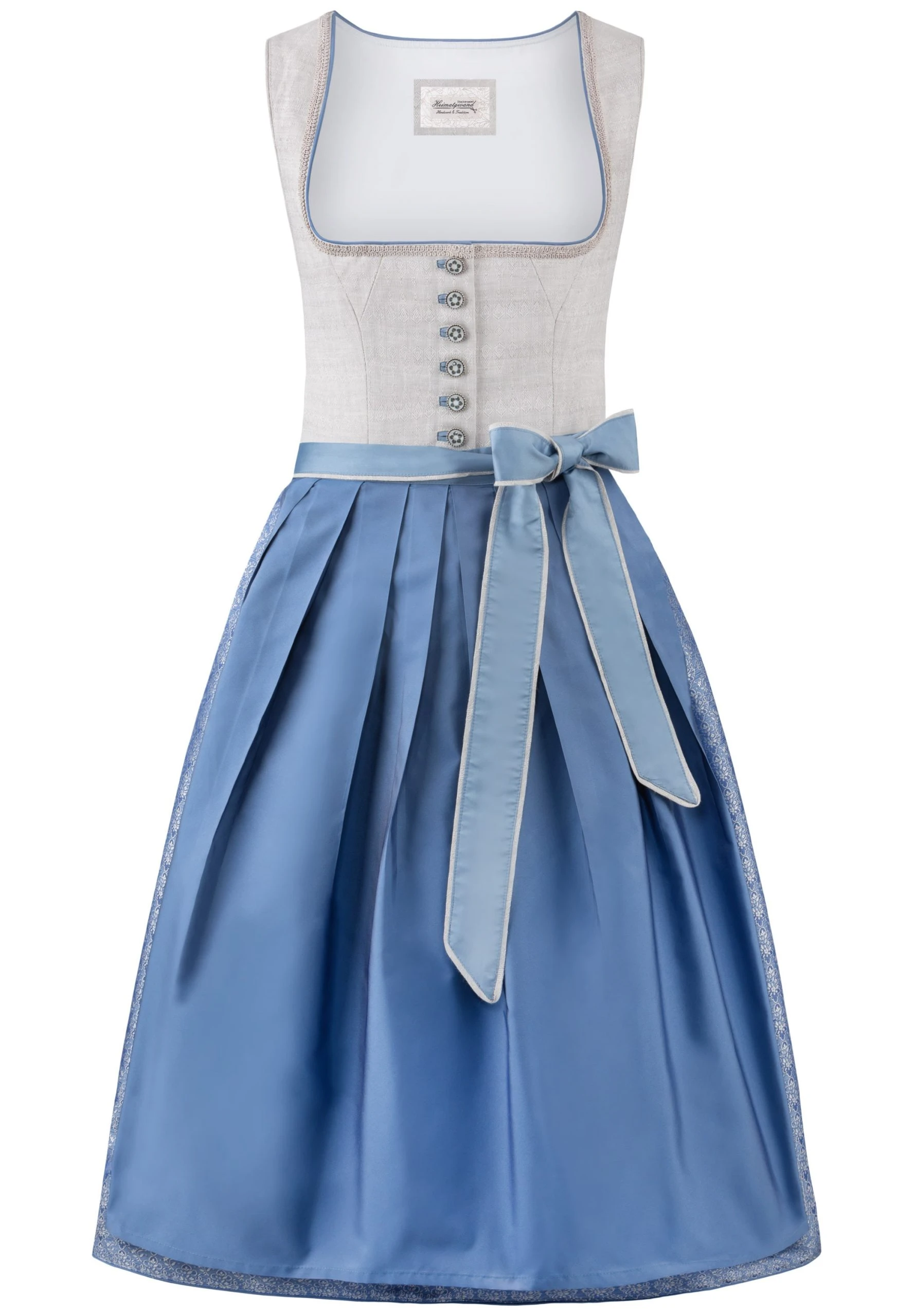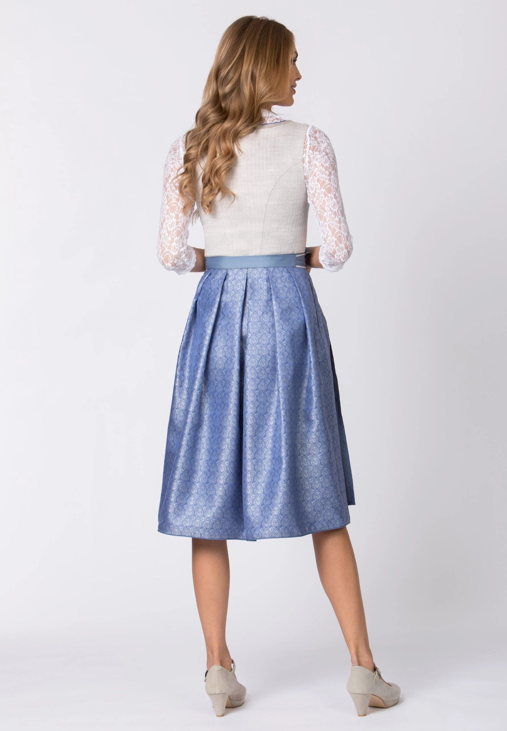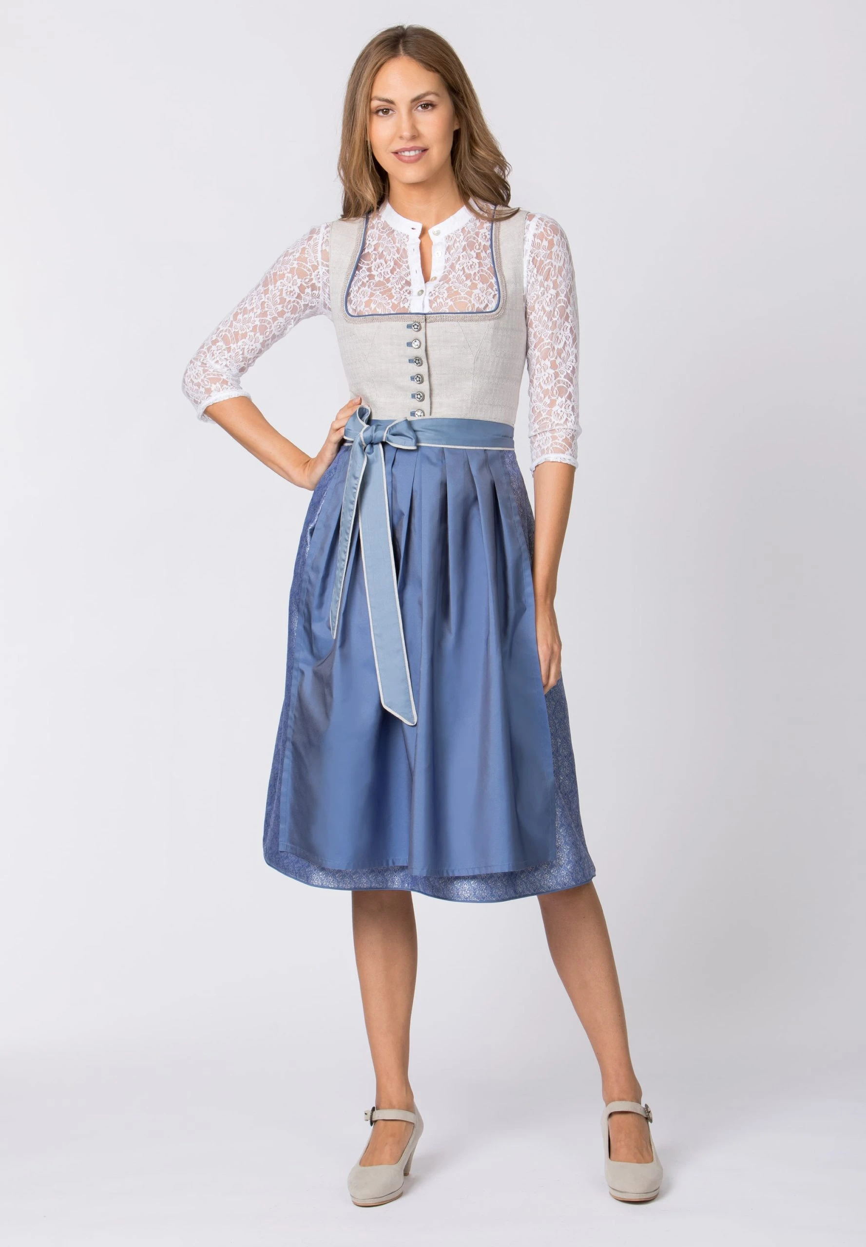 Dirndl Marla von Heimatgwand in blau. Das Modell bezaubert durch den strukturierten Leinenstoff im Mieder und prägt den sommerlichen Look. Das feminine Dekolleté wird durch den figurbetonten Münchner Schnitt ein echter Blickfang. Zierborten am Ausschnitt sowie die mit Blumen verzierten Trachtenknöpfe zeigen die Liebe zum Detail. Das zweifarbige Schürzenband wirkt besonders elegant zur schlichten Dirndlschürze. Der farblich abgesetzte Jacquardstoff im Rock ist ein besonderes Highlight. Ein hinreißendes Lieblingsteil für viele Anlässe. Unser Model trägt die Dirndlbluse B-5070 in weiß.