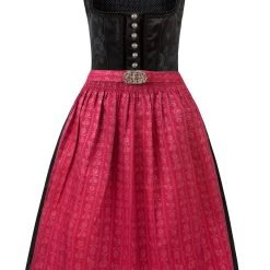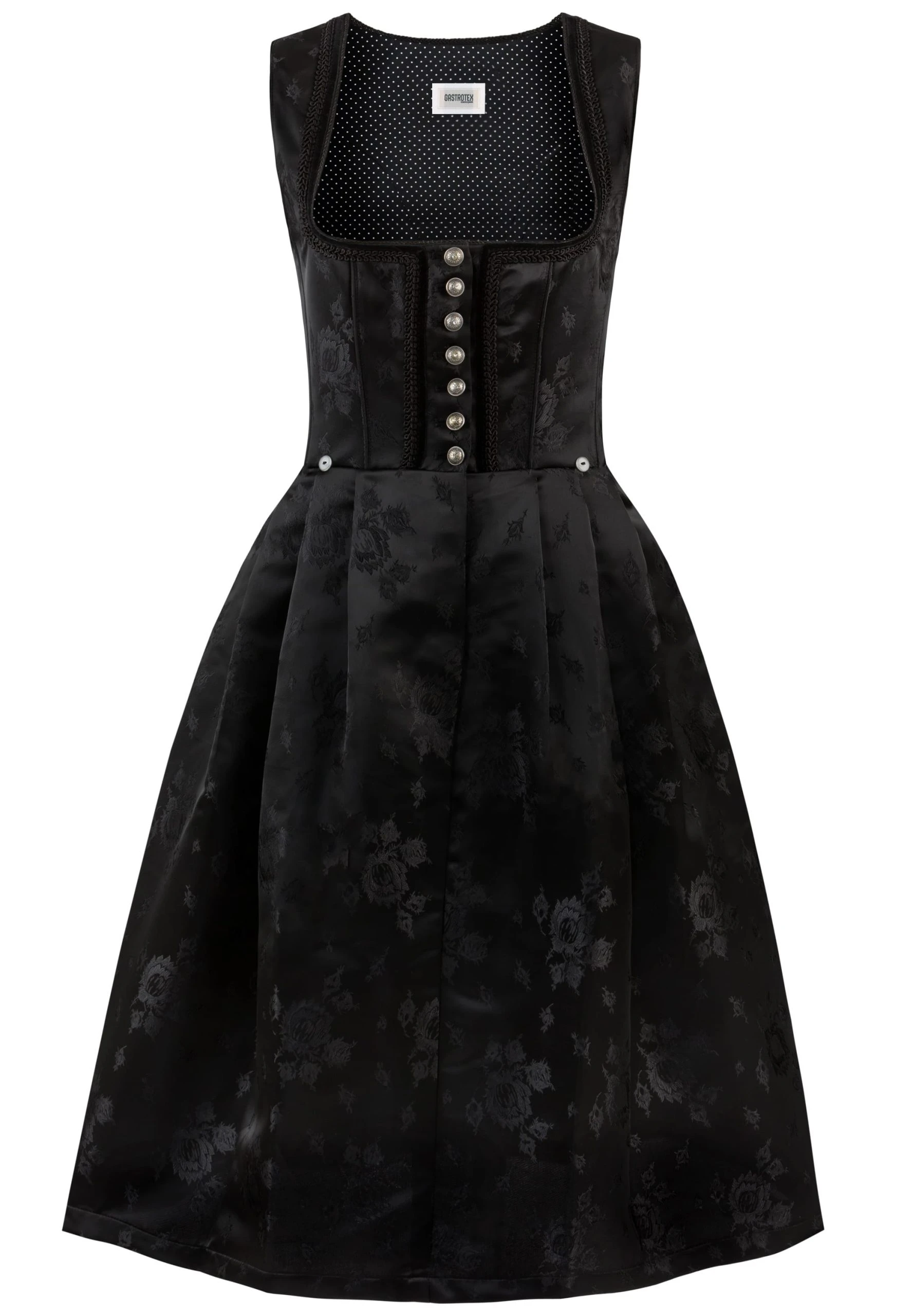 Dirndl Odette ohne Schürze für Damen von Heimatgwand in schwarz. Das klassische Dirndl aus hochwertigem Allover Jacquard besticht mit vielen liebevollen Details. Der traditionelle Rundausschnitt und ist mit trachtigen Zierborten veredelt. Die typischen Trachtenknöpfe am Mieder sind das Markenzeichen dieses Modells. Der Rock ist aus pflegeleichten Mechanik Stretch. Der ideale Kombipartner für alle modernen und traditionellen Schürzen. Dazu passen die Schürzenmodellen SC-300, Claire, Kristin, Molina und Corinna. Unser Model trägt die Bluse B-1015 in weiß. Bluse und Schürze sind nicht im Lieferumfang enthalten.