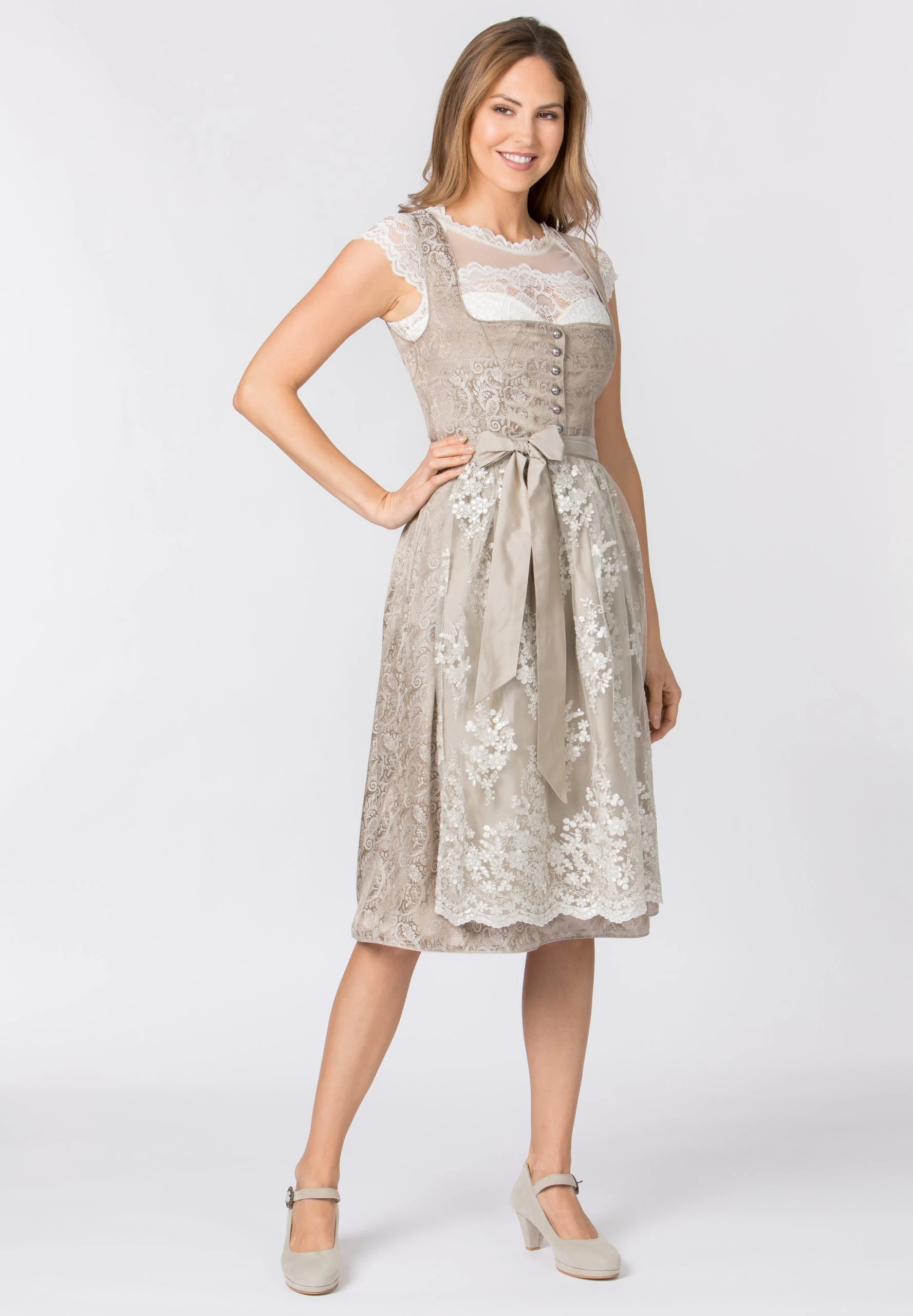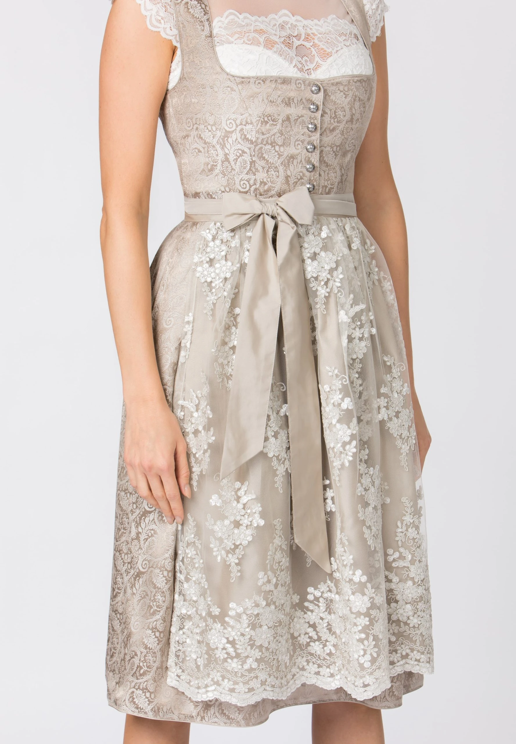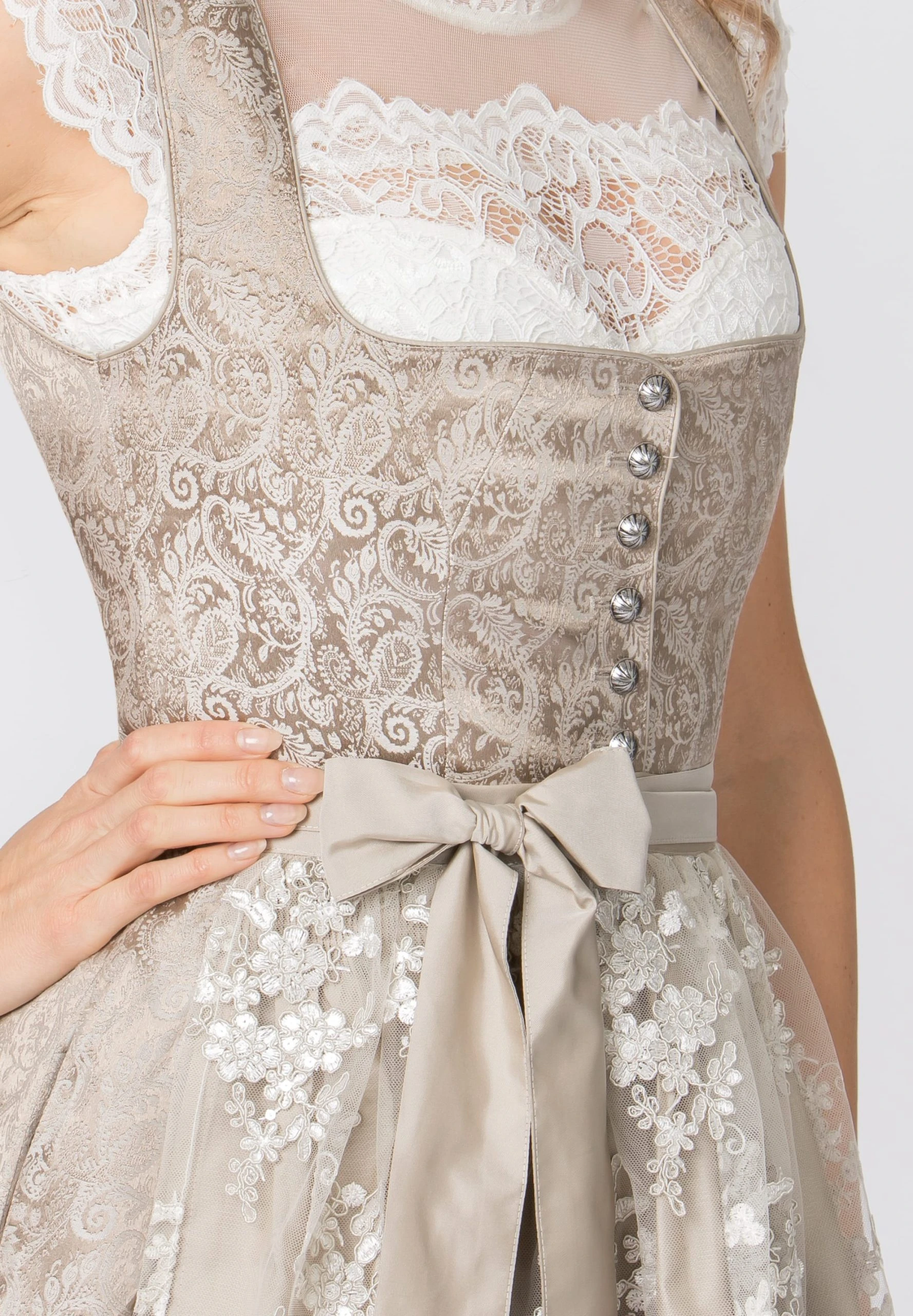 Dirndl Sidonia von Bergfeuer. Mit stilvollem trachtigen Paisley Muster versehen, verzaubert das edle Dirndl mit zahlreichen liebevollen Details. Das Mieder mit einem Münchener Schnitt überzeugt durch schlichte Eleganz und zaubert ein schönes Dekolleté. Die exklusiven Knöpfe verfeinern das gesamte Erscheinungsbild. Der in Falten gelegte und elegant fallende Rock wird durch die farblich abgestimmte Spitzenschürze perfekt abgerundet.