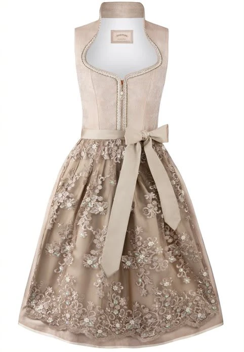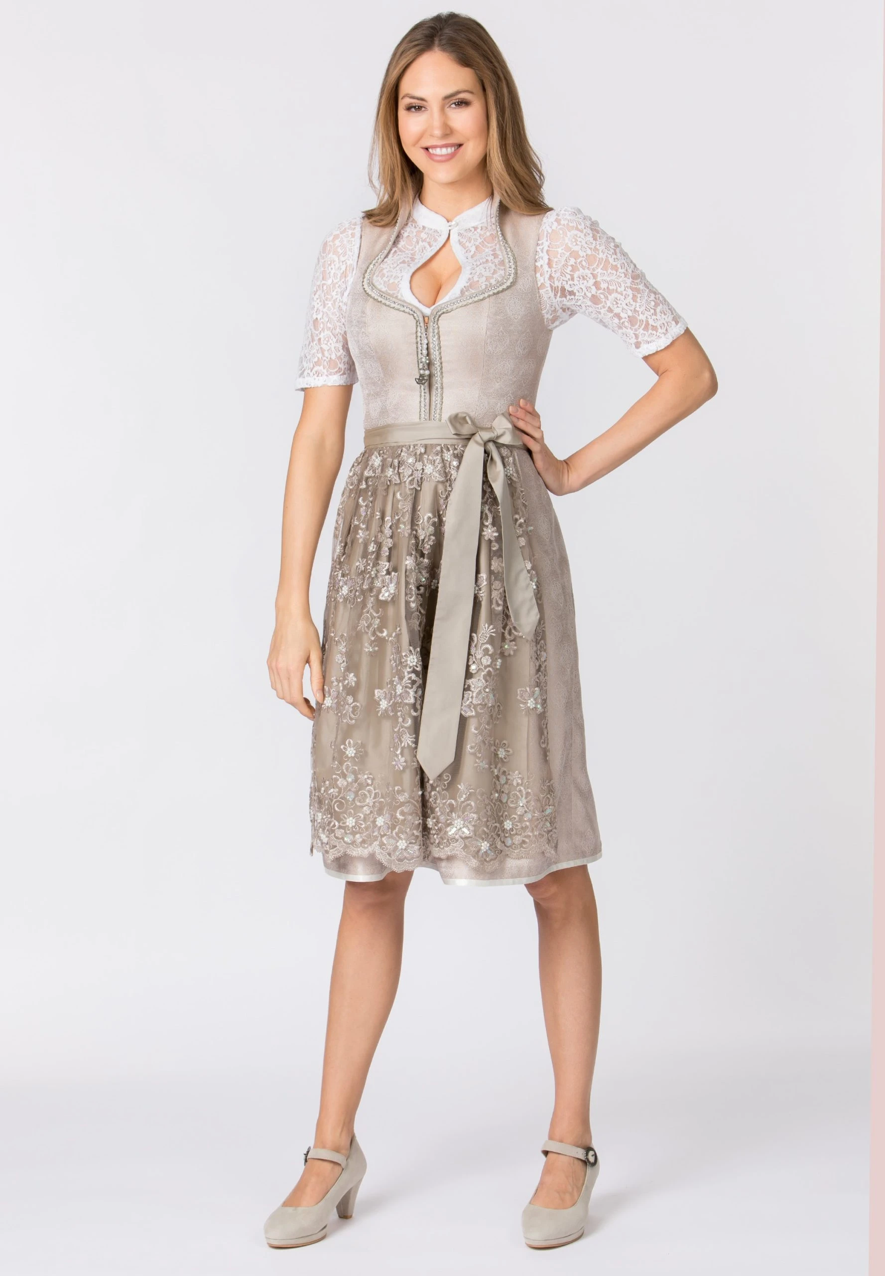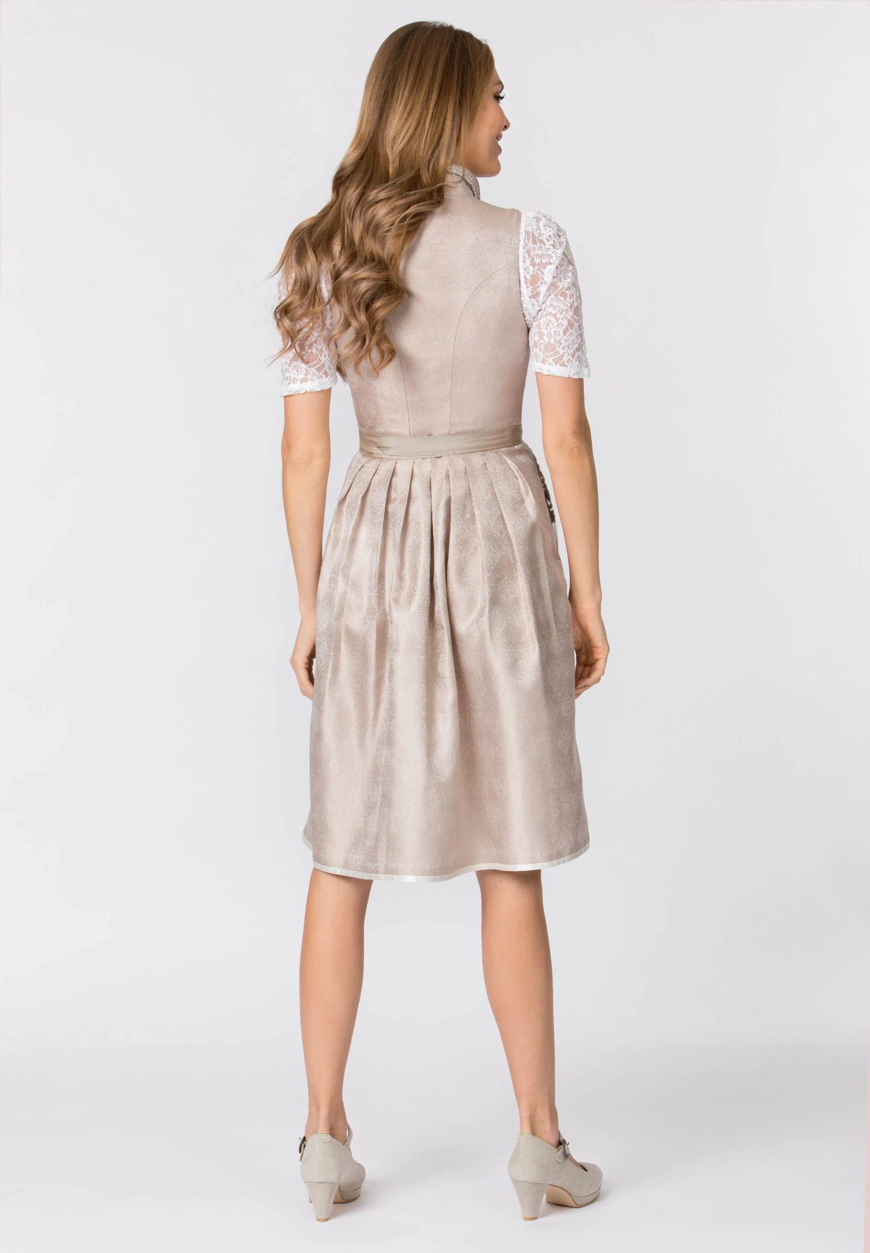 Dirndl Adriene von Bergfeuer in taupe. Das stilvolle Dirndl begeistert durch das exklusive Jacquard Muster und ist mit liebevollen Details versehen. Das Mieder ist mit einem Schalkragen versehen, der mit einer hochwertigen Borte verziert ist und ein sehr schönes Dekolleté schafft. Der Reißverschluss ist mit einem Swarovski Anhänger liebevoll inszeniert und rundet das edle Dirndl gekonnt ab. Durch die filigrane, farblich abgestimmte und unterlegte Spitzenschürze entsteht der besondere Look. Unser Model trägt die dazu passende Bluse B-5070 in der Farbe weiß.