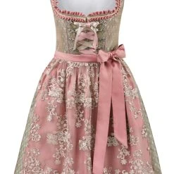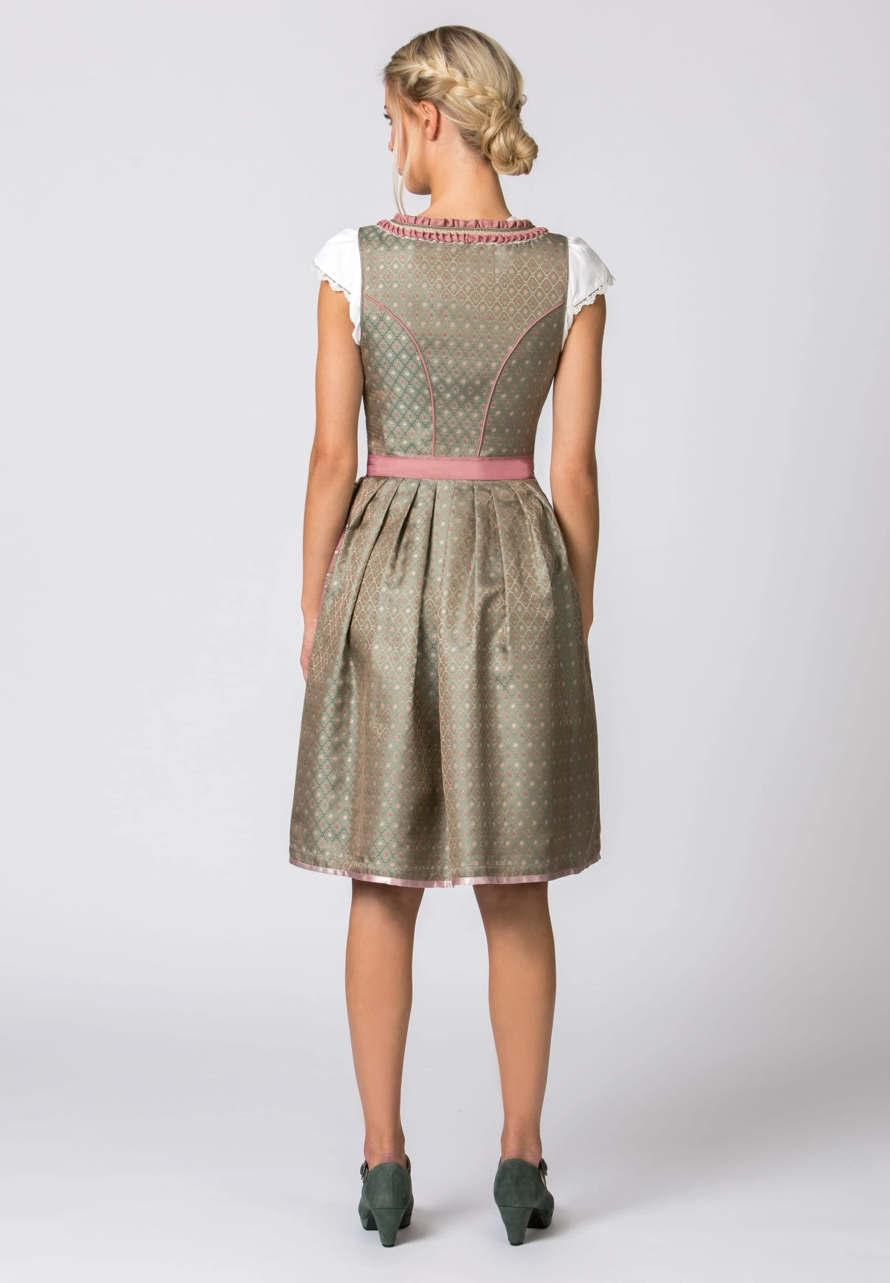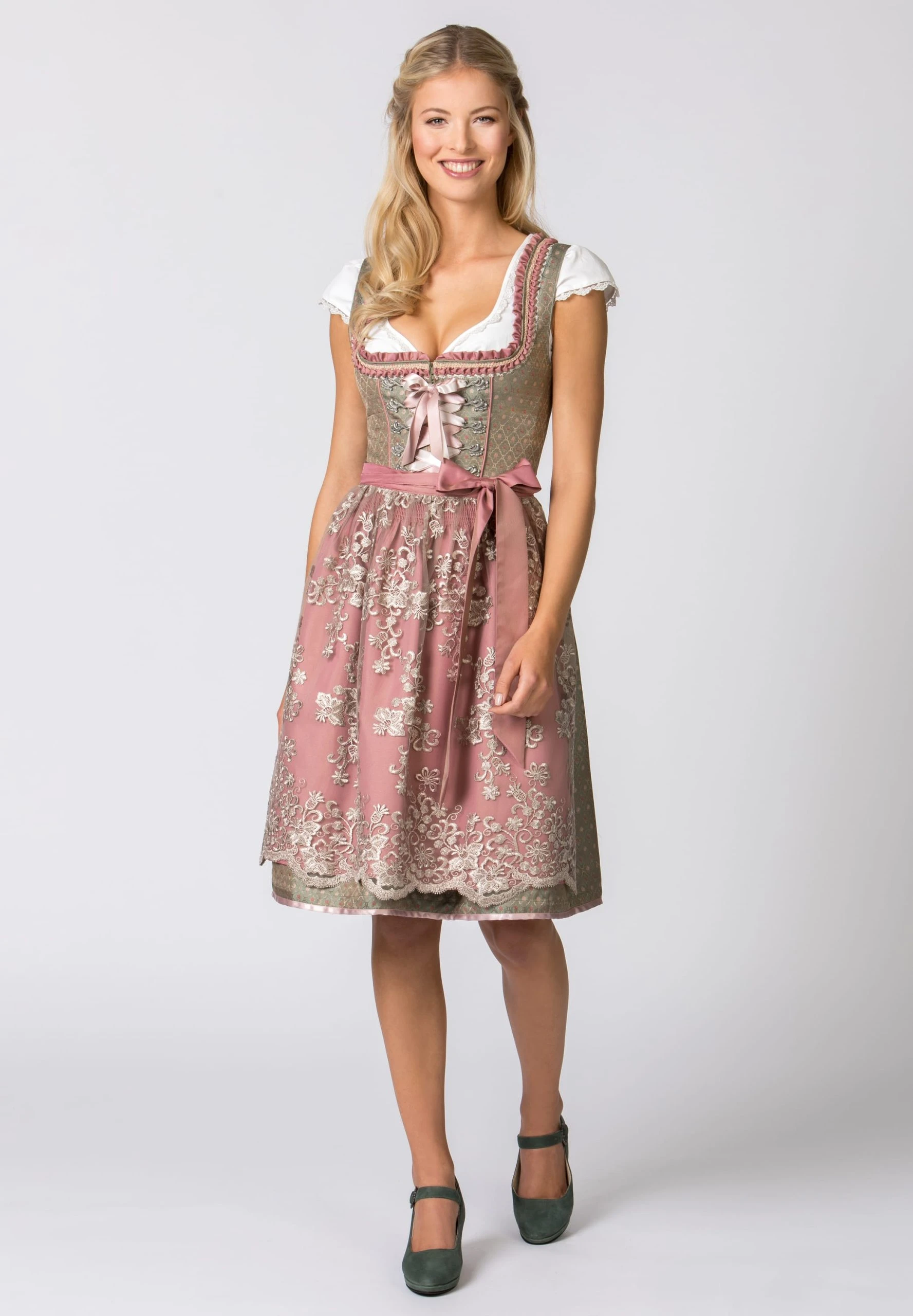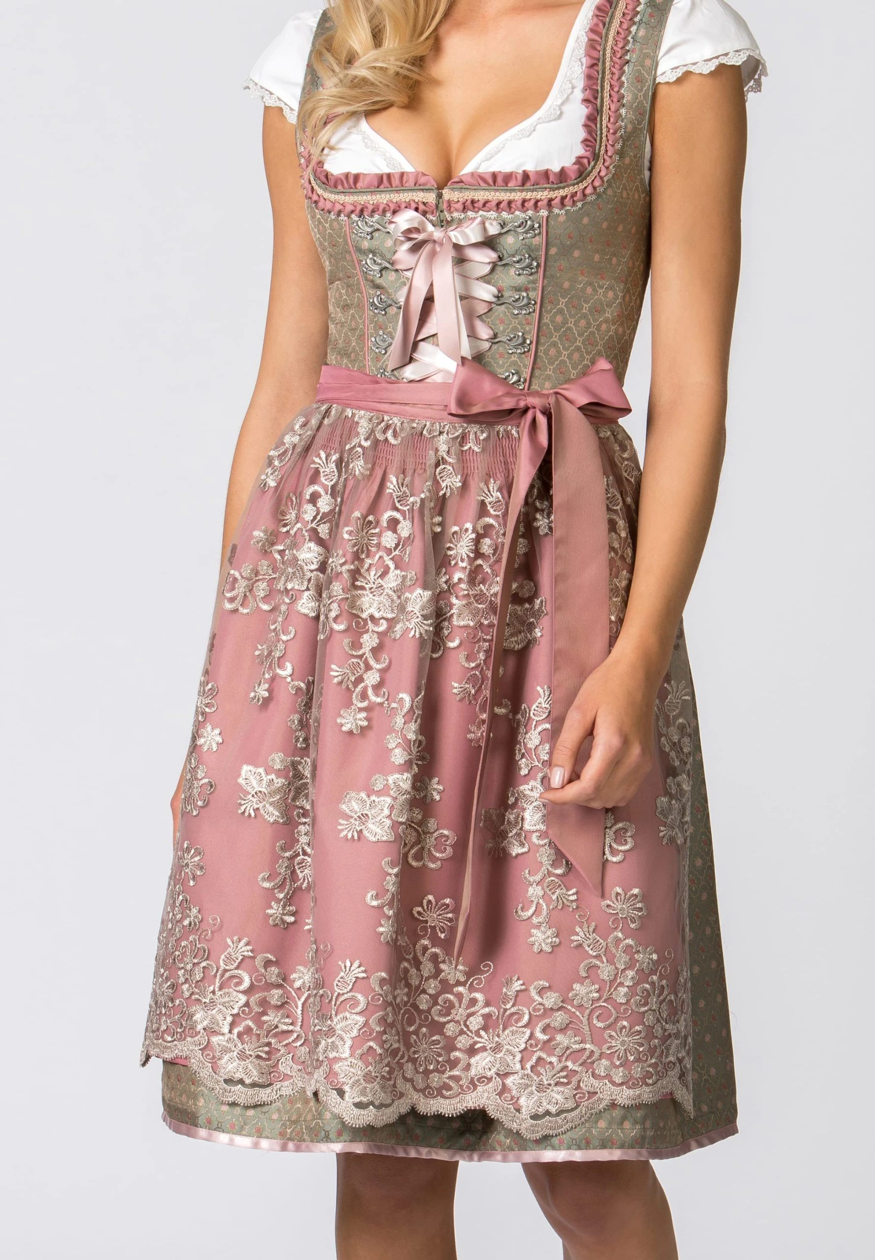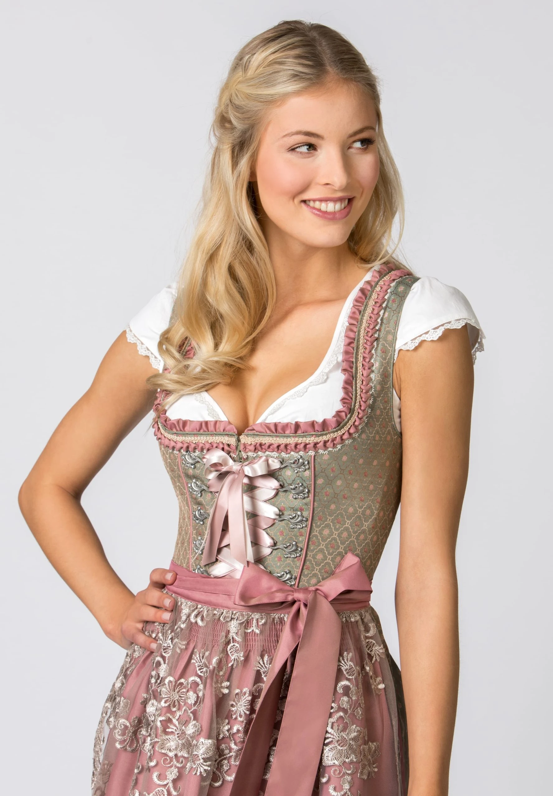 Dirndl Alice von Bergfeuer in schilf-rose. Das edle Modell ist aus einem hochwertigen, trendigen Stoff mit Ornamentmuster in Seidenoptik gefertigt. Der traditionelle Schnitt macht dieses ausgefallene Dirndl zu deinem Lieblingsstück. Die harmonisch abgestimmten Rüschen am Ausschnitt und die aufgenähten Zierborten sorgen für das exklusive Design. Das kontrastfarbige Schürzenband spiegelt sich in den Farben wieder und prägen den unverwechselbaren Stil. Unser Model trägt die dazu passende Bluse B-3033 weiß.