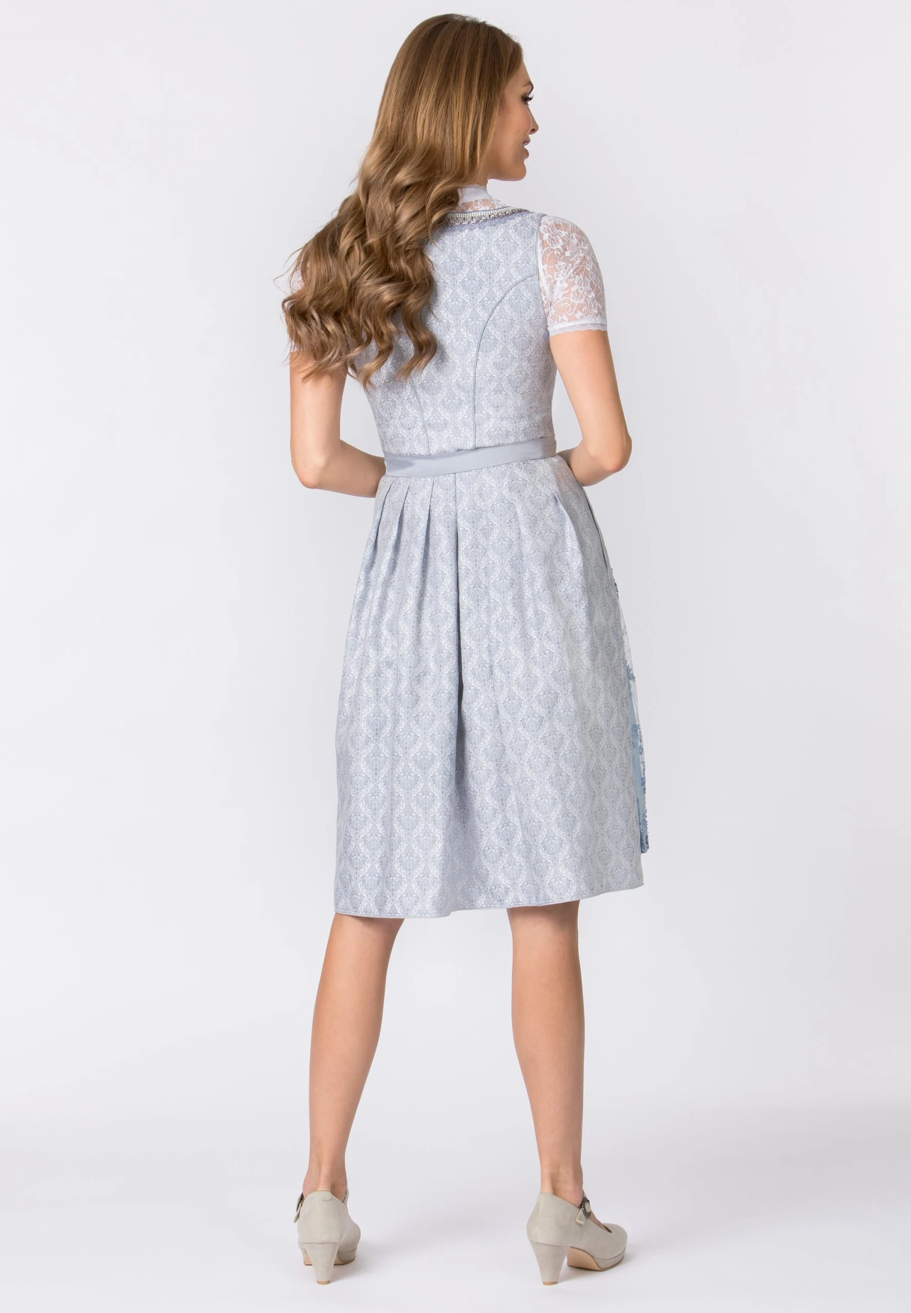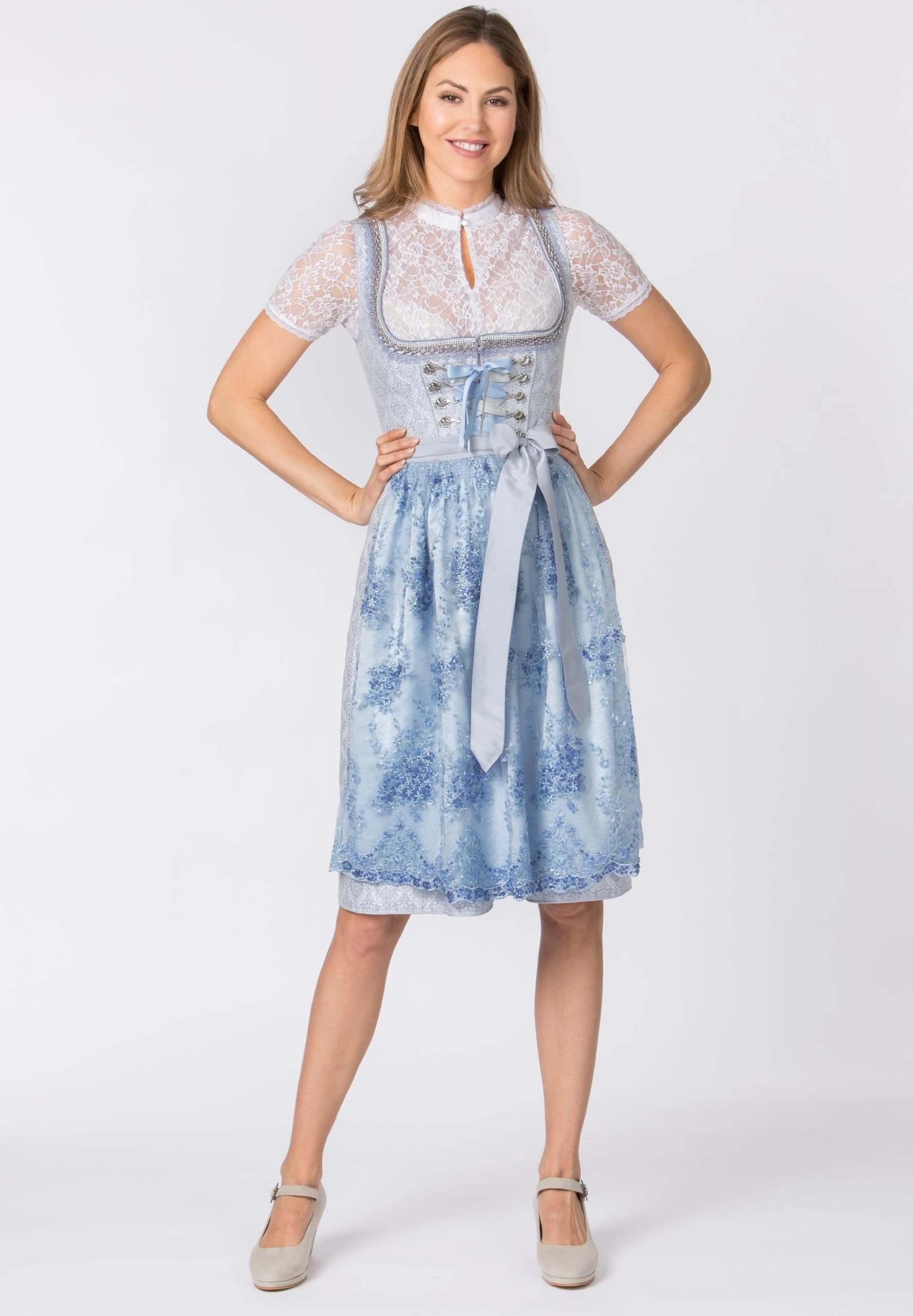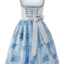 Dirndl Annabelle für Damen von Bergfeuer in hellblau. Das exklusive, trendfarbige Dirndl aus elegantem Jacquard besticht durch das aufwendig verarbeitete Dekolleté. Die von Hand bestickte Spitzenschürze ist hochwertig verarbeitet und liebevoll verziert. Der Rock ist stilvoll in Falten gelegt und mit einer Schubtasche versehen. Das kontrastfarbige Schürzenband spiegelt sich in den Farben wider. Unser Model trägt die dazu passende Bluse B-5077 der Farbe weiß.