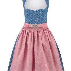Dirndl Coraline von Heimatgwand in blau-altrosa. Das Modell besticht durch den trachtigen, gemusterten Baumwolldruck. Das Schalkragen Dirndl wird durch hochwertige Knöpfe in altsilber verziert. Klassische Akzente setzt die geschmackvolle Schürze mit erlesener Metallschließe. Ein Klassiker für die traditionelle Dirndl Liebhaberin. Unser Model trägt die Dirndlbluse B-8033 in weiß.