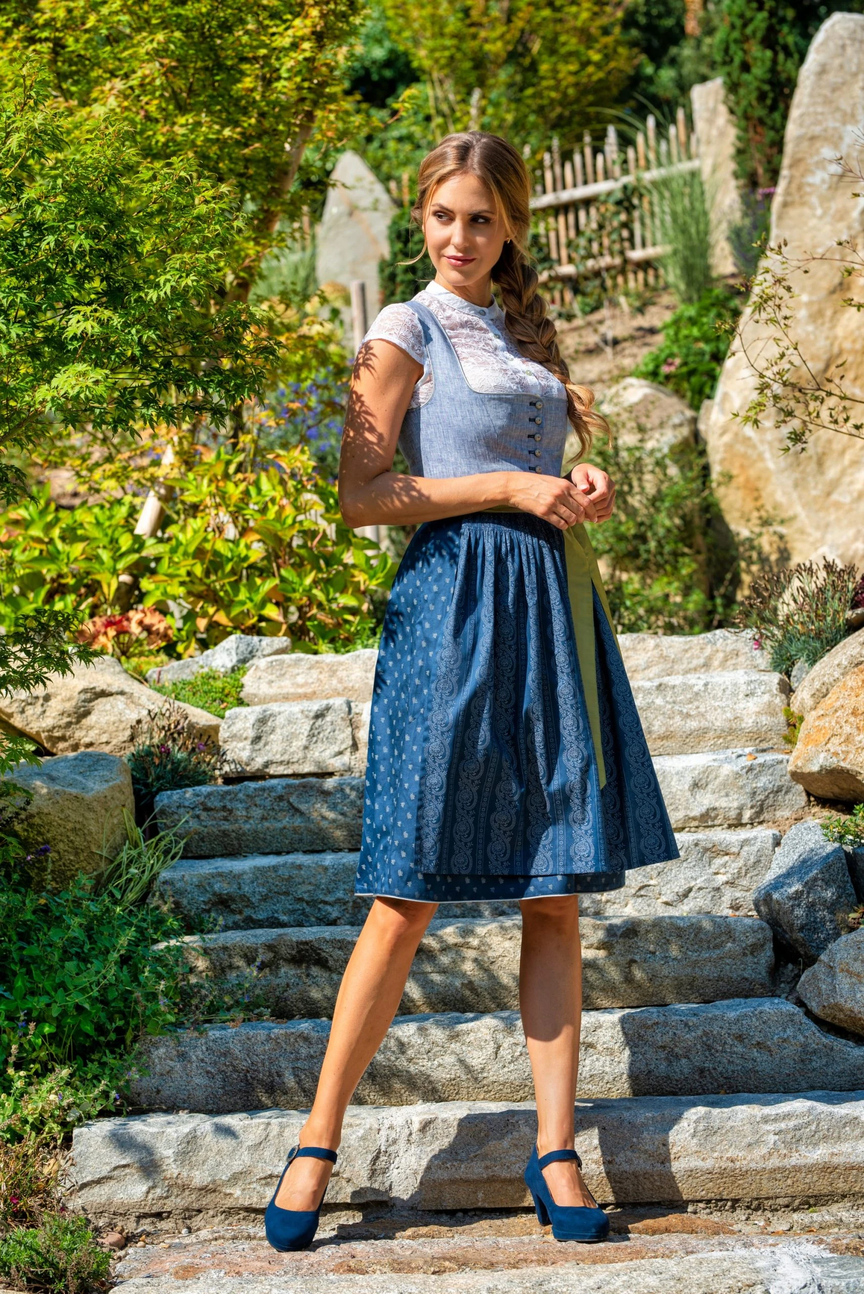 Dirndl Eleen von Heimatgwand in dunkelblau. Dieses Modell sorgt für einen gelungenen Auftritt. Das Mieder des sommerlichen Dirndls ist aus einem hochwertigen Stoff in Leinenoptik gefertigt. Der Münchner Schnitt passt perfekt zu diesem zeitlosen Dirndl. Die ausgefallenen Trachtenknöpfe unterstreichen den besonderen Trachten Look. Der pflegeleichte, bedruckte Rock aus Baumwolle und die farblich passende Schürze runden das traditionelle Modell gekonnt ab. Unser Model trägt die Dirndlbluse B-9010 in weiß.