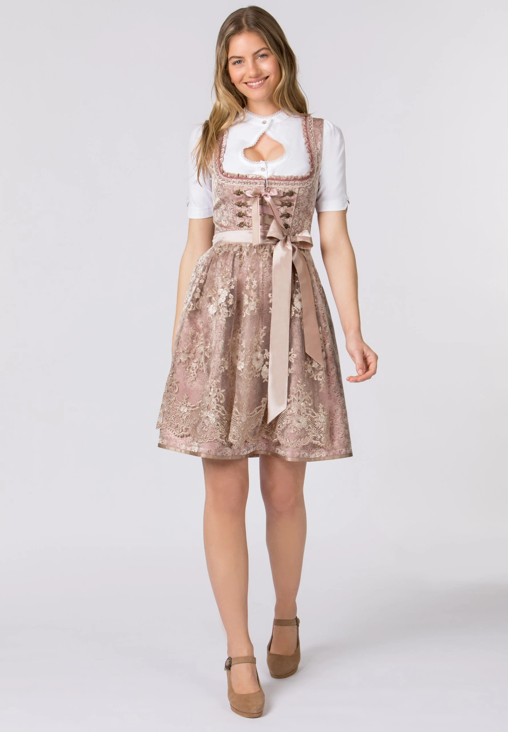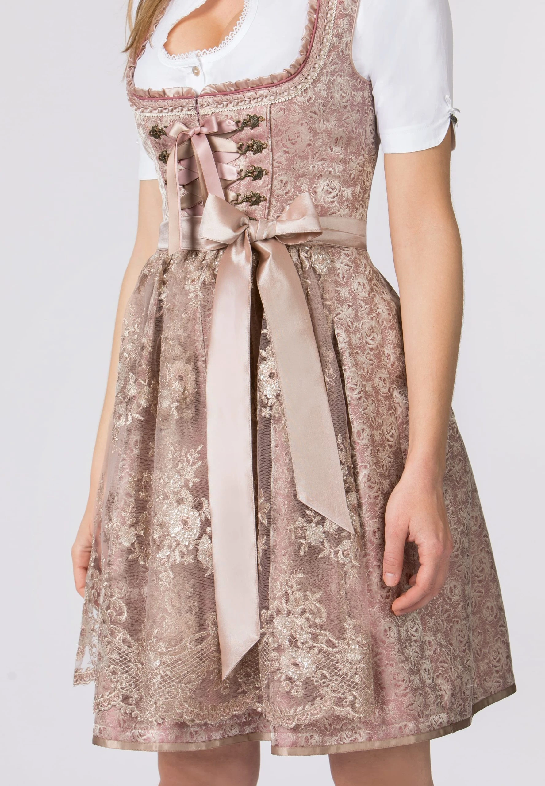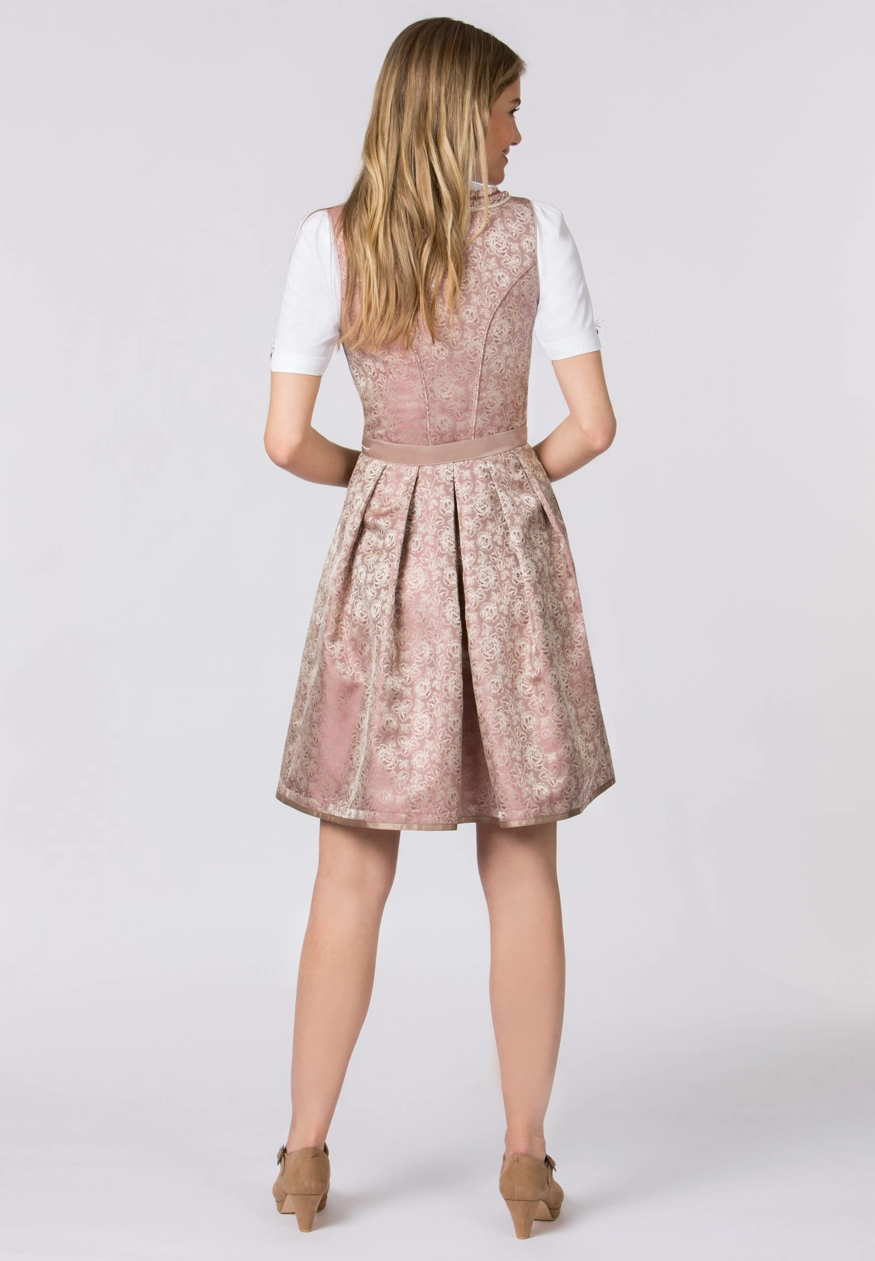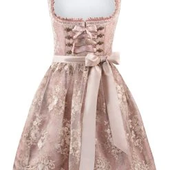 Dirndl Noelia mit Spitzenschürze für Damen von Wiesnwuid in altrosa. Das exclusive Dirndl begeistert durch das stilvolle Jacquard Muster und ist mit liebevollen Details versehen. Für die feminine Note sorgen die eingearbeiteten Rüschen am Dekolleté, die aufgenähten Zierborten sowie die verzierten Miederhaken. Die Schnürung mit den zwei verschieden farbigen Satinbändern unterstreicht den femininen Look. Durch die filigrane, farblich abgestimmte Spitzenschürze wird das Gesamtbild gekonnt abgerundet. Kombipartner: Dirndlbluse B-1045 in weiß.