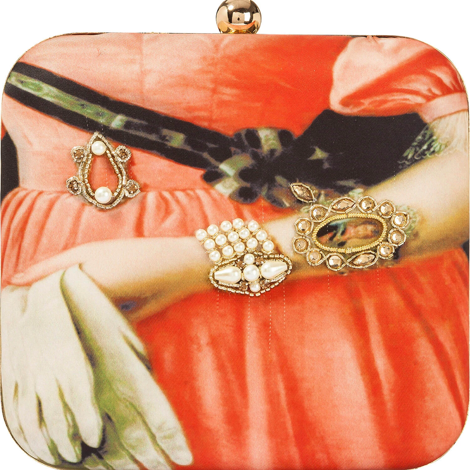 Aus Wiesnkönig’s Zinnober Kollektion: Diese Box Clutch bezogen mit Stoff garantiert einen großen Auftritt. Kombiniert zum Dirndl oder zur Abendgarderobe macht die Tasche richtig was her. Rückseite und Innenfutter aus Champagnerfarbener Wildseide mit Innentasche. Vorderseite ein Ausschnitt aus einem Gemälde reich verziert mit Perlen und Strasssteinen alle von Hand bestickt. Abnehmbarer Kettenschulterriemen mit eingeflochtenem Satinband. Goldfarbener Rahmen mit Kugelverschluss.