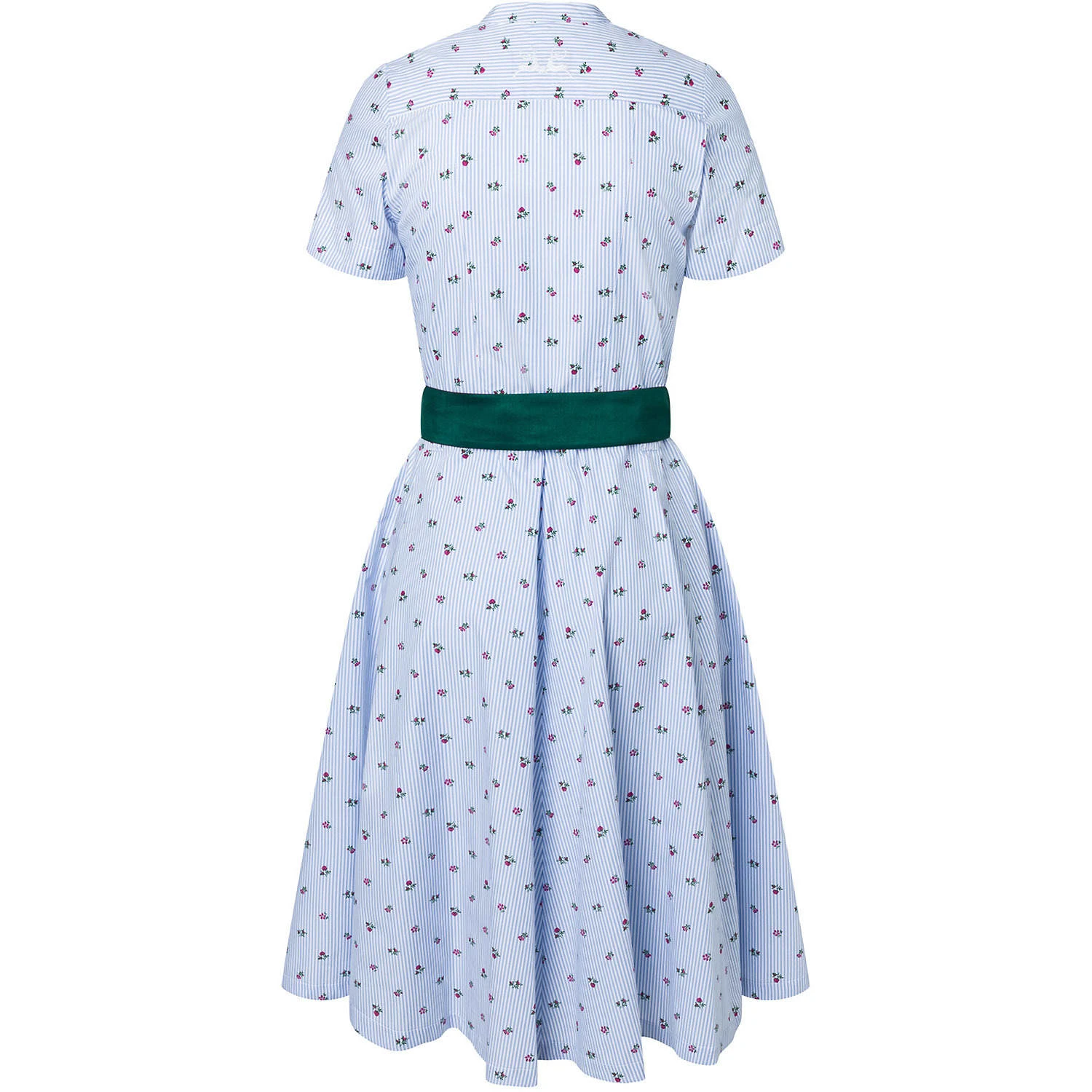 Vom einfachen Arbeitsg’wand der bäuerlichen Magd ist beim schicken Wiesnkönig-Dirndl Jalina aus reiner Baumwolle kaum noch etwas zu spüren. Großes ausdrucksstarkes Blüten-Allover, zarter Stehkragen mit hochschließender Knopfleiste und filigranen Metallknöpfen sowie der stylische Kontrastbesatz in Schwarz befördern dieses Dirndl in neue Trachtenmode-Sphären. Die edel schimmernde Schürze in intensivem Blau und der goldene Hirsch auf der Schleife vollenden das feminine Ensemble schließlich mit Bravour. Und ohne die Schürze wird das Dirndl zum klassisch schönen Sommerkleid.