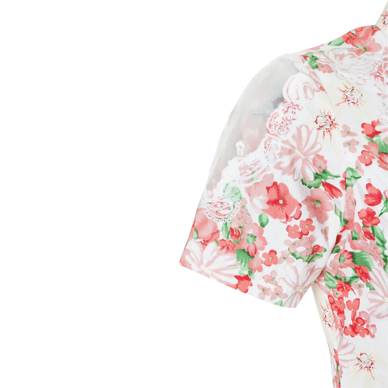 – Stickerei mit transparenten Einsätzen aus feinem Tüll am Dekolleté und am Oberärmel.