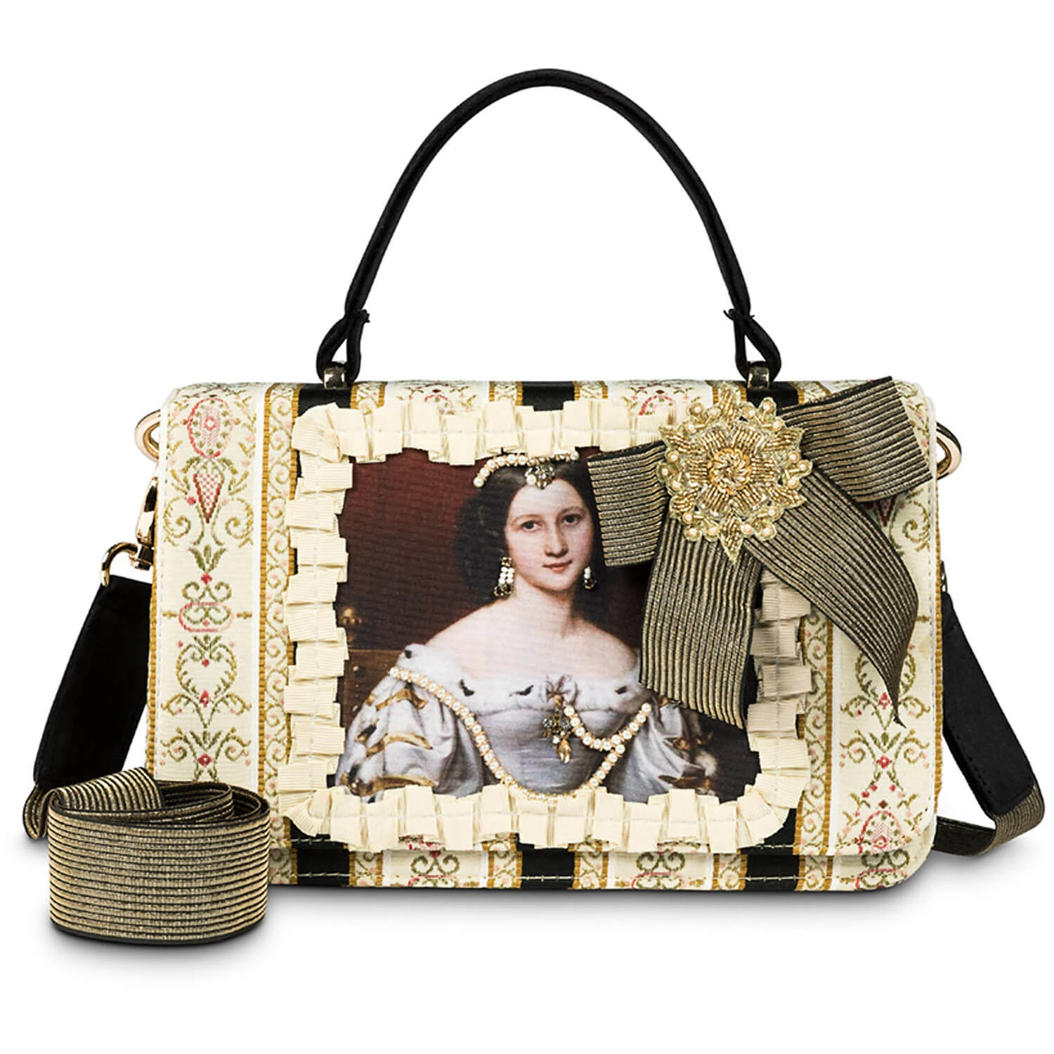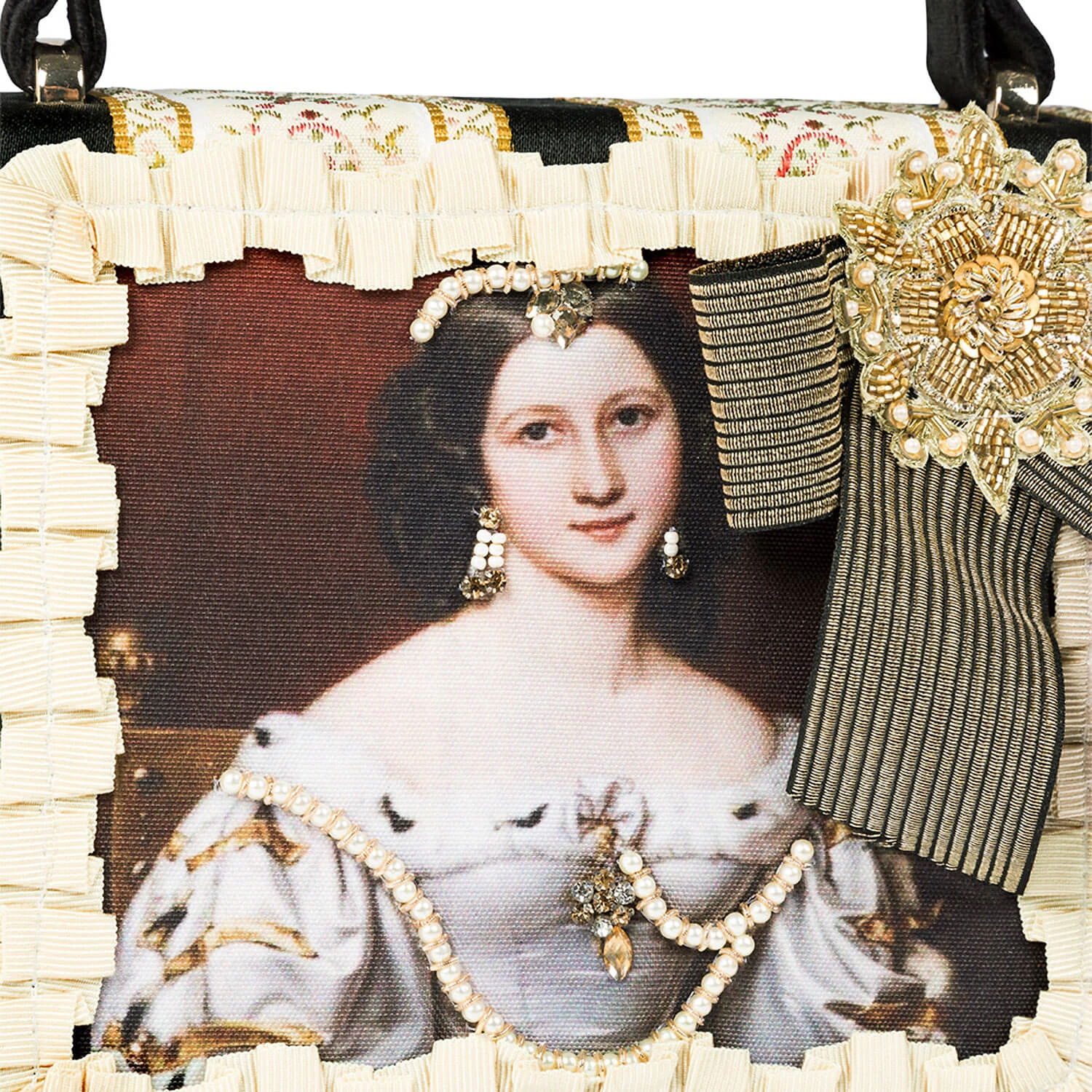 Wiesnkönig’s Schultertasche Charlotte aus creme schwarz gestreiftem Biedermeier Stoff mit schwarzem Henkel und abnehmbaren schwarz goldenen Schulterriemen. Das Bild gerahmt von einem cremefarbenen in Falten gelegten Ripsband zeigt Charlotte von Hagen, ebenfalls eine der Schönheiten aus Schloss Nymphenburg. Ihre Perlen sind von Hand angenäht. Eine große Schleife mit Strassblume, am linken oberen Bildrand, bilden einen schönen Abschluss.